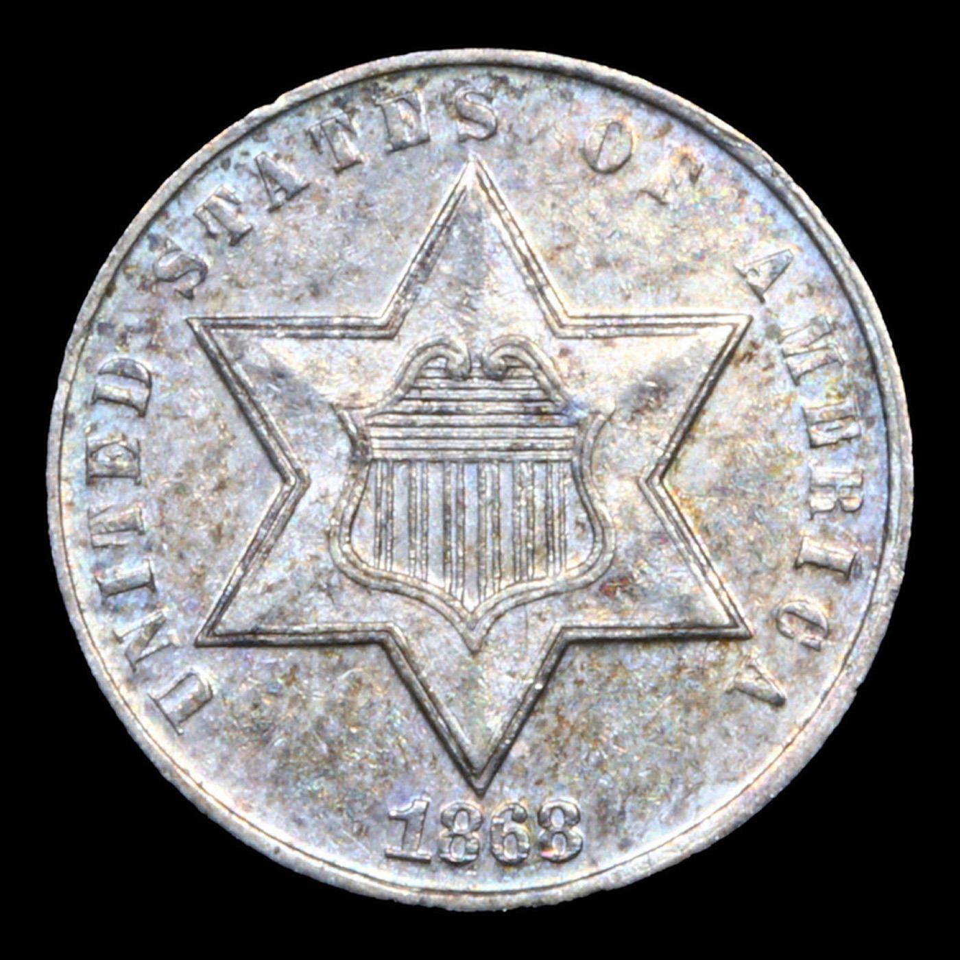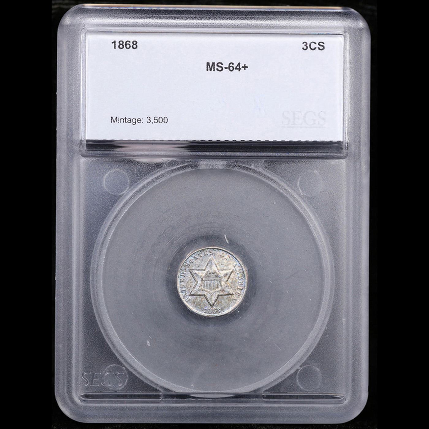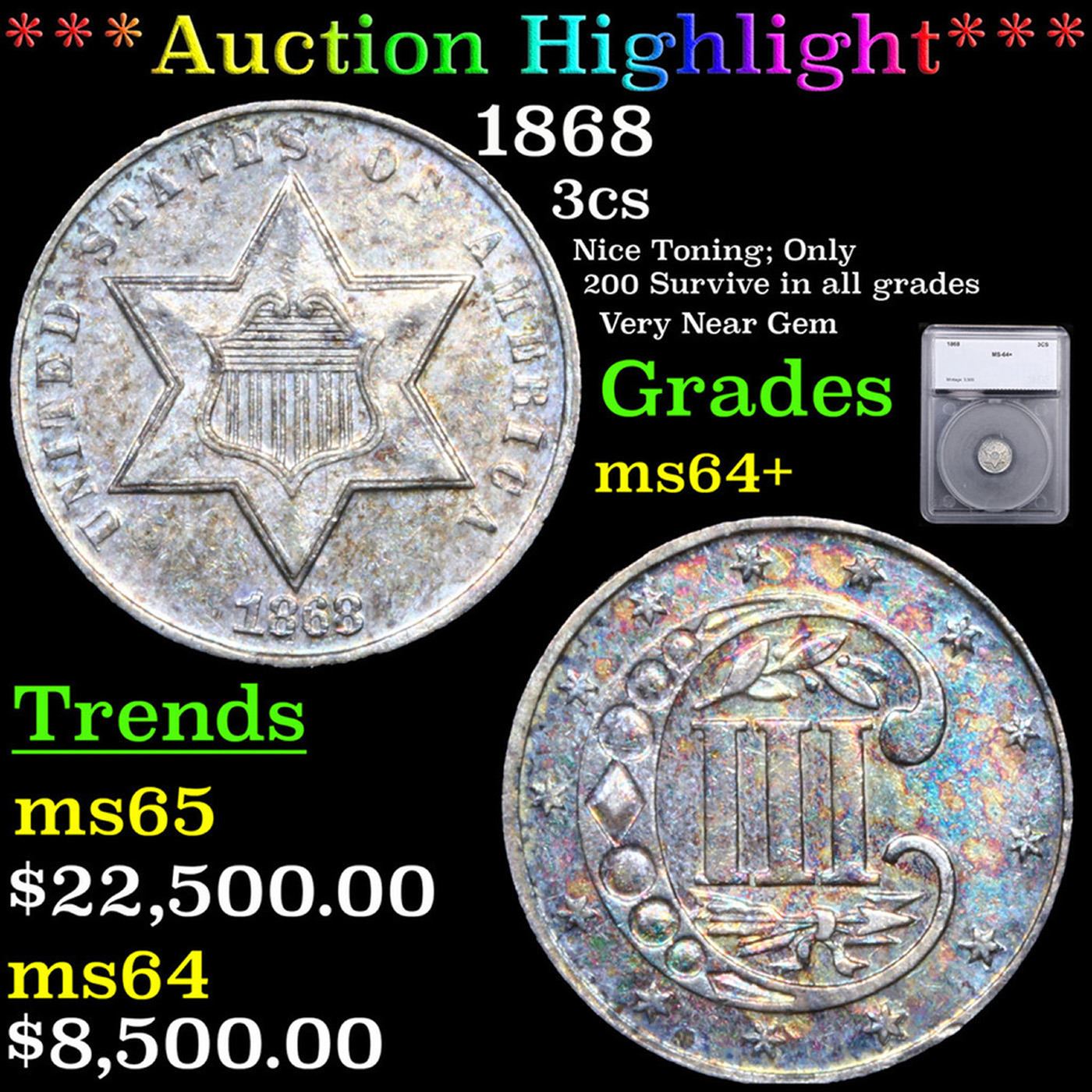 ***Auction Highlight*** 1868 Three Cent Silver 3cs Graded ms64+ By SEGS. A Corey's Pick, Bid to Win, Don't let it get Away, you might not find its equal Coin. I give this coin my highest recommendation