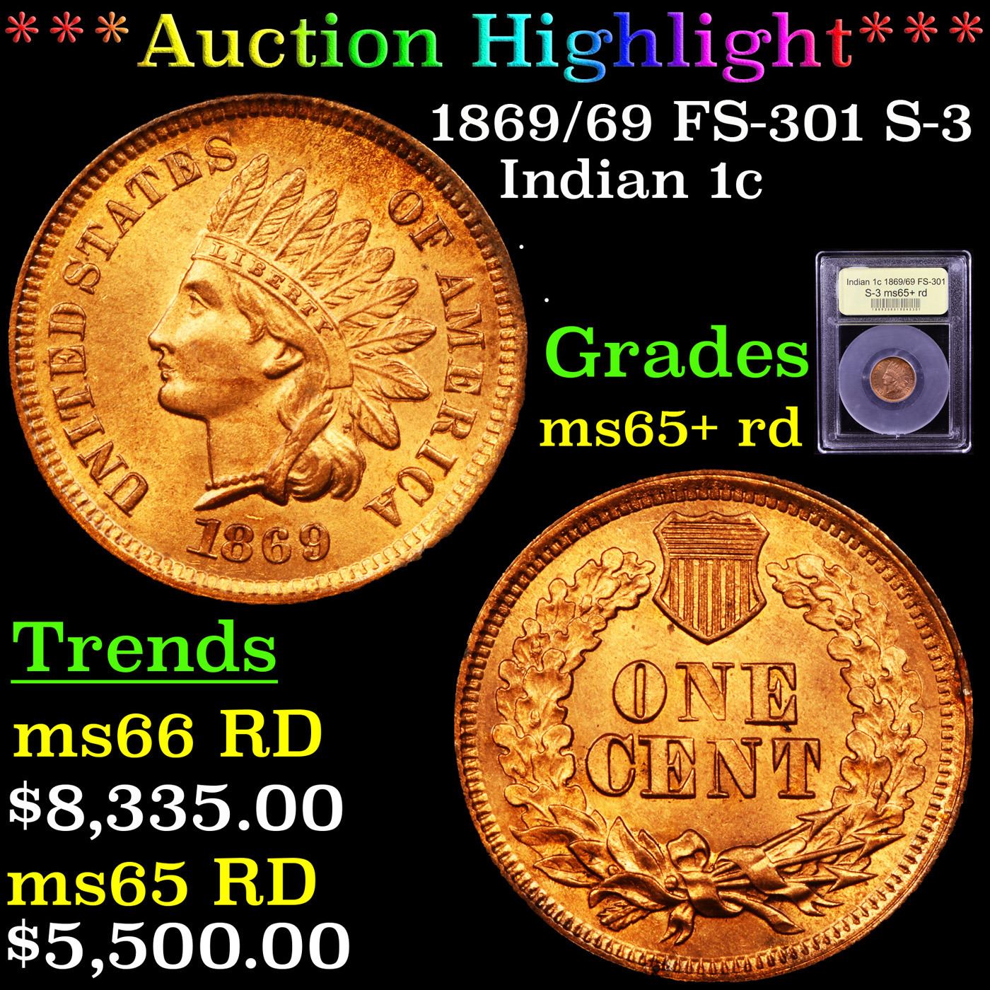 ***Auction Highlight*** 1869/69 FS-301 S-3 Indian Cent 1c Graded Gem+ Unc RD By USCG2nd Finest Known. Glorious deep orange surfaces are fully lustrous with a billowy satin to softly frosted texture from the dies. Sharply struck, carefully preserved, and a find for the advanced Indian cent enthusiast. One of the more challenging early date bronze Indian cents to locate in high grades, the 1869 is more elusive than the 1866, 1867 and 1868. This is an exceptional survivor from a mintage of 6,420,000 circulation strikes.