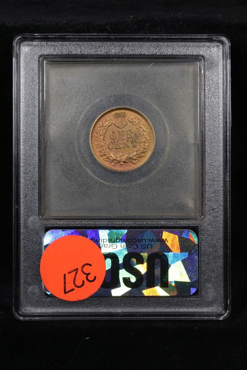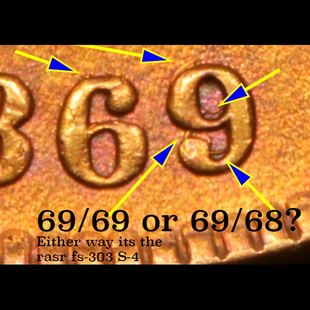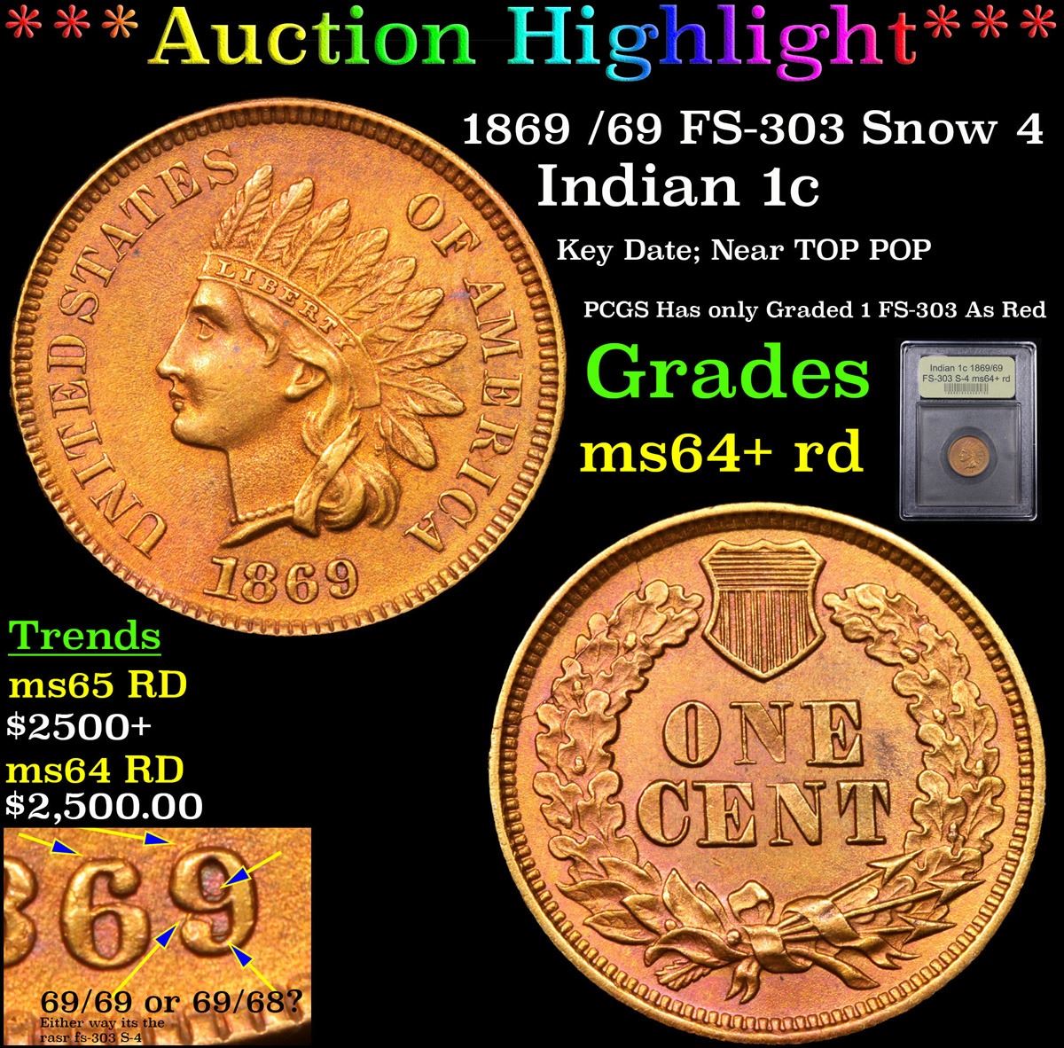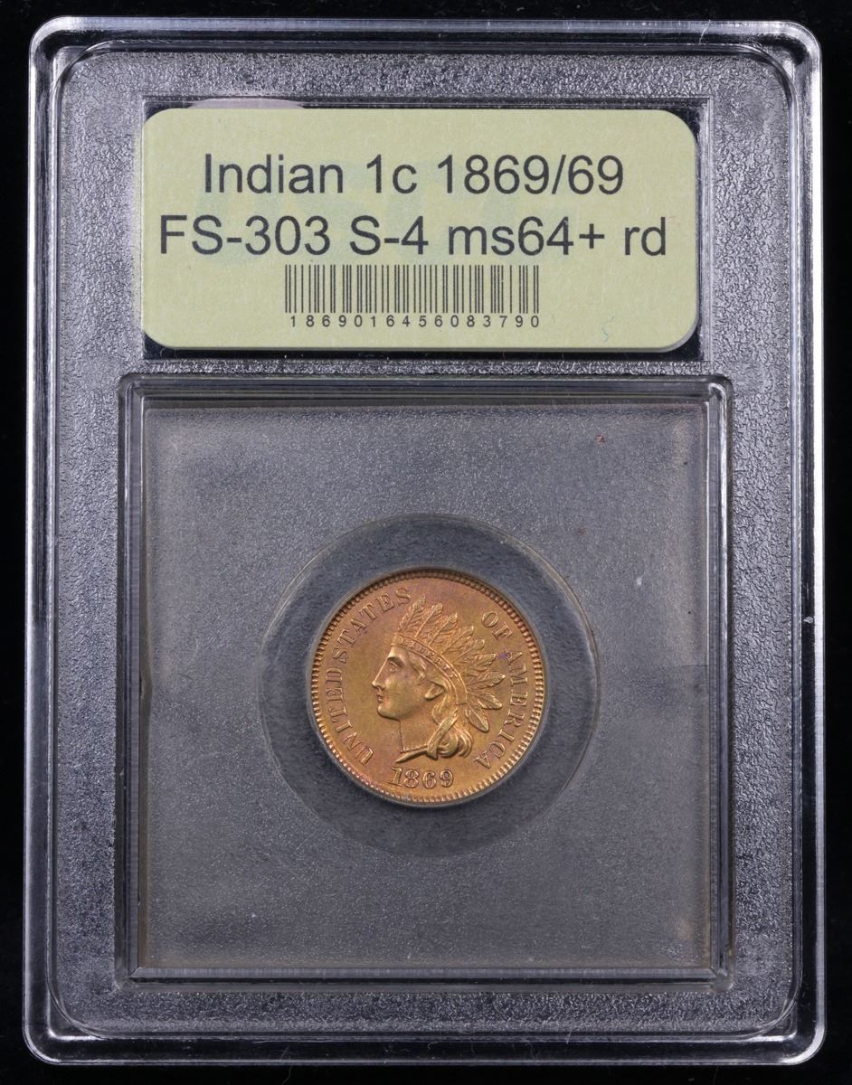 ***Auction Highlight*** 1869 /69 FS-303 Snow 4 Indian Cent 1c Graded Choice+ Unc RD By USCG. 0 Up for auction is the Ultra Rare 1869/69 S-4 fs-303. This is the Ultra Rare version of the 69/69 which shows a much stronger overdate, and the 9, almost looks like an 8, in fact several leading numismatists have argued that it is an 1869/68. From the closeup, I can see their point. In terms of rarity, the more common fs-301 69/69 has been certified by NGC 356 times, and the ultra rare fs-303 merely 37 times. This would make this the 38th known example! Super patina and great eye appeal. Making this the 2nd finest known, near TOP POP!