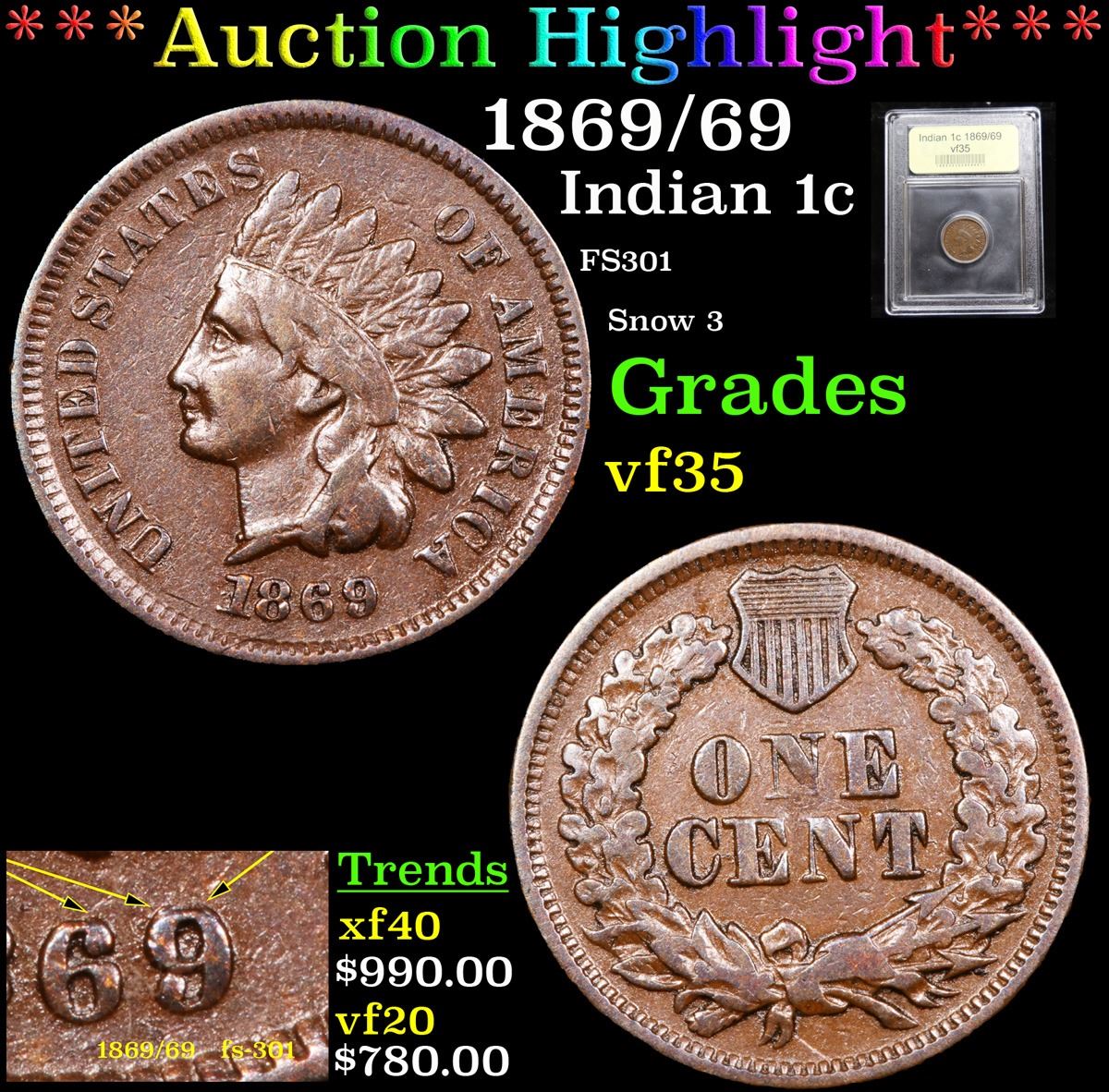 ***Auction Highlight*** 1869/69 FS301 Snow 3 Indian Cent 1c Graded vf++ By USCG. A Corey's Pick, Bid to Win, Don't let it get Away Coin