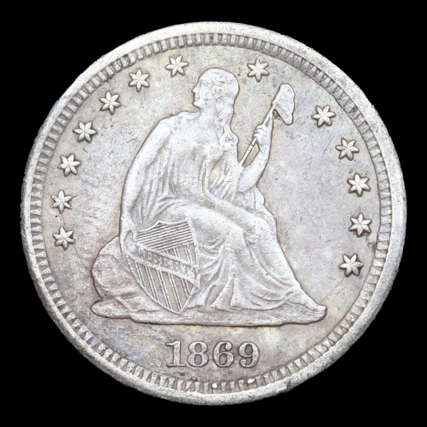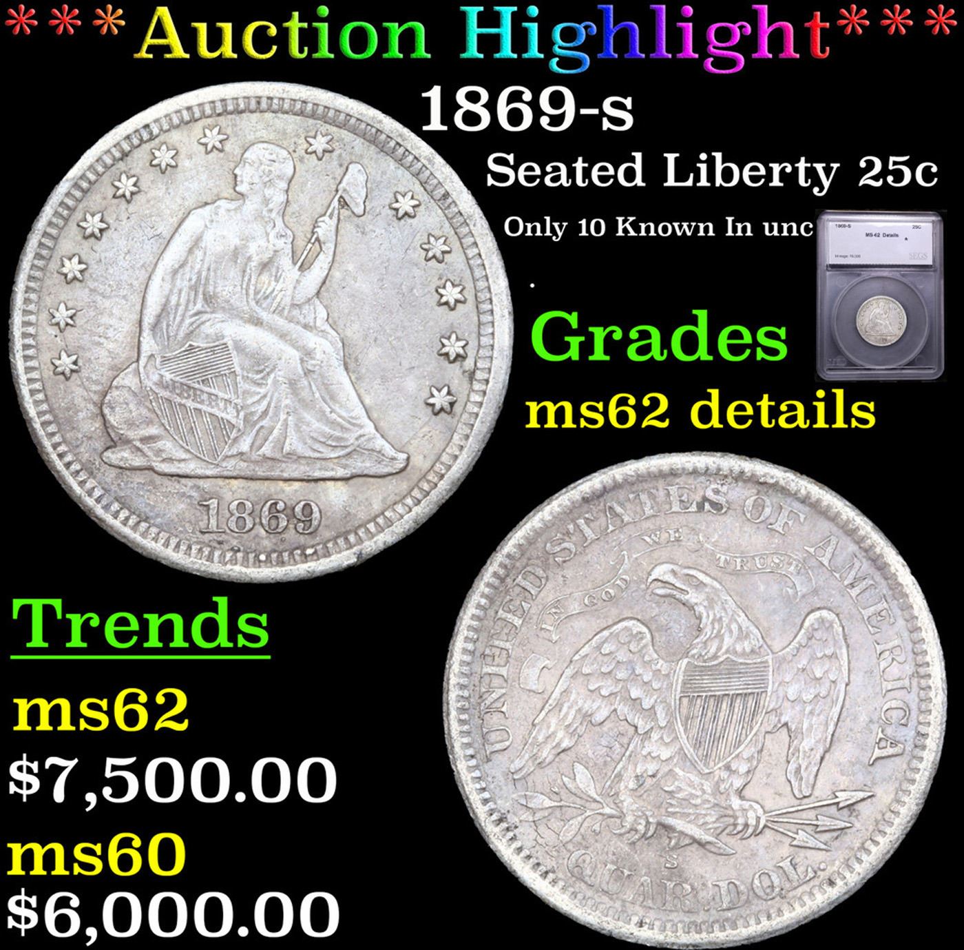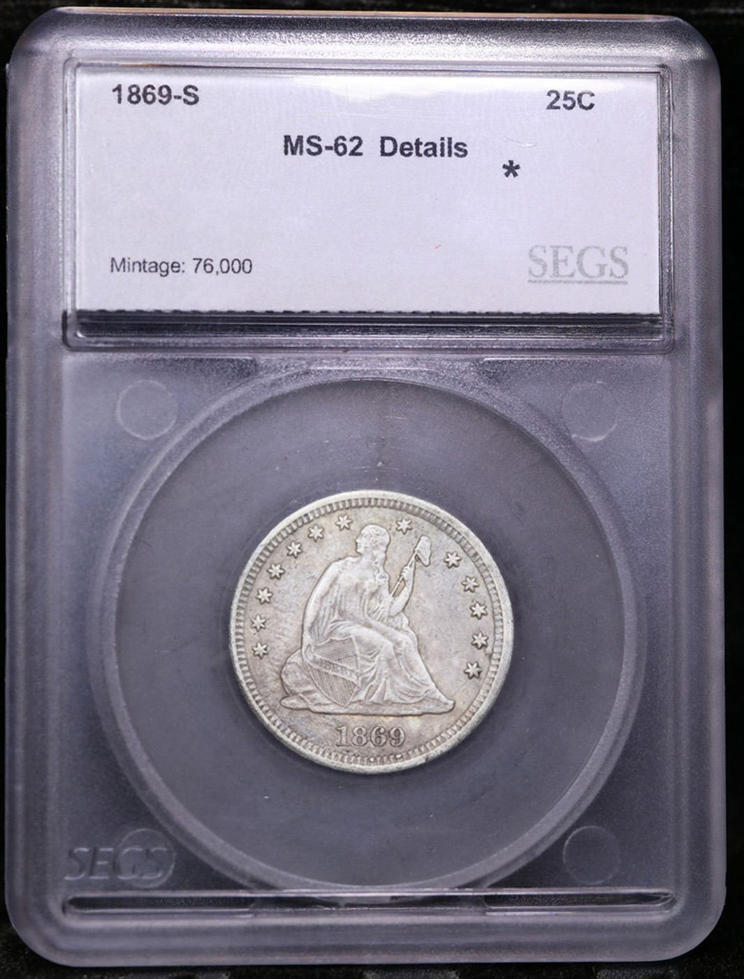 ***Auction Highlight*** 1869-s Seated Liberty Quarter 25c Graded ms62 details BY SEGS. A Corey's Pick, Bid to Win, Don't let it get Away Coin