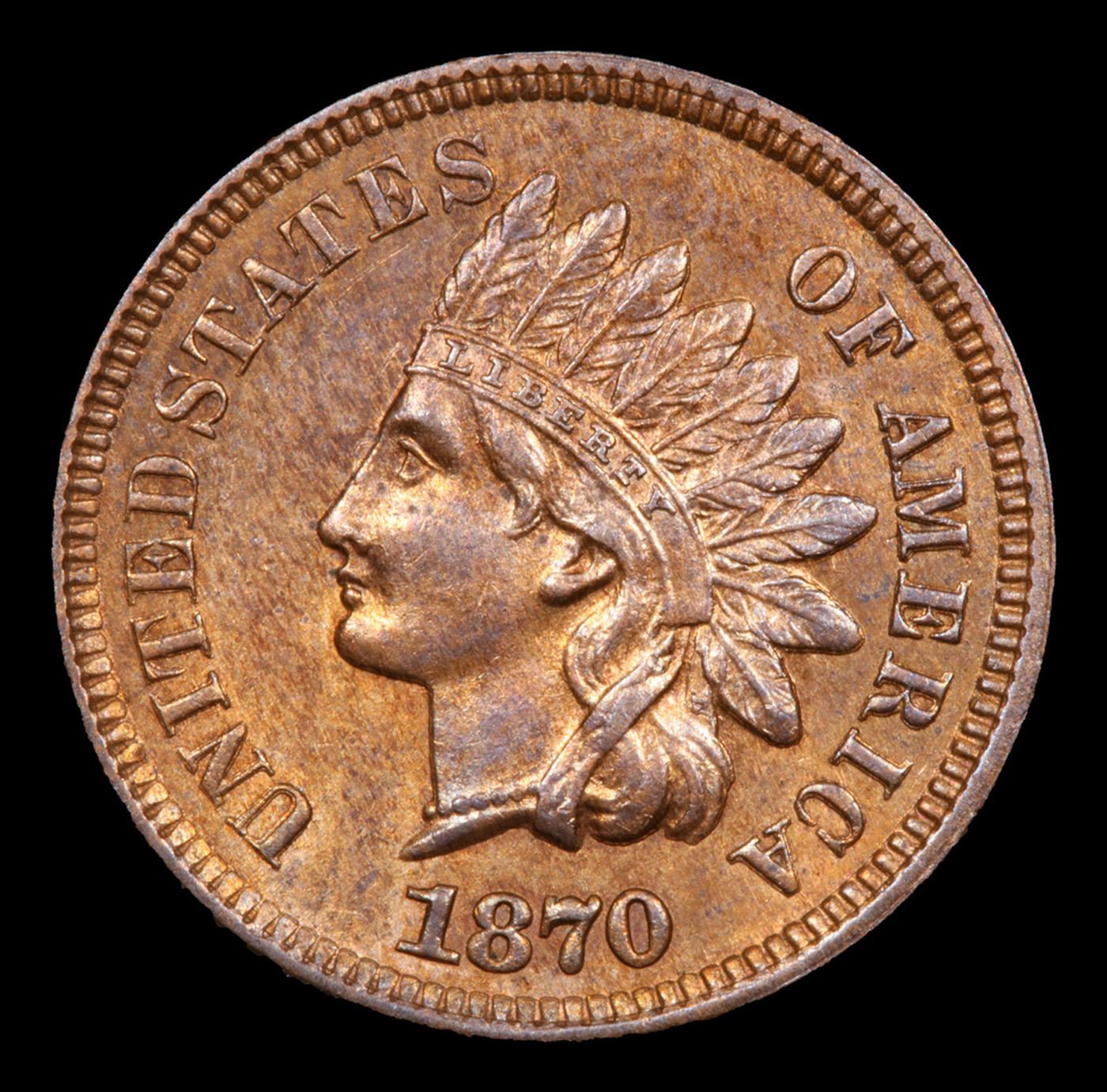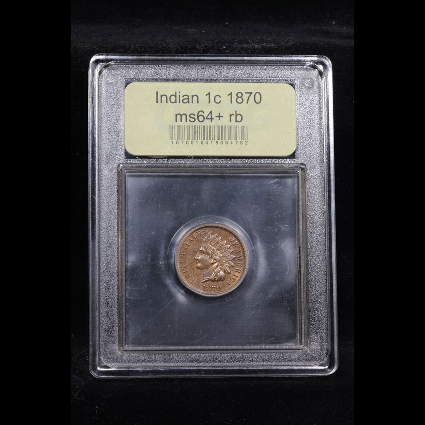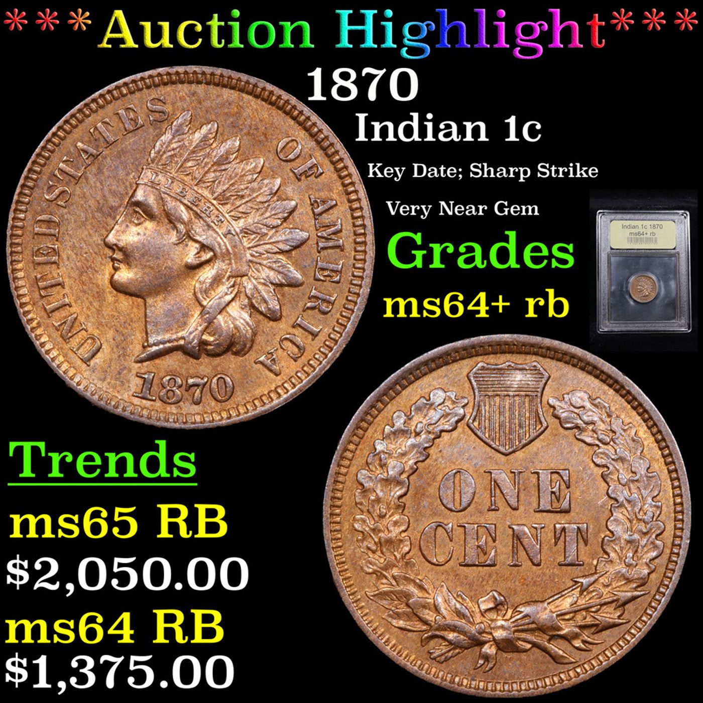***Auction Highlight*** 1870 Indian Cent 1c Graded Choice+ Unc RB BY USCG. Boldly sweeping cartwheels ignite the fiery orange-red surfaces of this satiny key Date cent. The strike is sharp and low magnification reveals a pleasing woodgrain surface effect. Choice for the grade. A Corey's Pick, Bid to Win, Don't let it get Away Coin