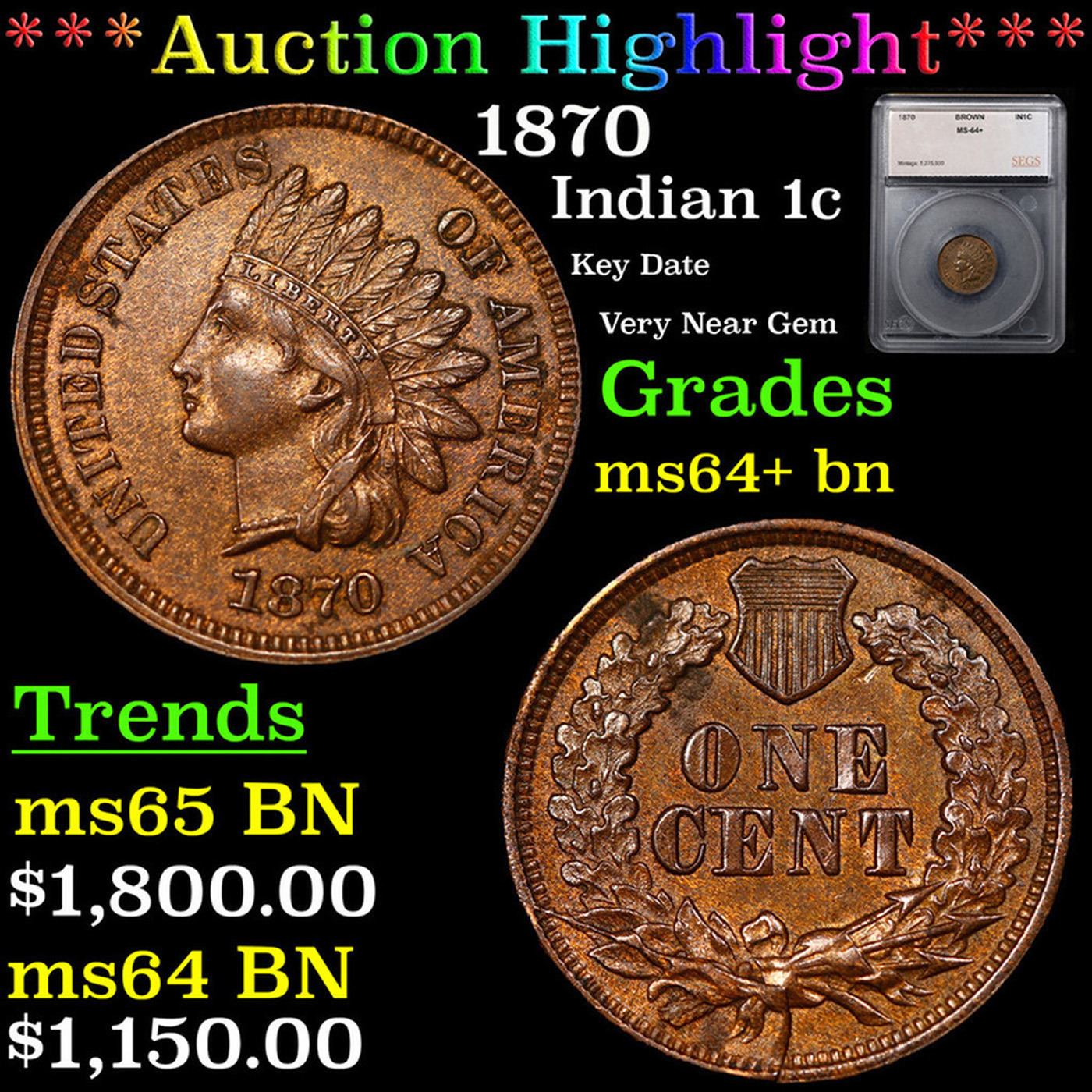 ***Auction Highlight*** 1870 Indian Cent 1c Graded ms64+ bn By SEGS.