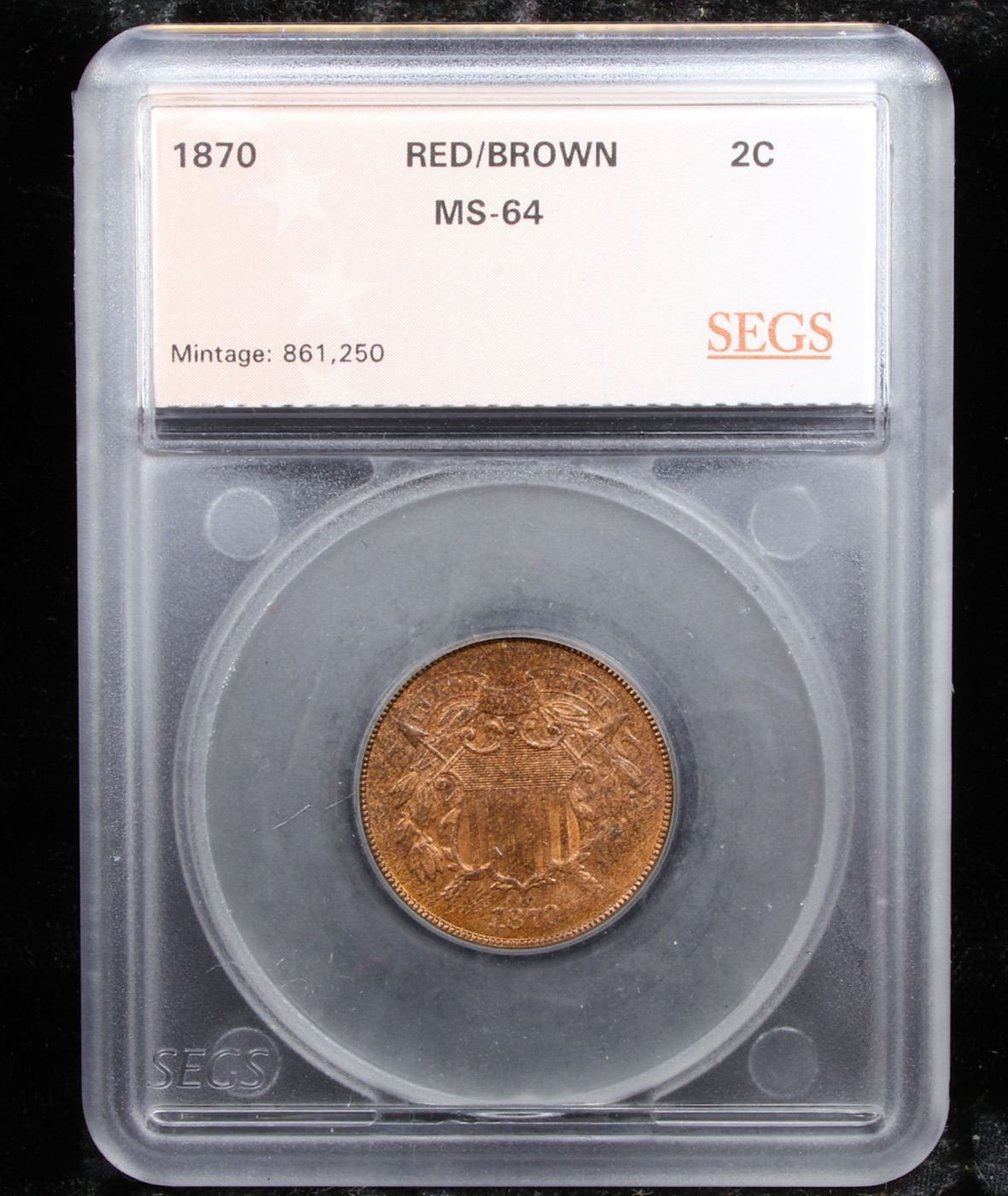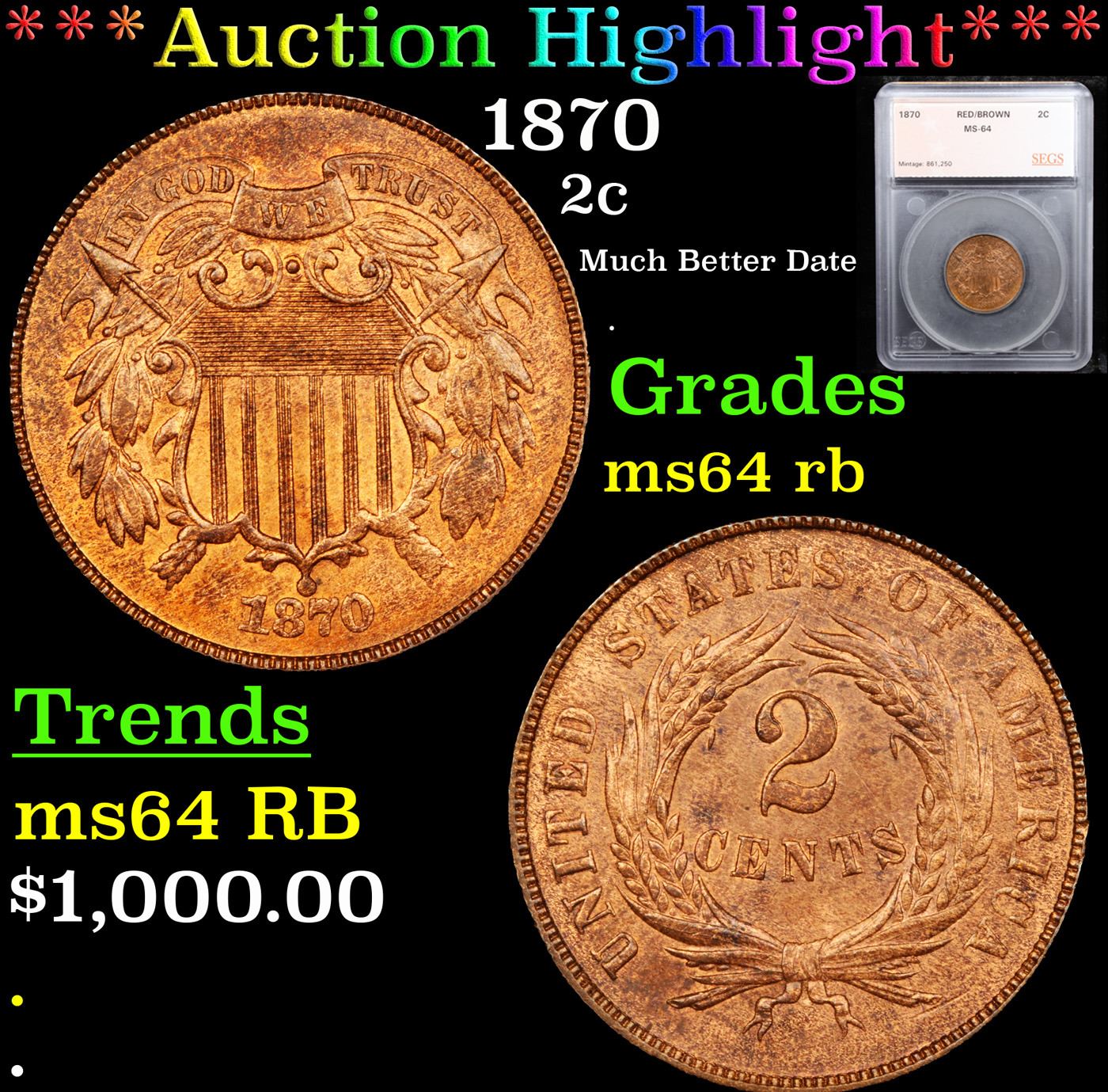 ***Auction Highlight*** 1870 Two Cent Piece 2c Graded ms64 rb By SEGS. A Corey's Pick, Bid to Win, Don't let it get Away Coin