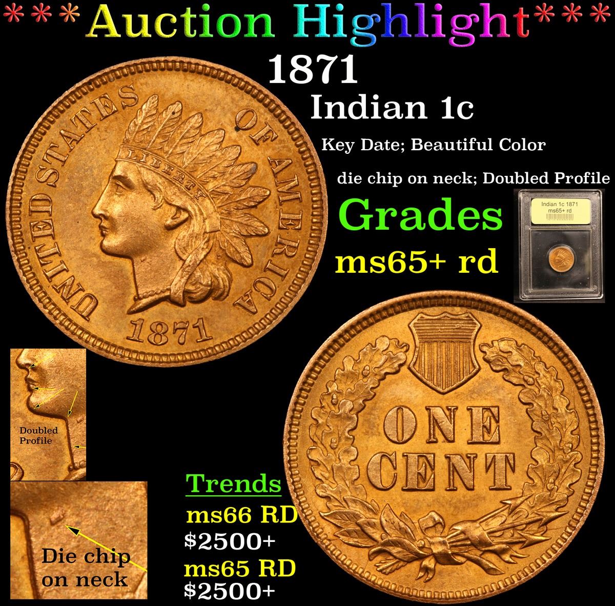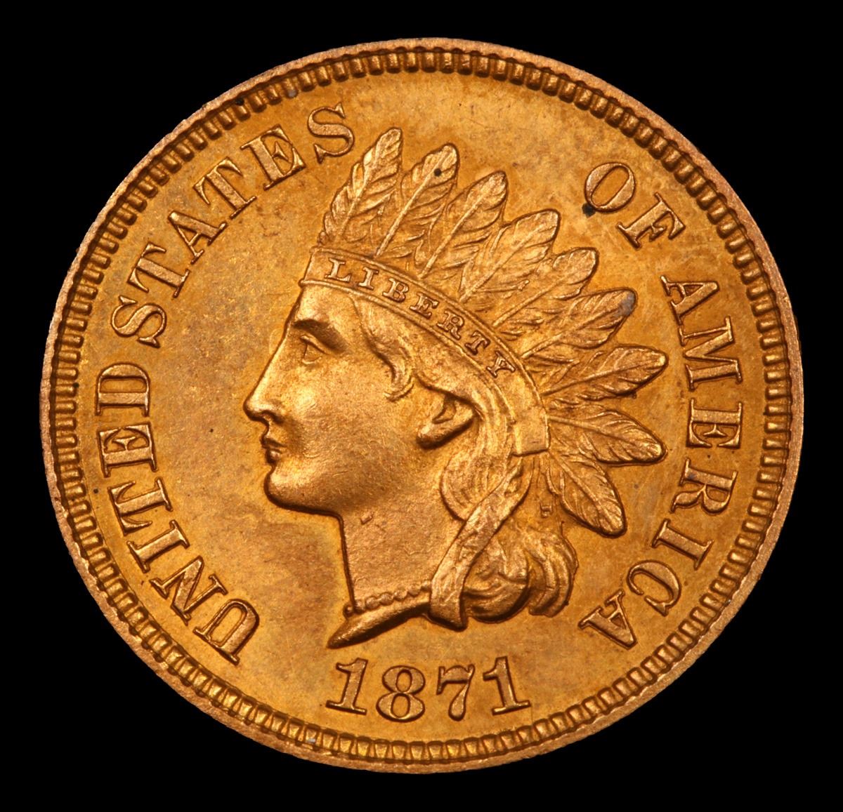 ***Auction Highlight*** 1871 Indian Cent 1c Graded Gem+ Unc RD By USCG. Quoting PCGS :"The 1871 Indian Cent is one of the lowest mintage issues of the series. In fact, from 1859 - 1876 it is the lowest mintage coin in the Indian Cent series. What's even worse is that during the early 1870's the Mint was melting a lot of previously issued cents, including many 1871 cents. Making the coin become scarcer. A semi key date to the series with possibly about 5,000 examples in existence in all grades combined." A Corey's Pick, Bid to Win, Don't let it get Away, you might not find its equal Coin. I give this coin my highest recommendation