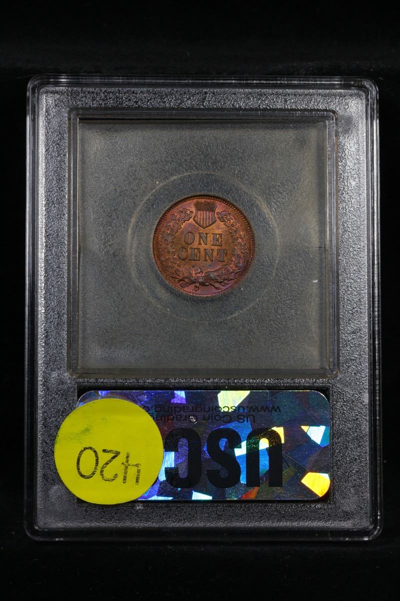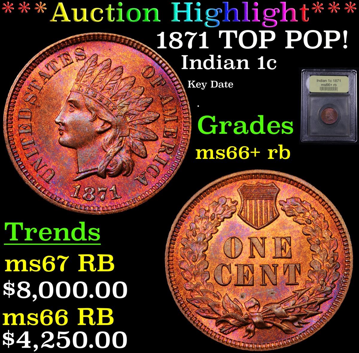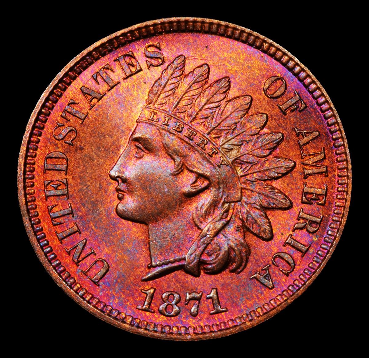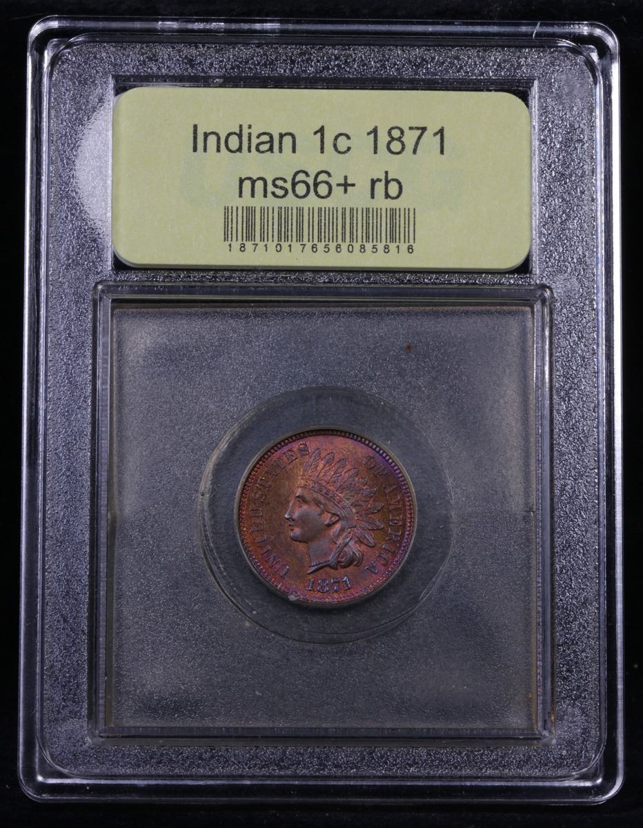 ***Auction Highlight*** 1871 TOP POP! Indian Cent 1c Graded GEM++ RB By USCG. Up for Auction is a Lustrous and Satiny Condition Rarity, the 1871 Indian Head Cent, in MS66+ Red and Brown. Bold N in ONE Variety. The Mint Act of March 3, 1871 called for redemption of small change, and more than 55 million bronze cents were melted -- including a meaningful portion of the 1871 mintage. copper-red toning combine with deep blue overtones for the Red and Brown designation, although the amount of mint red is substantial on both sides. Sharply struck, this Premium Gem survivor is the sole finest example known in Red and Brown. A Corey's Pick, Bid to Win, Don't let it get Away, you might not find its equal Coin. I give this coin my highest recommendation