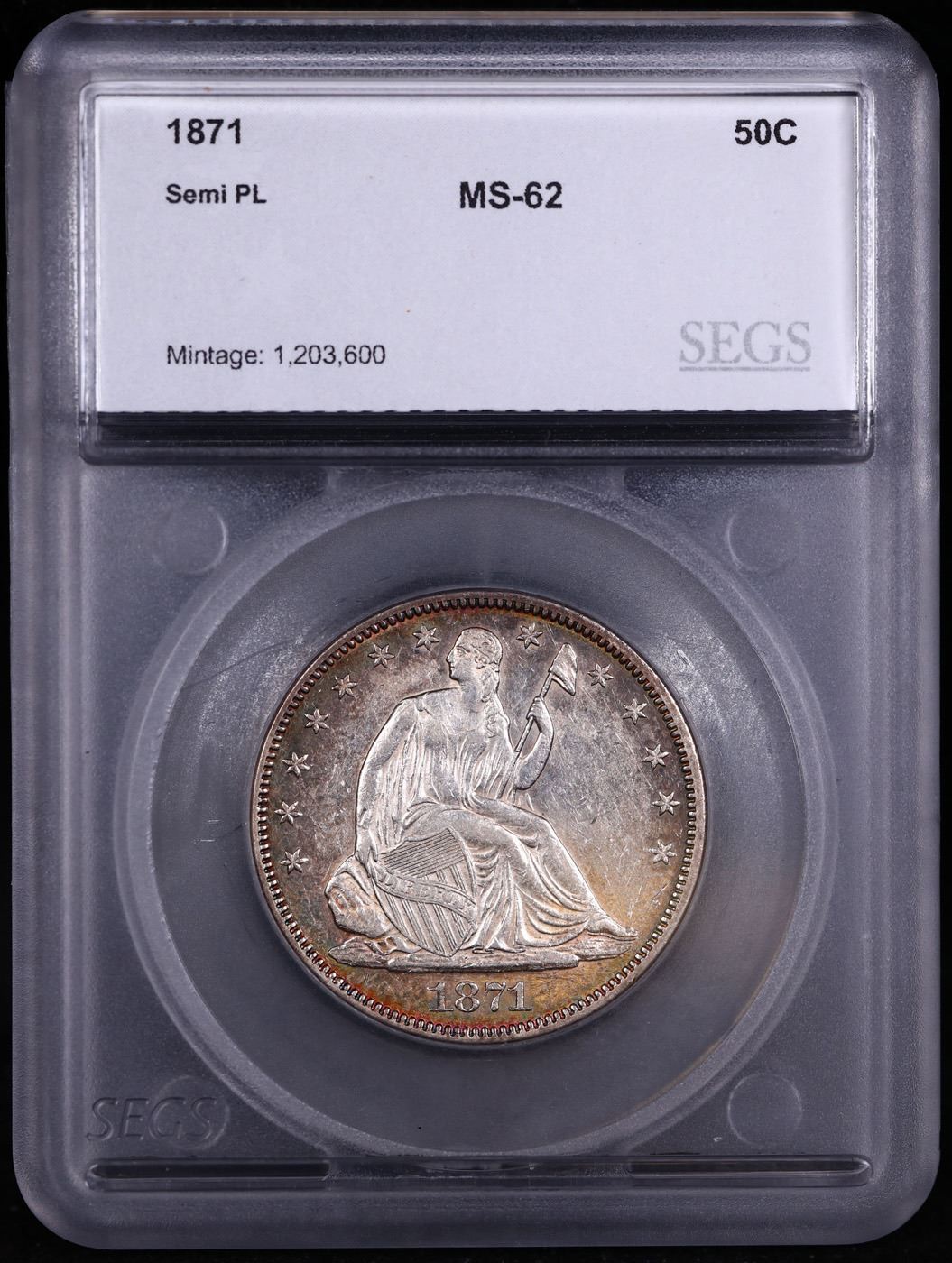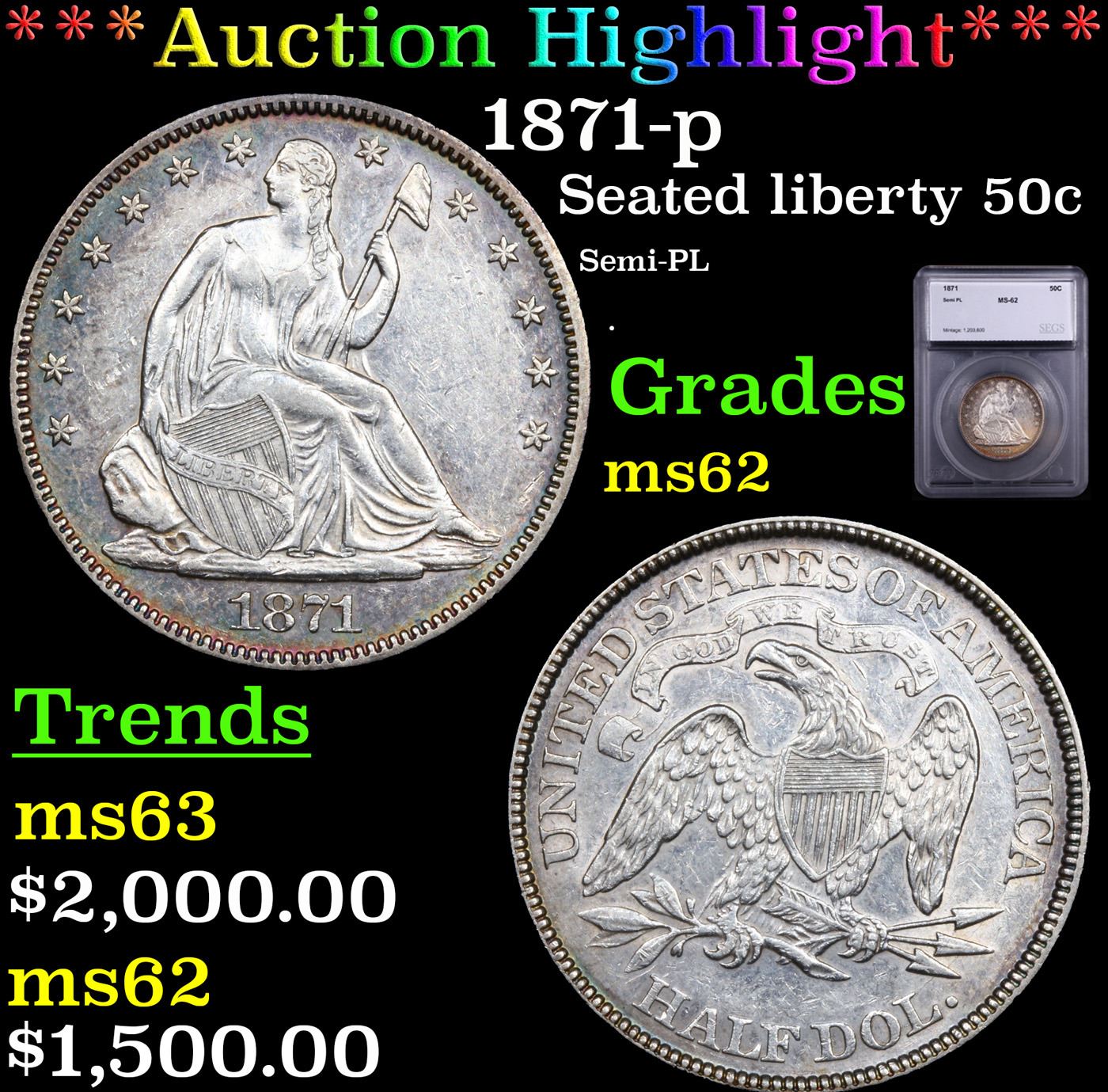 ***Auction Highlight*** 1871-p Seated Half Dollar 50c Graded ms62 By SEGS. A Key Date's Pick, Bid to Win, Don't let it get Away Coin