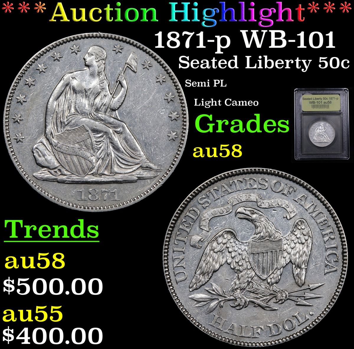 ***Auction Highlight*** 1871-p WB-101 Seated Half Dollar 50c Graded Choice AU/BU Slider By USCG. A Corey's Pick, Bid to Win Coin