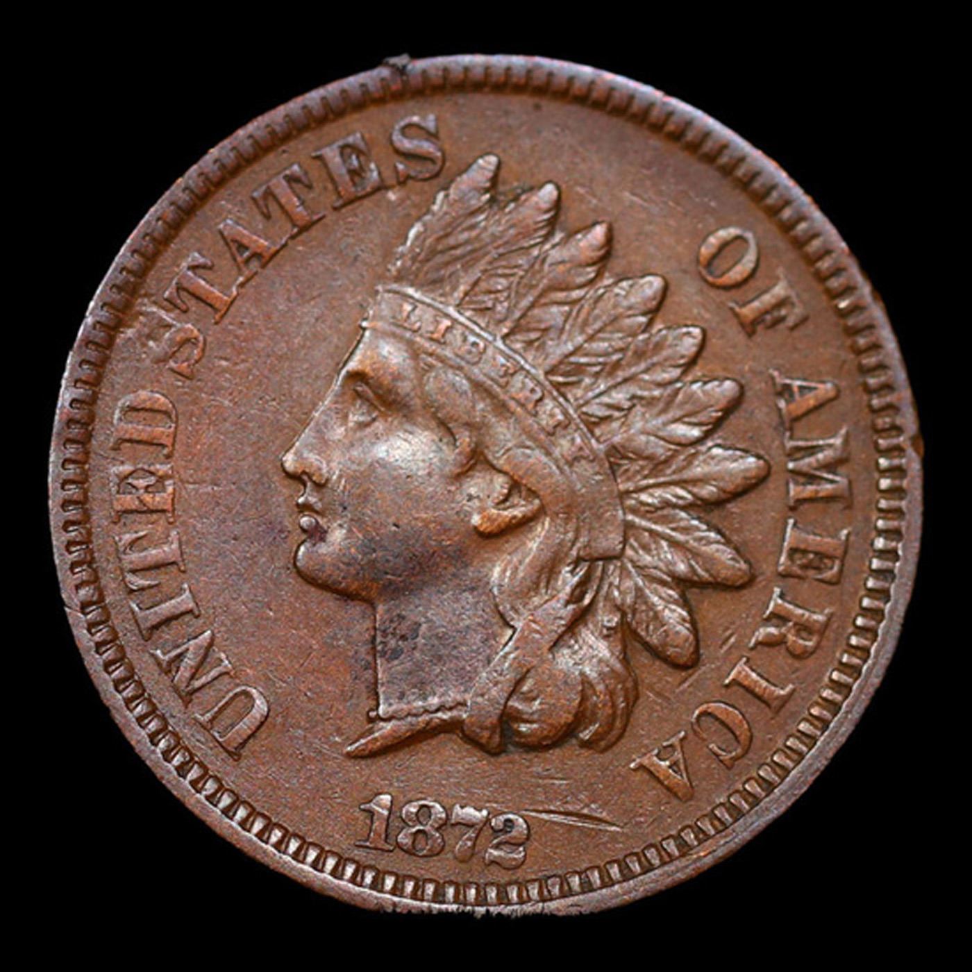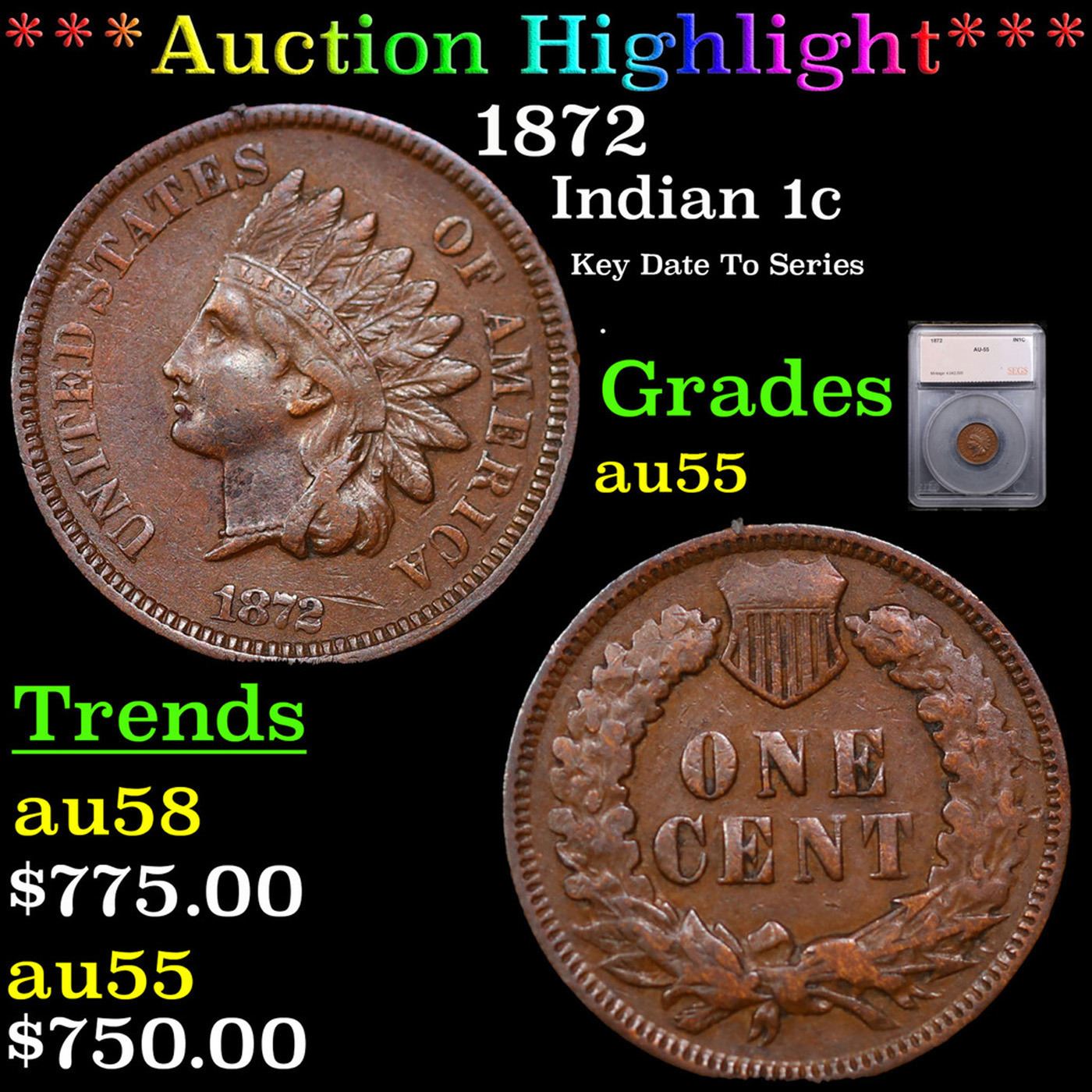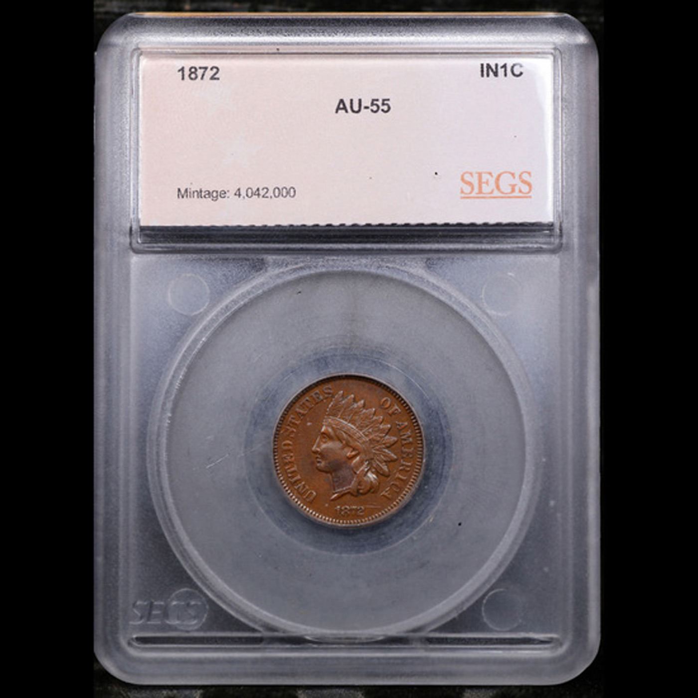 ***Auction Highlight*** 1872 Indian Cent 1c Graded au55 By SEGS. Per PCGS : "The 1872 Indian Cent has one of the lowest mintages in the series. It is very similar to the 1871, even though the 1871 has a lower mintage the 1872 seems to carry a higher premium in most grades. A semi key date to the indian Cent series with approximately 5,000 coins in existence, in all grades combined. Making a very tough issue."