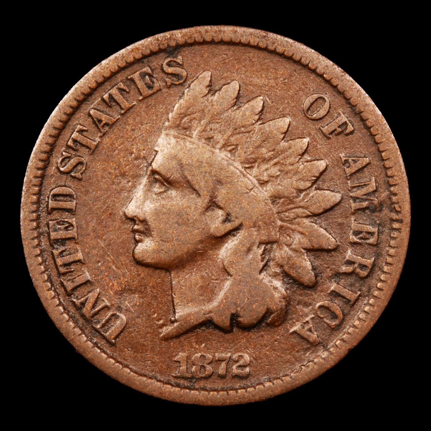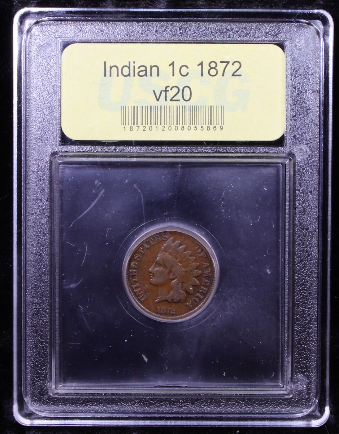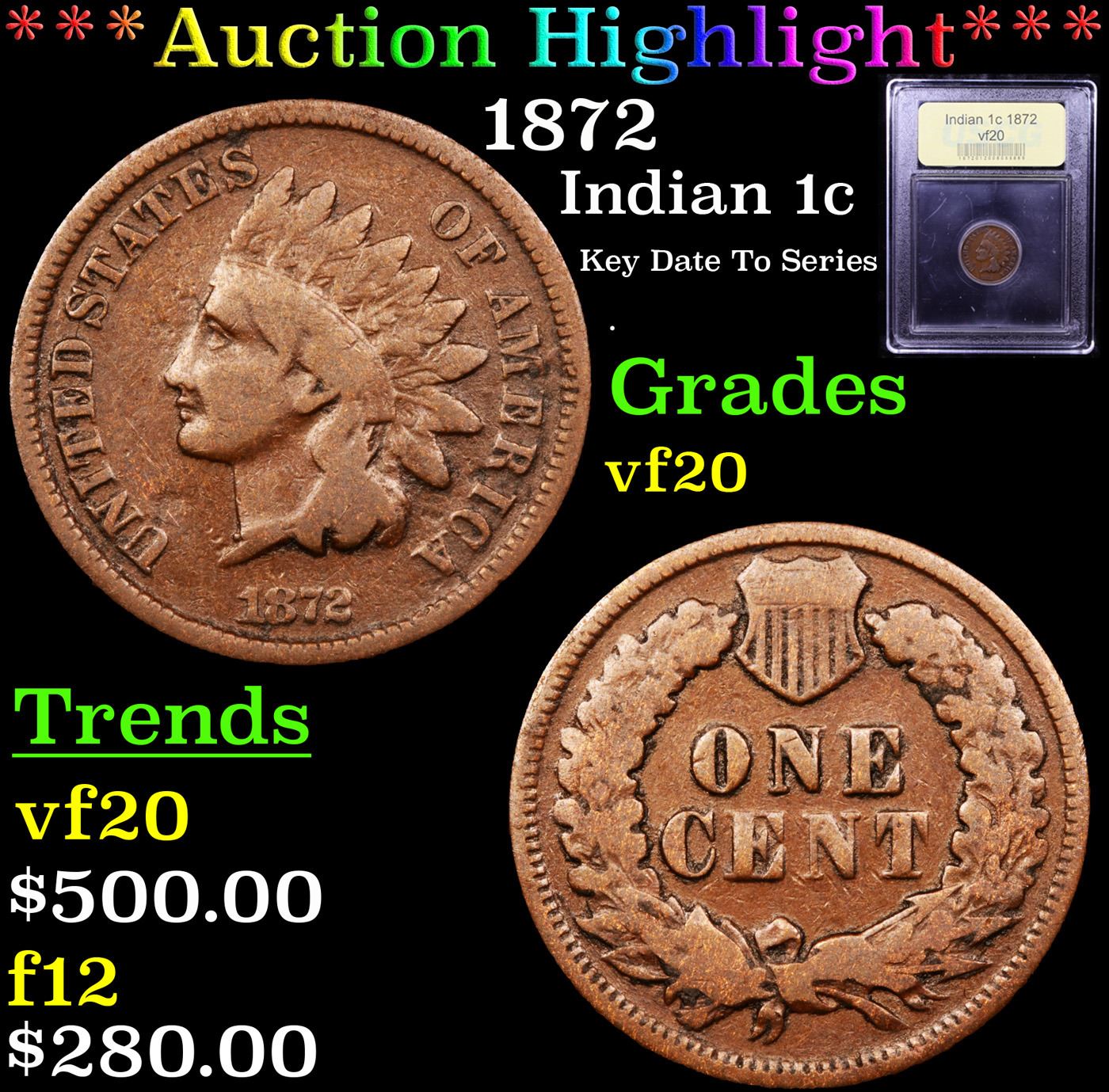 ***Auction Highlight*** 1872 Indian Cent 1c Graded vf, very fine By USCG. Per PCGS : "The 1872 Indian Cent has one of the lowest mintages in the series. It is very similar to the 1871, even though the 1871 has a lower mintage the 1872 seems to carry a higher premium in most grades. A semi key date to the indian Cent series with approximately 5,000 coins in existence, in all grades combined. Making a very tough issue."
