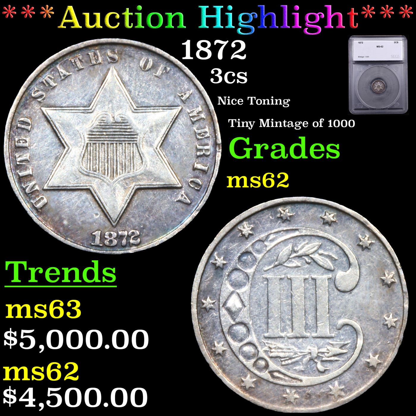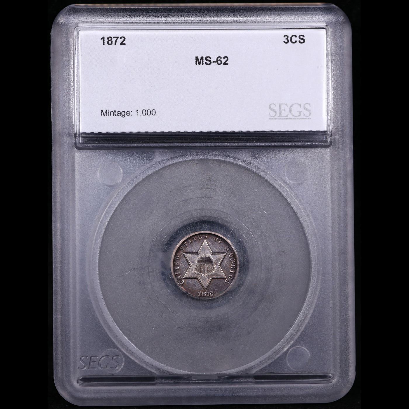 ***Auction Highlight*** 1872 Three Cent Silver 3cs Graded ms62 By SEGS. The 1872 Three Cent Silver was the last date made for circulation, and it has the lowest mintage of any date in the entire series. This makes it very popular with date collectors, but the demand for this date also makes it pricey A Key Date's Pick, Bid to Win, Don't let it get Away, you might not find its equal Coin