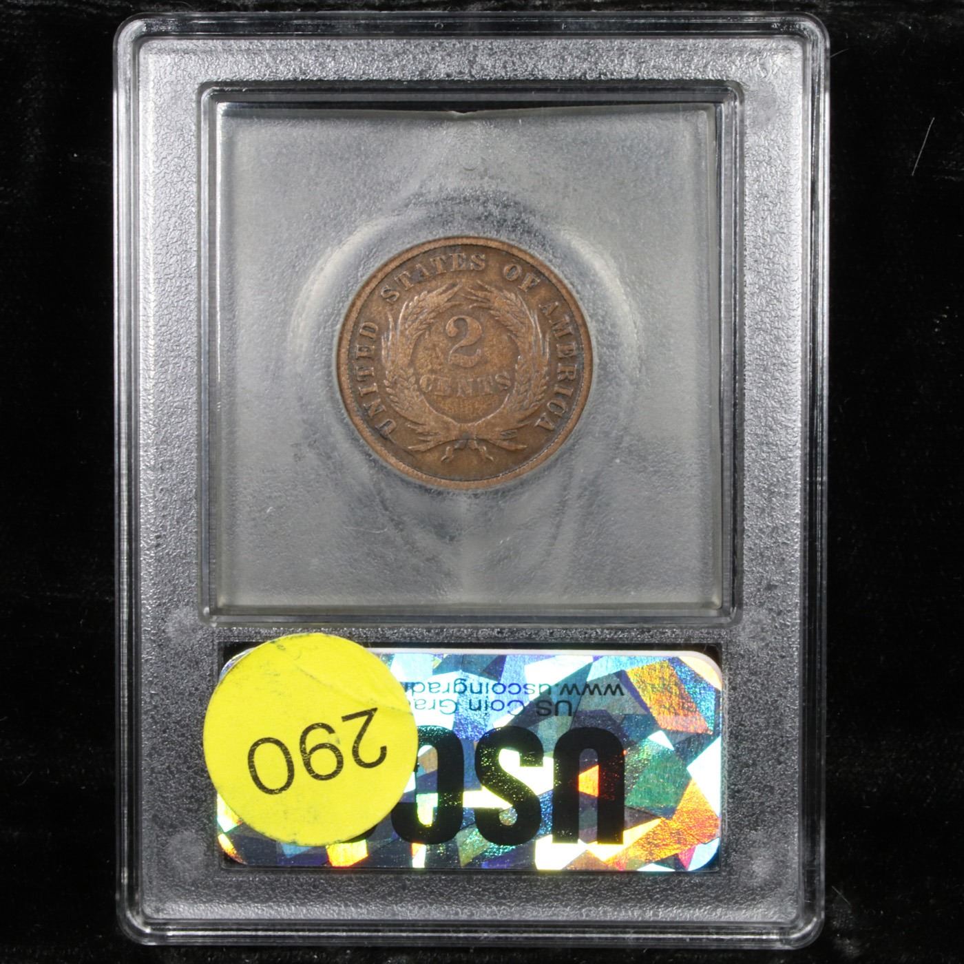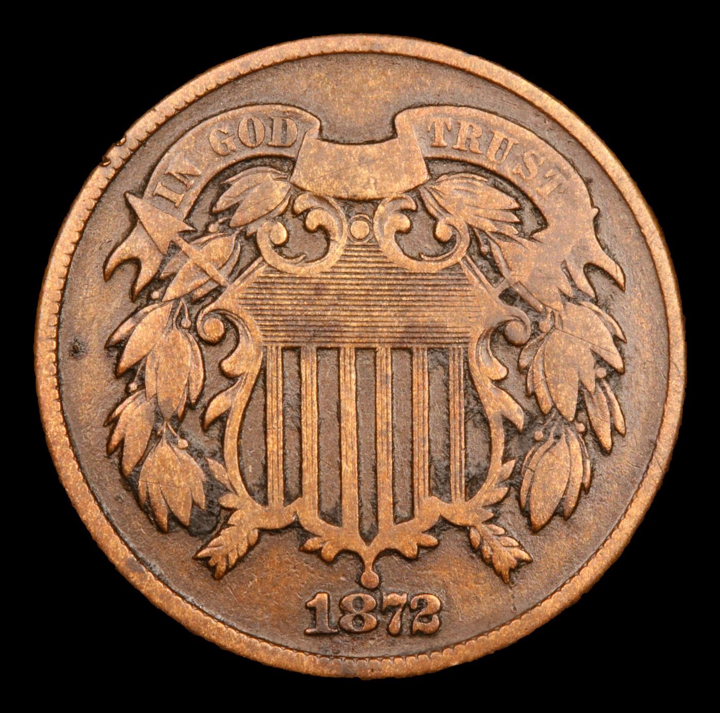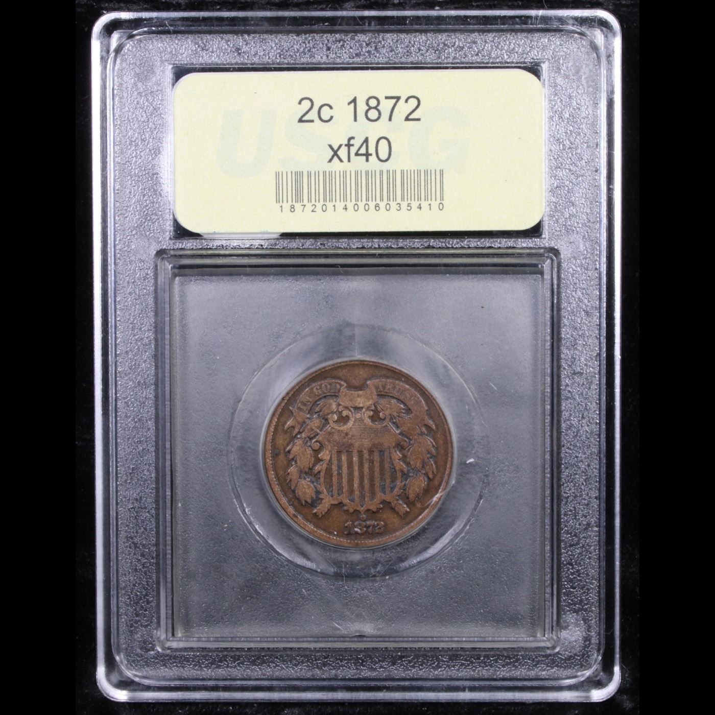***Auction Highlight*** 1872 Two Cent Piece 2c Graded xf By USCG. The 1872 Two Cent piece is the key date to the series. It has the lowest mintage by far. It's mintage is 65,000 and the next lowest mintage is the 1871, with a mintage of 721,250. The mintage of the 1872 Two Cent piece doesn't even come near any other coins in the series.The 1872 Two Cent piece is scarce and commands a premium in all grades. A Corey's Pick, Bid to Win, Don't let it get Away Coin