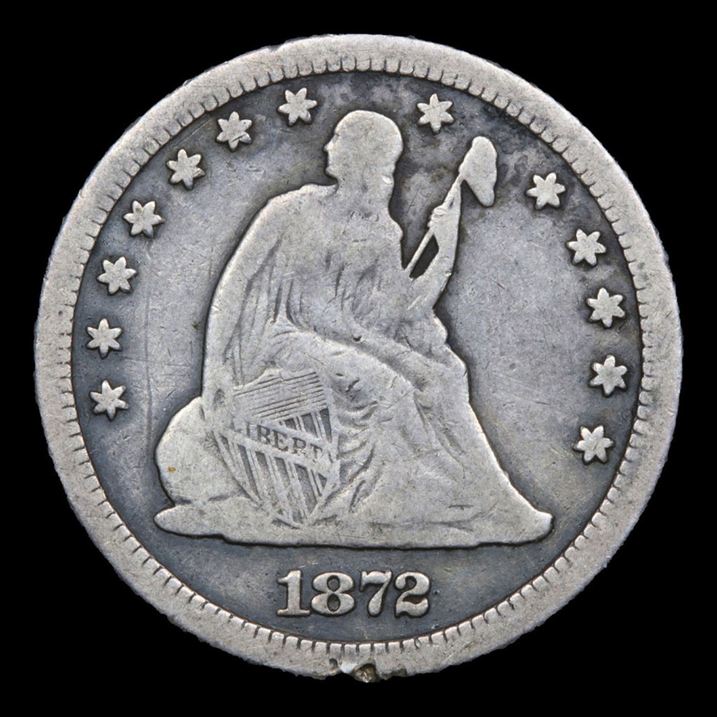 ***Auction Highlight*** 1872-cc Briggs 1-A Seated Liberty Quarter 25c Graded f15 By SEGS. A scant mintage of 22,850 pieces ensures the rarity of this Old West issue. Full rims and dentils are seldom seen at the Fine grade level, since many lower-grade coins lack edge detail between 10 and 2 o'clock on the obverse. The reverse is likewise weak below the denomination. This Choice Fine example is an exception, with complete borders and exceptional detail for the grade. All of the raised elements show above-average definition for the grade. Rich-silver patina blankets both sides for sharp eye appeal, and there are no distracting marks or abrasions. The motto is fully readable, quite rare this nice. A Corey's Pick, Bid to Win, Don't let it get Away Coin