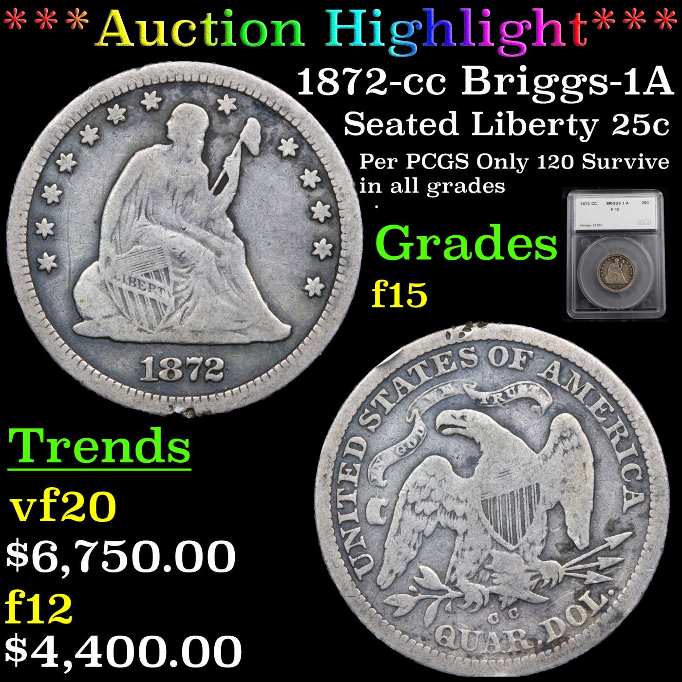 ***Auction Highlight*** 1872-cc Briggs-1A Seated Liberty Quarter 25c Graded F, Fine By SEGS. A scant mintage of 22,850 pieces ensures the rarity of this Old West issue. Full rims and dentils are seldom seen at the Fine grade level, since many lower-grade coins lack edge detail between 10 and 2 o'clock on the obverse. The reverse is likewise weak below the denomination. This Choice Fine example is an exception, with complete borders and exceptional detail for the grade. All of the raised elements show above-average definition for the grade. Rich-silver patina blankets both sides for sharp eye appeal, and there are no distracting marks or abrasions. The motto is fully readable, quite rare this nice. A Corey's Pick, Bid to Win, Don't let it get Away, you might not find its equal Coin. I give this coin my highest recommendation