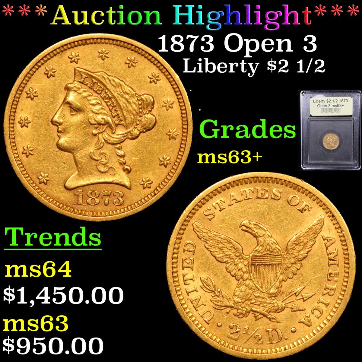 ***Auction Highlight*** 1873 Open 3 Gold Liberty Quarter Eagle $2 1/2 Graded Select+ Unc By USCG (fc