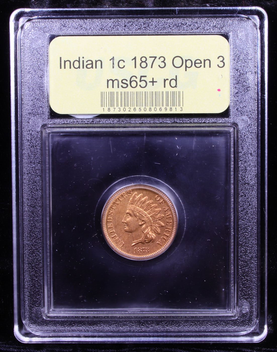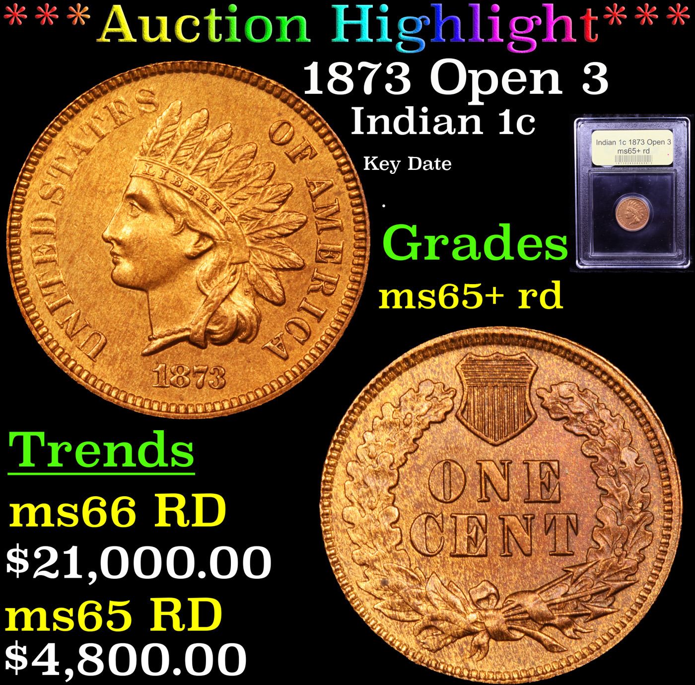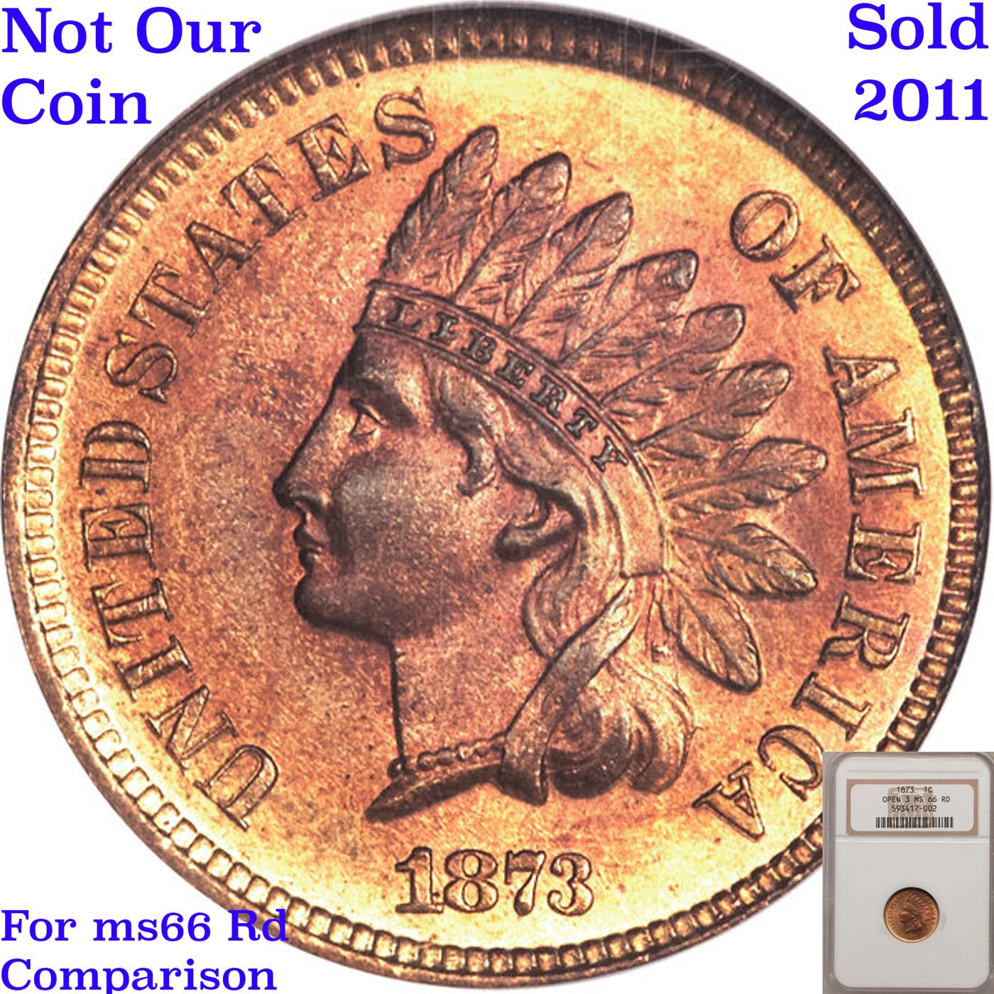***Auction Highlight*** 1873 Open 3 Indian Cent 1c Graded Gem+ Unc RD By USCG. his enchanting coin is sharply struck throughout with a full endowment of frosty mint luster. Further adorned with vivid rose-orange color, there is much to recommend this Gem to the discerning Indian cent collector. This is the more frequently encountered date logotype of the circulation strike 1873 Indian cent, the coins struck from dies prepared after Chief Coiner Archibald Louden Snowden lobbied successfully to replace its Close 3 predecessor in a letter to Mint Director Henry R. Linderman on January 18 of that year. This is a particularly fortunate survivor whose Gem-quality surfaces place it among the finest certified available to today's discerning Indian cent collectors. Ive included both an ms65 RD and ms66 RD for your comparison A Corey's Pick, Bid to Win, Don't let it get Away, you might not find its equal Coin. I give this coin my highest recommendation
