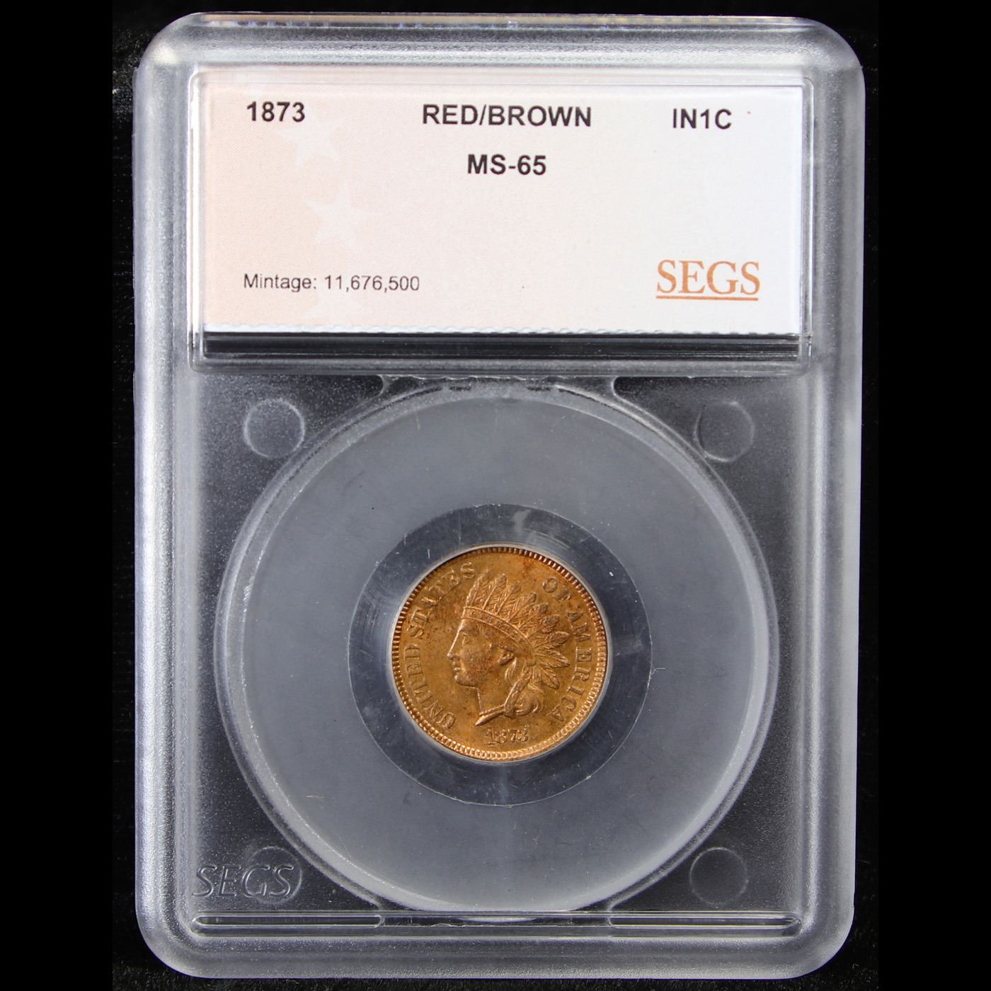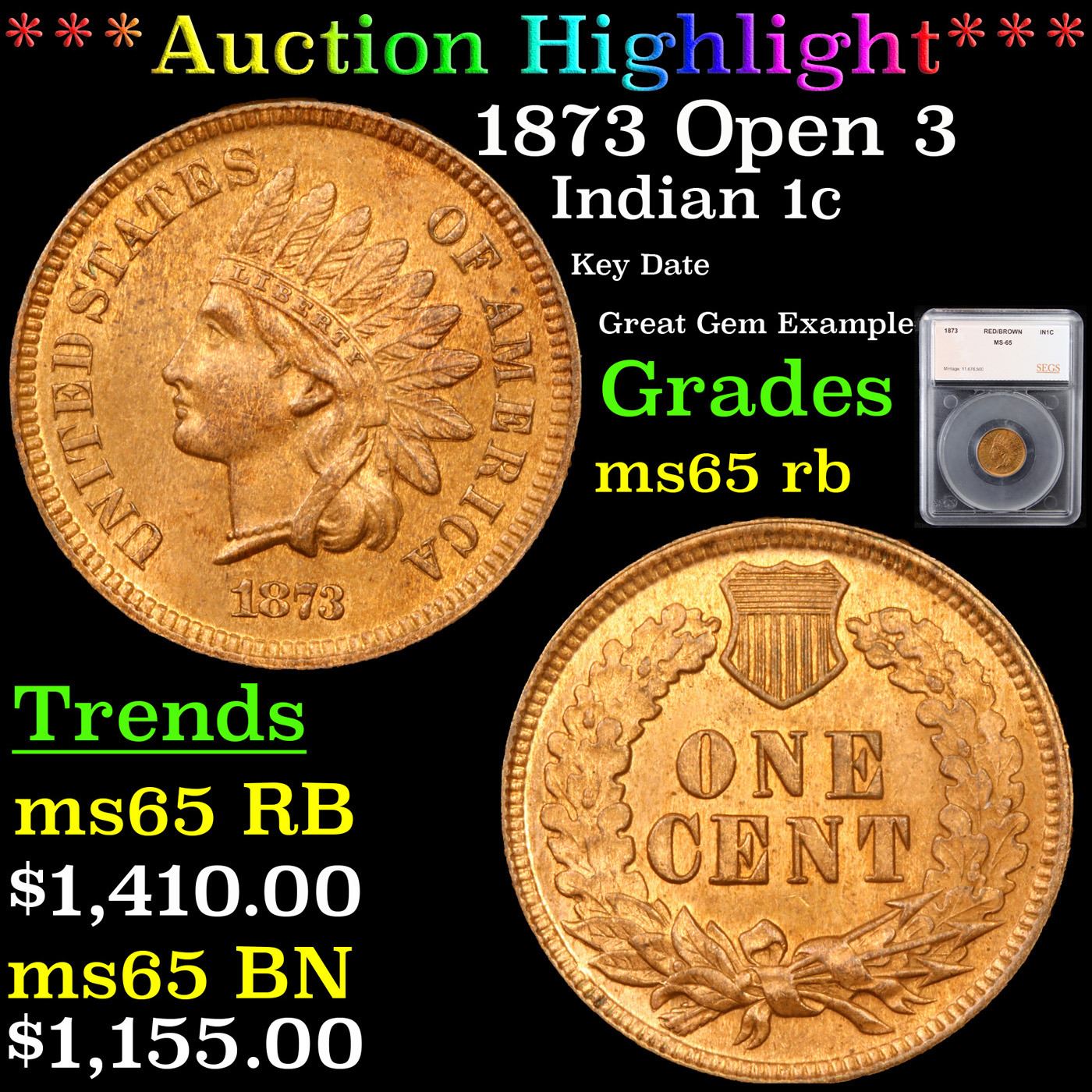***Auction Highlight*** 1873 Open 3 Indian Cent 1c Graded ms65 rb By SEGS.