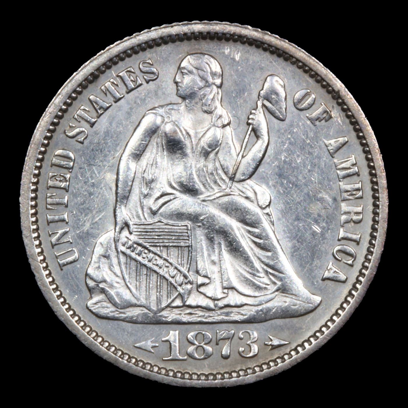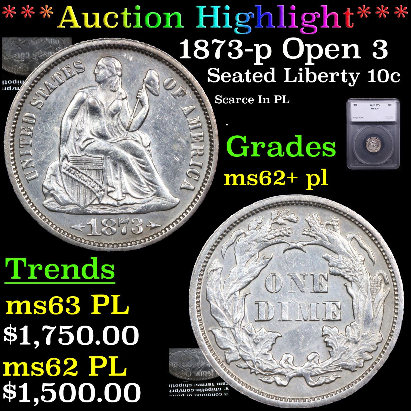 ***Auction Highlight*** 1873-p Open 3 Seated Liberty Dime 10c Graded ms62+ pl By SEGS.