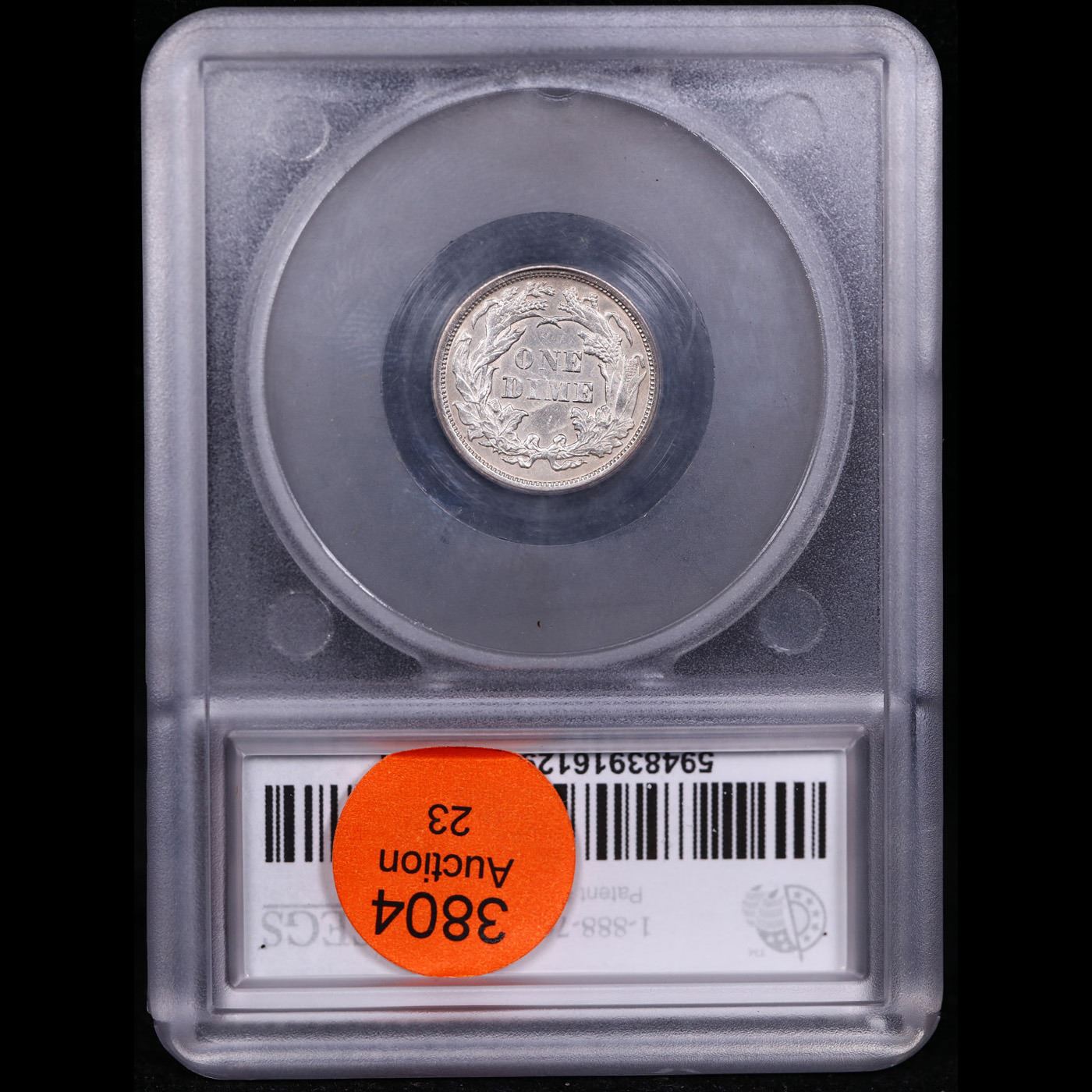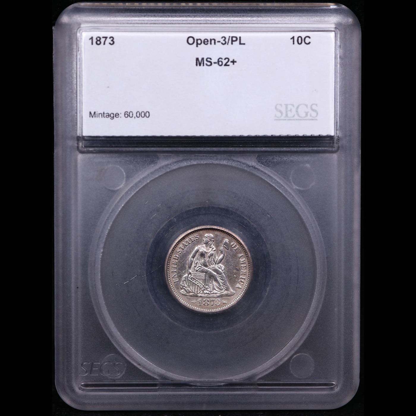 ***Auction Highlight*** 1873-p Open 3 Seated Liberty Dime 10c Graded ms62+ pl By SEGS (fc)