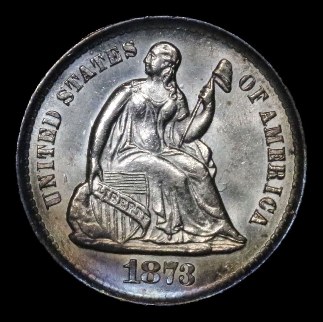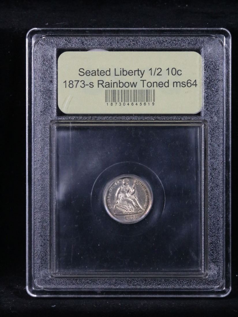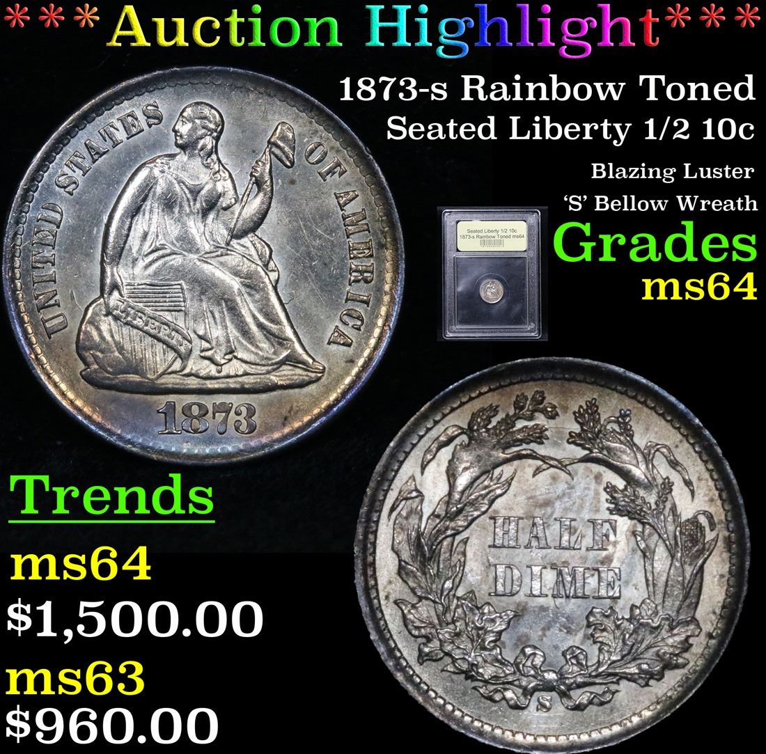 ***Auction Highlight*** 1873-s Rainbow Toned Blazing Luster 'S' Bellow Wreath Seated Liberty Half Dime 1/2 10c Graded Choice Unc By USCG. A Corey's Pick, Bid to Win, Don't let it get Away, you might not find its equal Coin