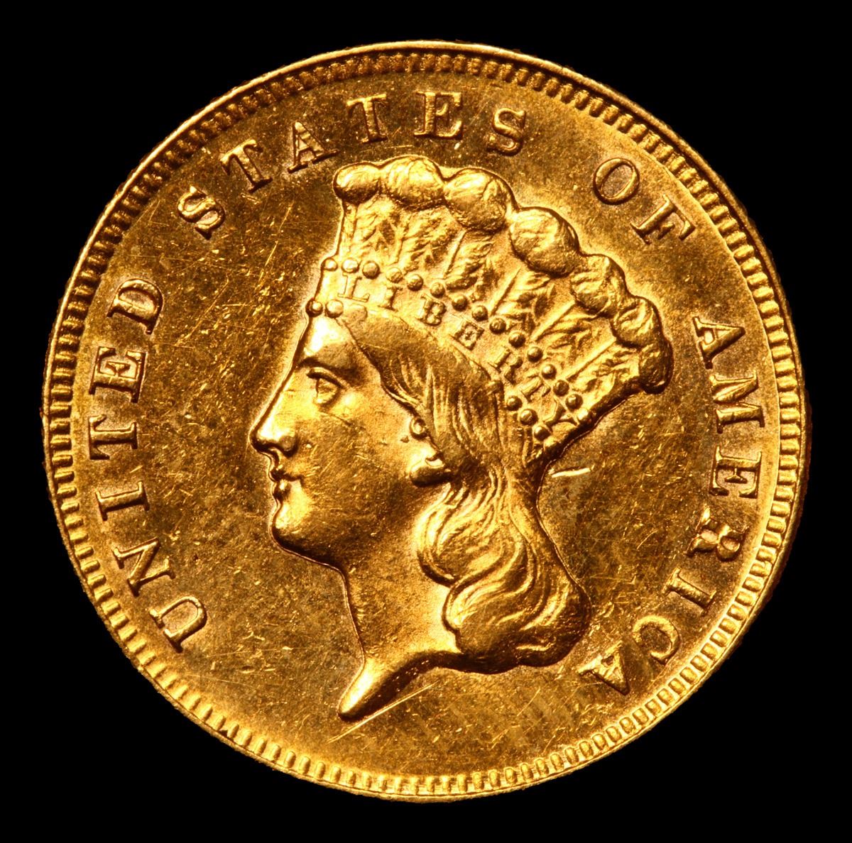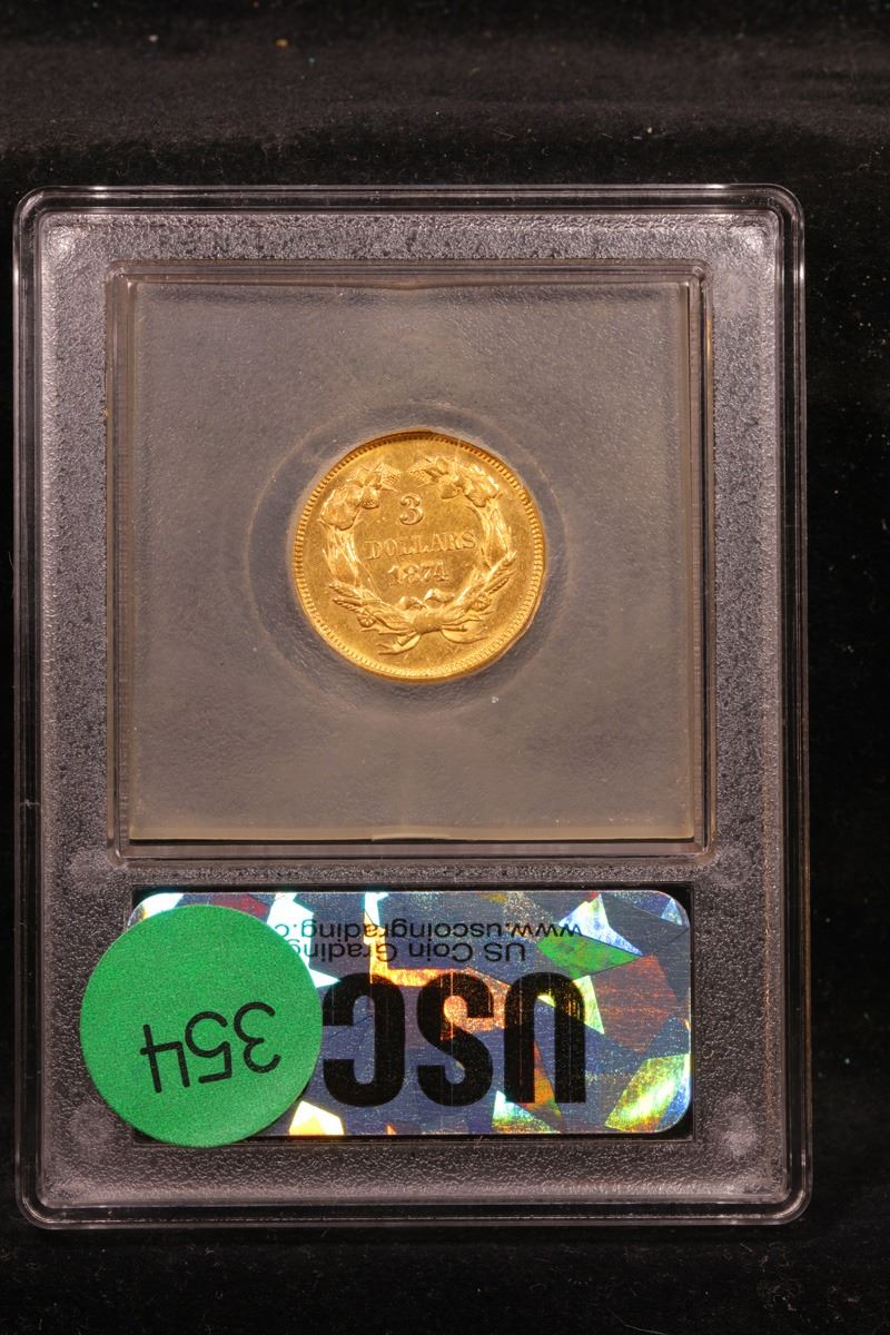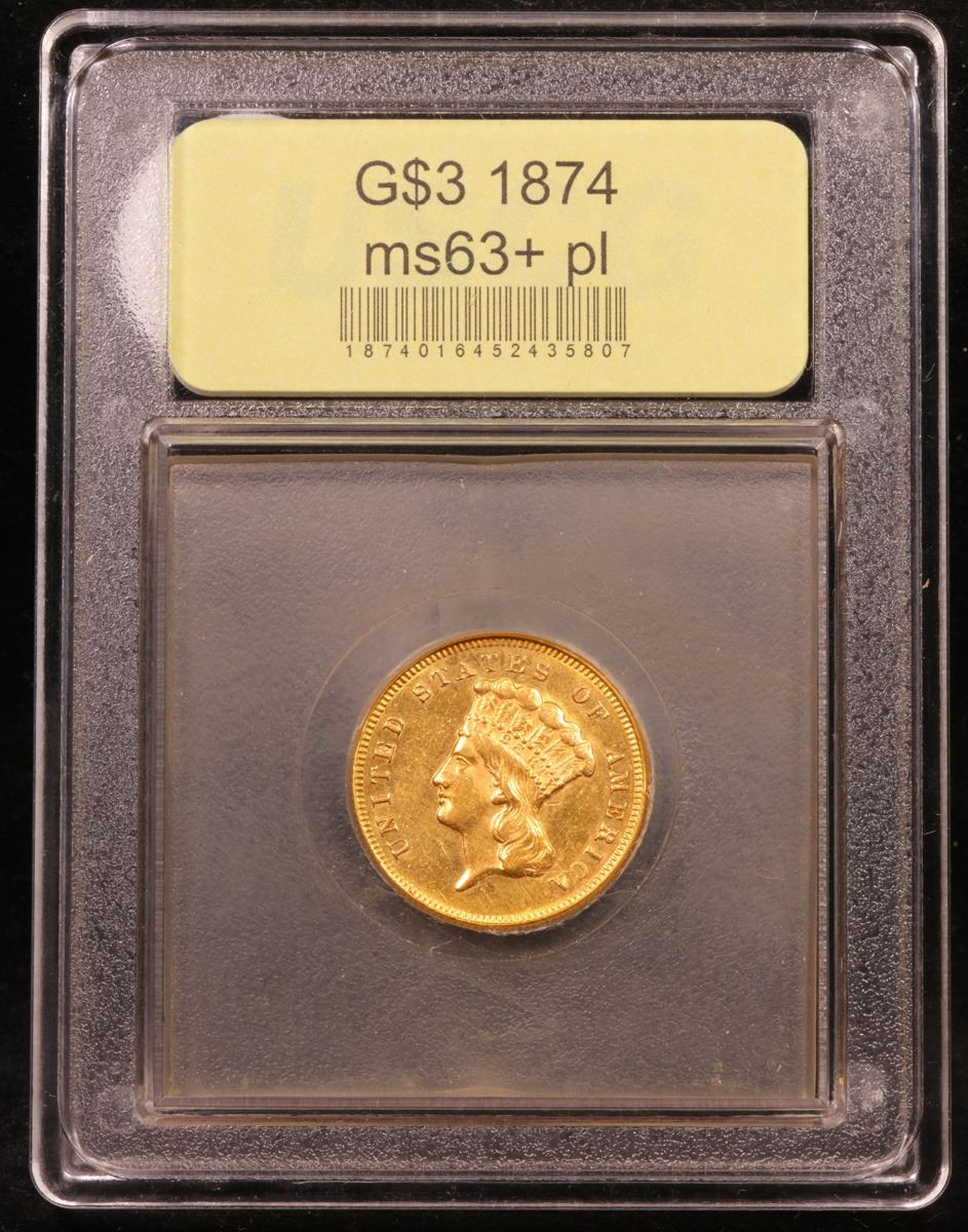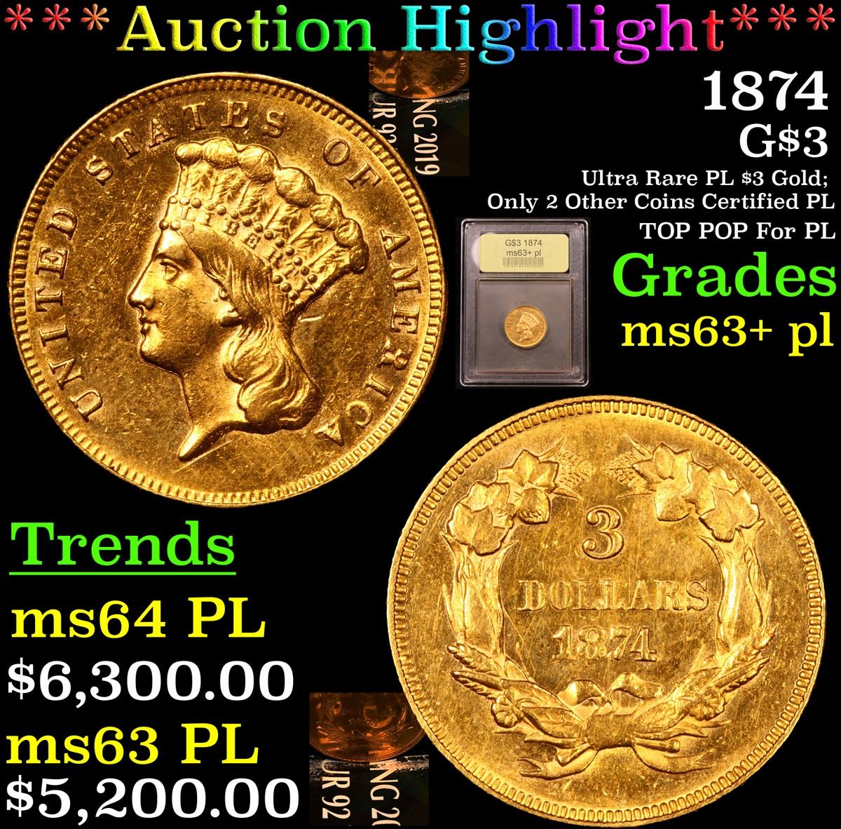 ***Auction Highlight*** 1874 Three Dollar Gold .$3 Graded Select Unc+ PL By USCG. Up for Auction is an ultra rare Proof Like 1874 $3 Princess Head Gold. Proof like three dollar gold coins are extremely rare and seldom seen, constituting as they do a tiny minority of the certified population. While some issues from the 1870s forward show Proof like of up to 1% or 2%, some early issues in the series show Proof like pieces forming only a small fraction of a percent of the Mint State pieces certified. In the case of the 1874, somewhat less than 1% of the pieces have earned the Proof like designation. In fact, Including this example, only 3 coins have earned a PL designation. This piece boasts lovely yellow-gold surfaces with attractive black-on-gold contrast. A few faint field abrasions appear consistent with the Select grade. This example is the TOP POP in PL, with 1 other at ms63 PL and one at ms61 PL. The ms61 PL has never come to auction and the ms63PL sold for $8,000 at auction. A Corey's Pick, Bid to Win, Don't let it get Away, you might not find its equal Coin