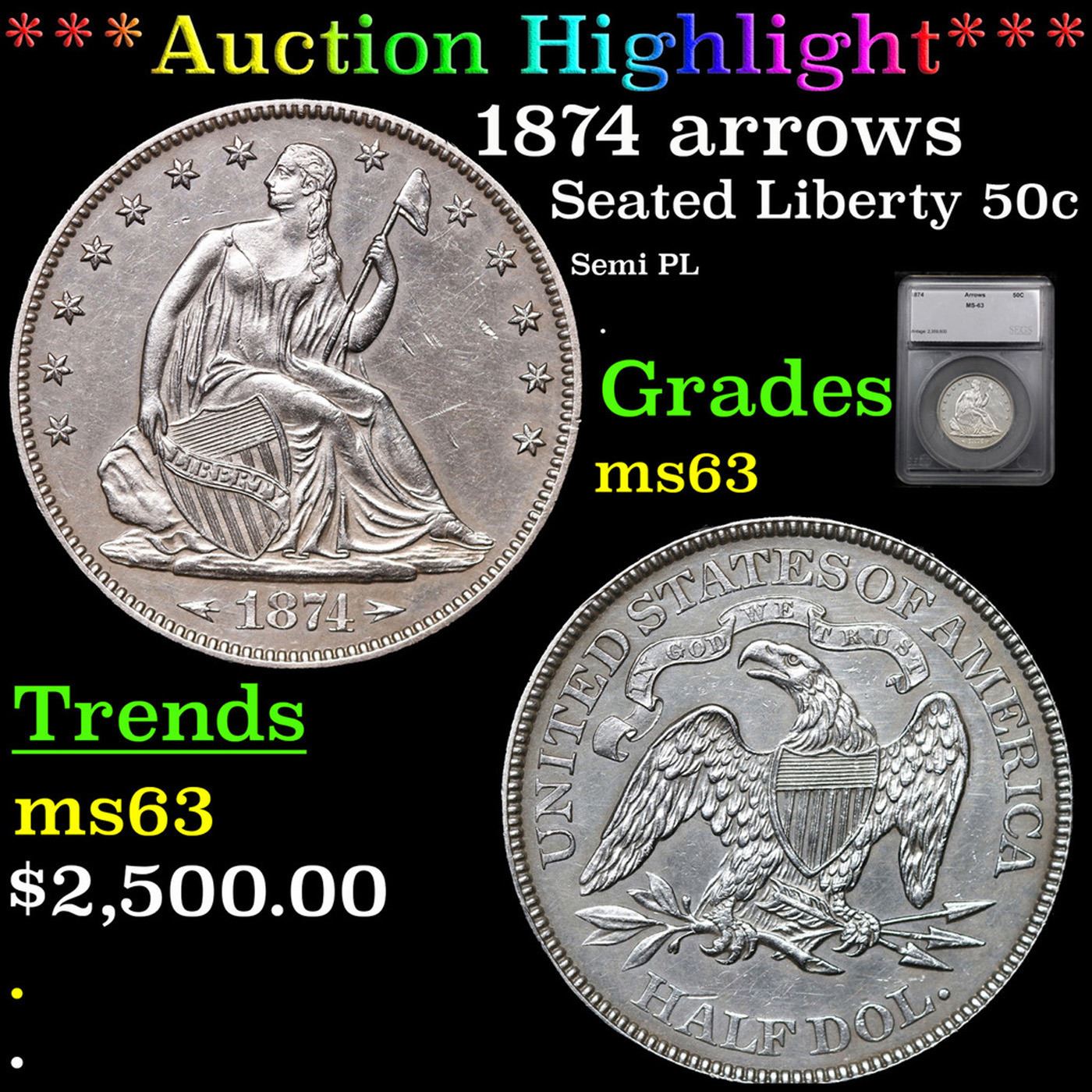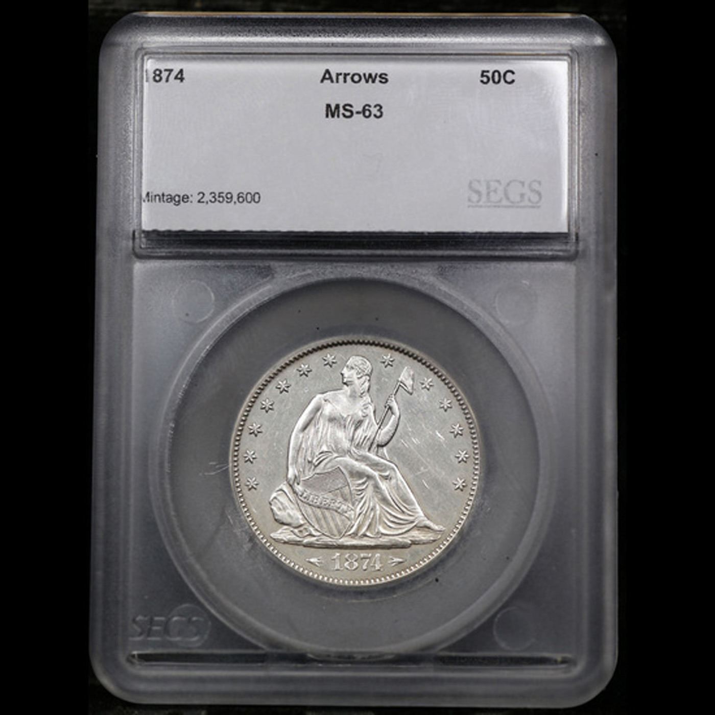 ***Auction Highlight*** 1874 arrows Seated Half Dollar 50c Graded ms63 By SEGS. A Corey's Pick, Bid to Win, Don't let it get Away, you might not find its equal Coin