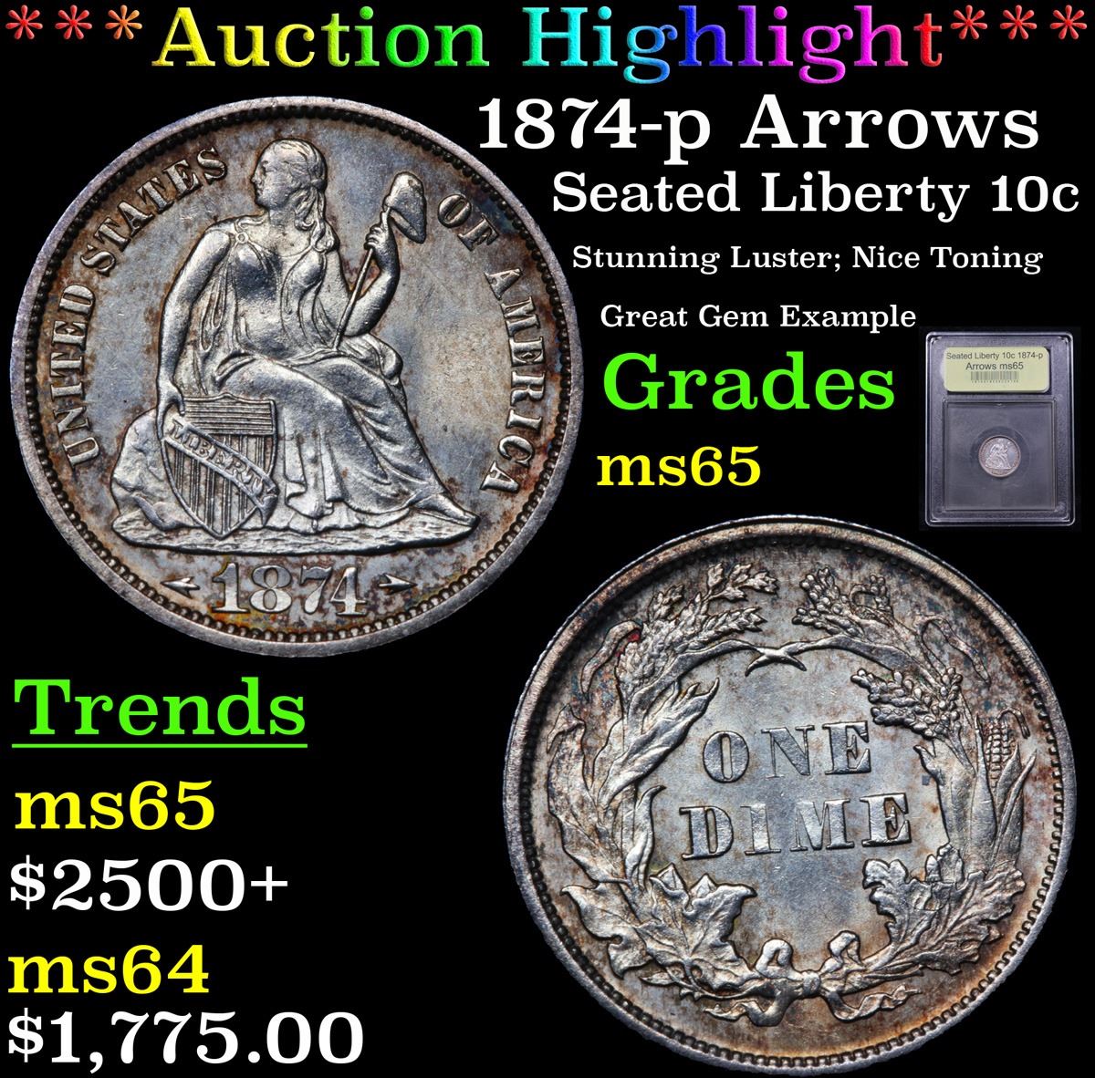 ***Auction Highlight*** 1874-p Arrows Seated Liberty Dime 10c Graded GEM Unc By USCG. A Corey's Pick, Bid to Win, Don't let it get Away Coin
