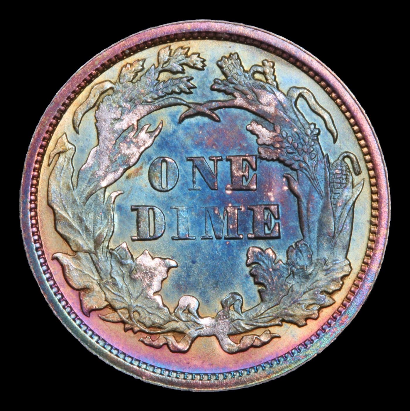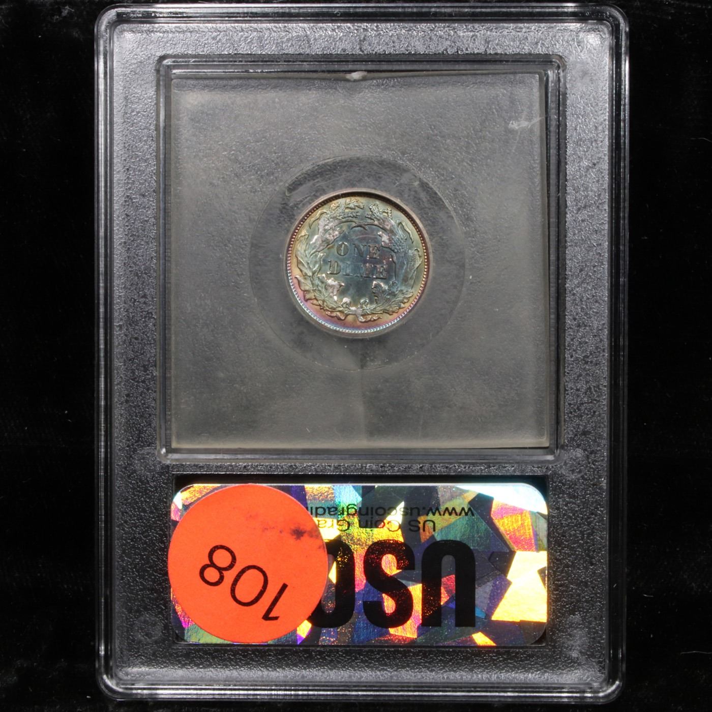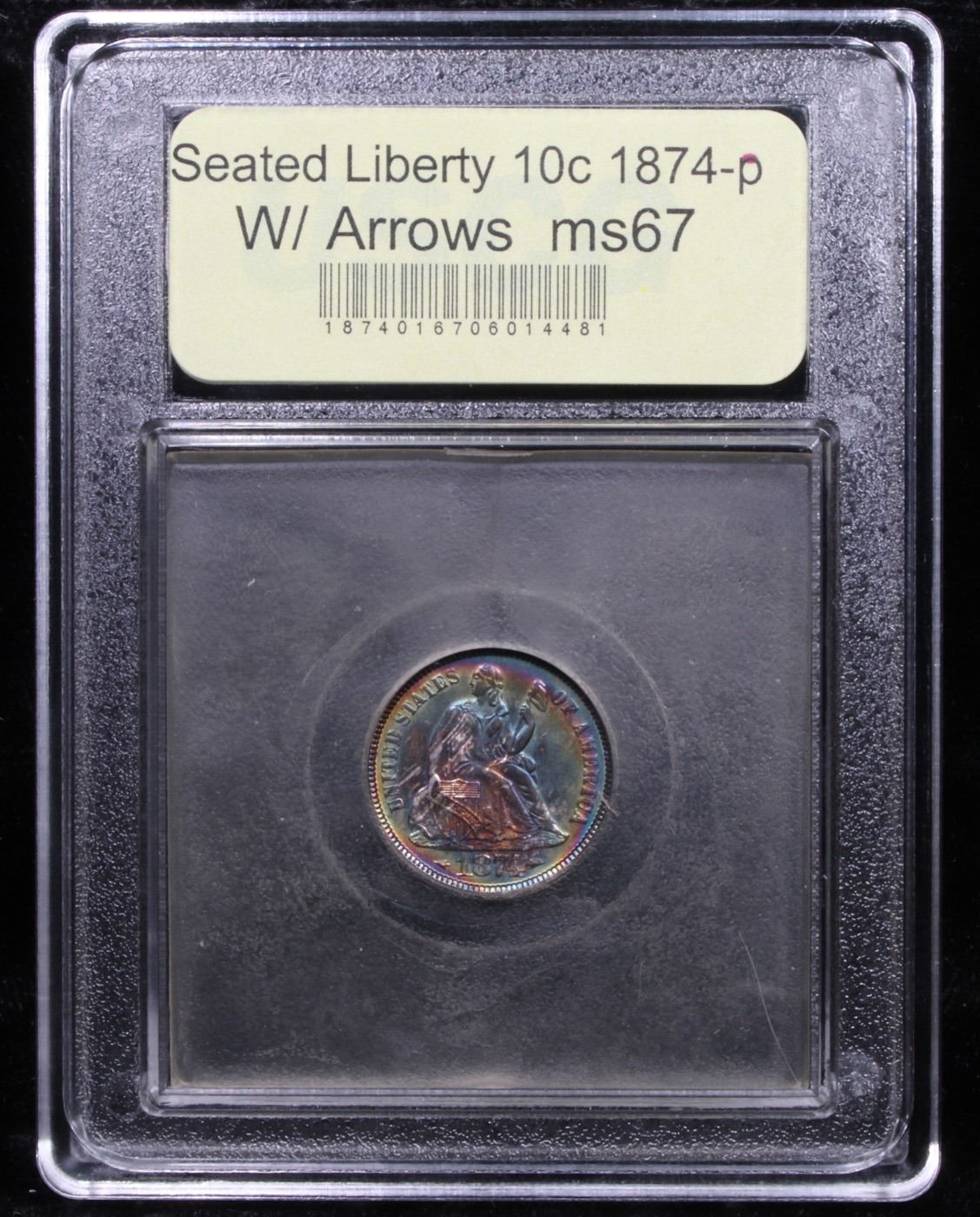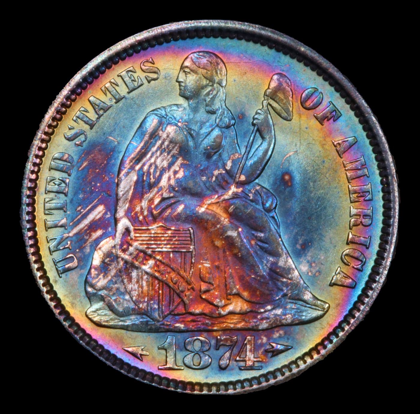 ***Auction Highlight*** 1874-p W/ Arrows Rainbow Toned Seated Liberty Dime 10c Graded GEM++ Unc BY USCG. Exceptional vivid multicolored toning is seen on both sides of this lovely coin. Shades of blue, red, gold and pink provide outstanding visual appeal. Here is a frosty, sharply struck and expertly preserved Superb Gem that would do justice to the finest type set or Liberty Seated dime collection. One of the provisions of the Coinage Act of February 12, 1873 -- often called the "Crime of '73" -- was to increase the weight of the dime, quarter, and half dollar by a minuscule amount to bring them closer to the Latin Monetary Union in Europe. For the dime, this meant that the weight increased from 2.49 grams to 2.50 grams, an almost negligible change that would last until the cessation of circulating silver coins in 1964. The new coins were introduced later in 1873 and as in 1853, arrows were placed on either side of the date to indicate the heavier coins. The arrows were hand punched into each die, creating a wide variety of positional varieties, and some dies were so heavily polished that the arrows nearly disappear on some specimens. After less than two years the arrows were removed in 1874, creating a short-lived type. The 1874 Arrows dime is in constant demand by type coin specialists who seek examples to mark the design. Superb Gem Mint State examples of any Liberty Seated dime are notable, but are particularly challenging among 1874 dimes. The Superb Gem offered here ranks among the finest certified for both the type and issue, and will make a very appealing addition to a world class cabinet. A Corey's Pick, Bid to Win, Don't let it get Away, you might not find its equal Coin. I give this coin my highest recommendation