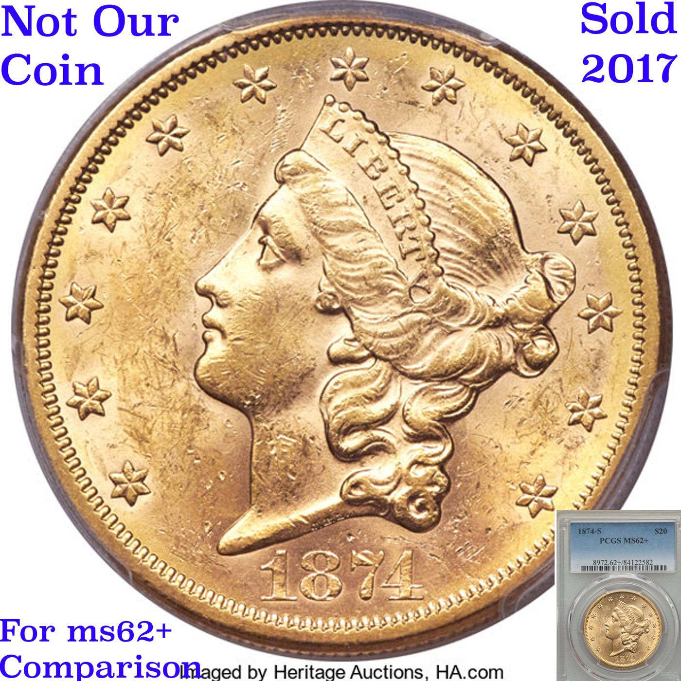 ***Auction Highlight*** 1874-s Gold Liberty Double Eagle $20 Graded Select Unc BY USCG.        Block S. Whether through exportation, melting, or circulation, few 1874-S survive in Mint State. Those that do are found in MS60 to MS61 roughly seven times more than those in MS62. The finest examples at PCGS and NGC are in MS63, only fractionally finer than the gorgeous honey-gold example offered here. Coruscating luster rolls over lightly marked surfaces, though abrasions are minimal for the grade. The obverse stars, curls, and feathers are as sharp as can be A Corey's Pick, Bid to Win, Don't let it get Away, you might not find its equal Coin.  I give this coin my highest recommendation