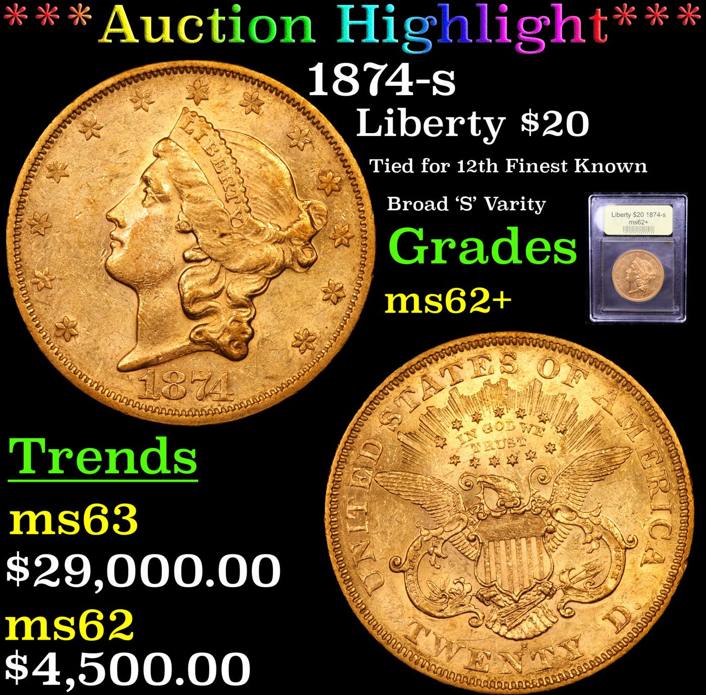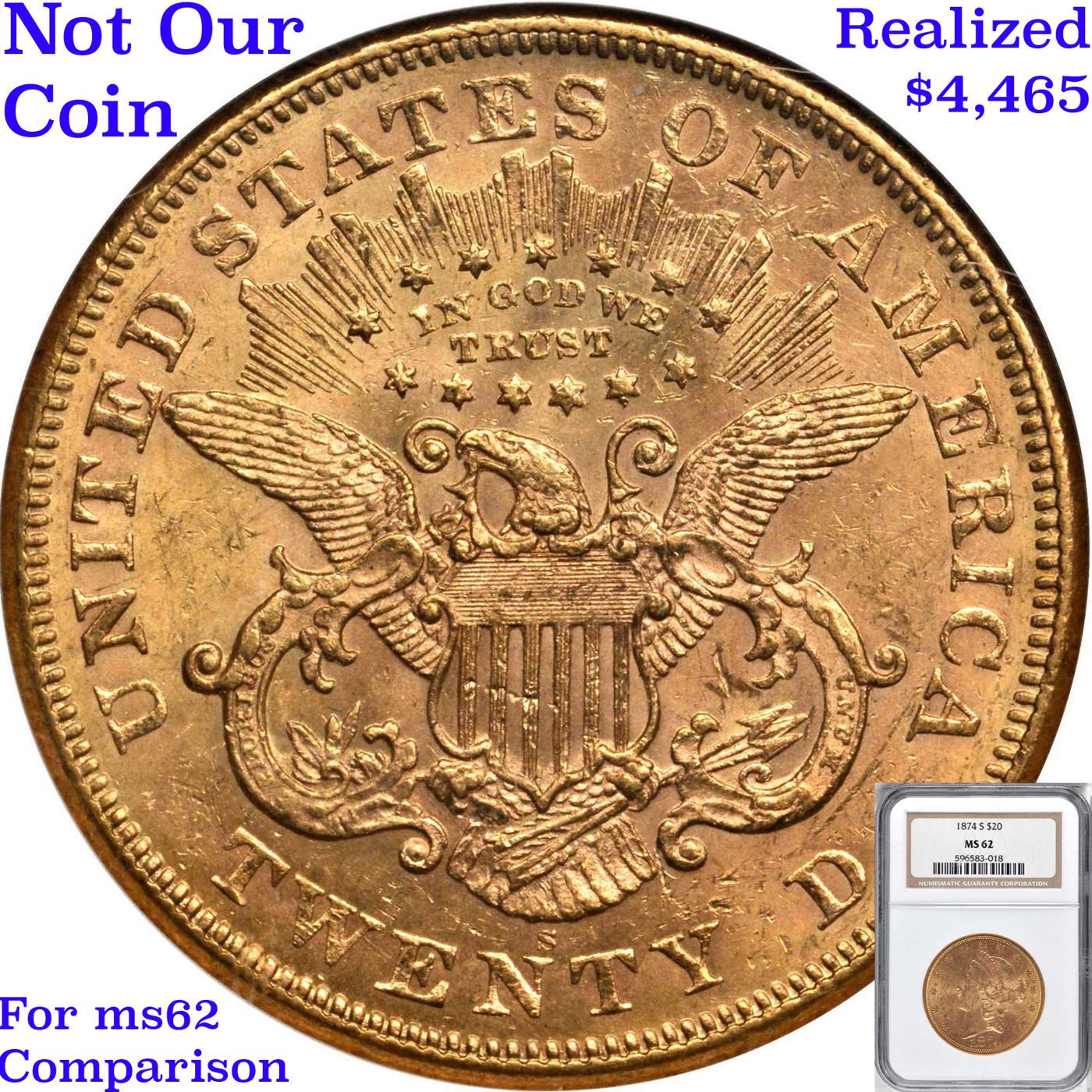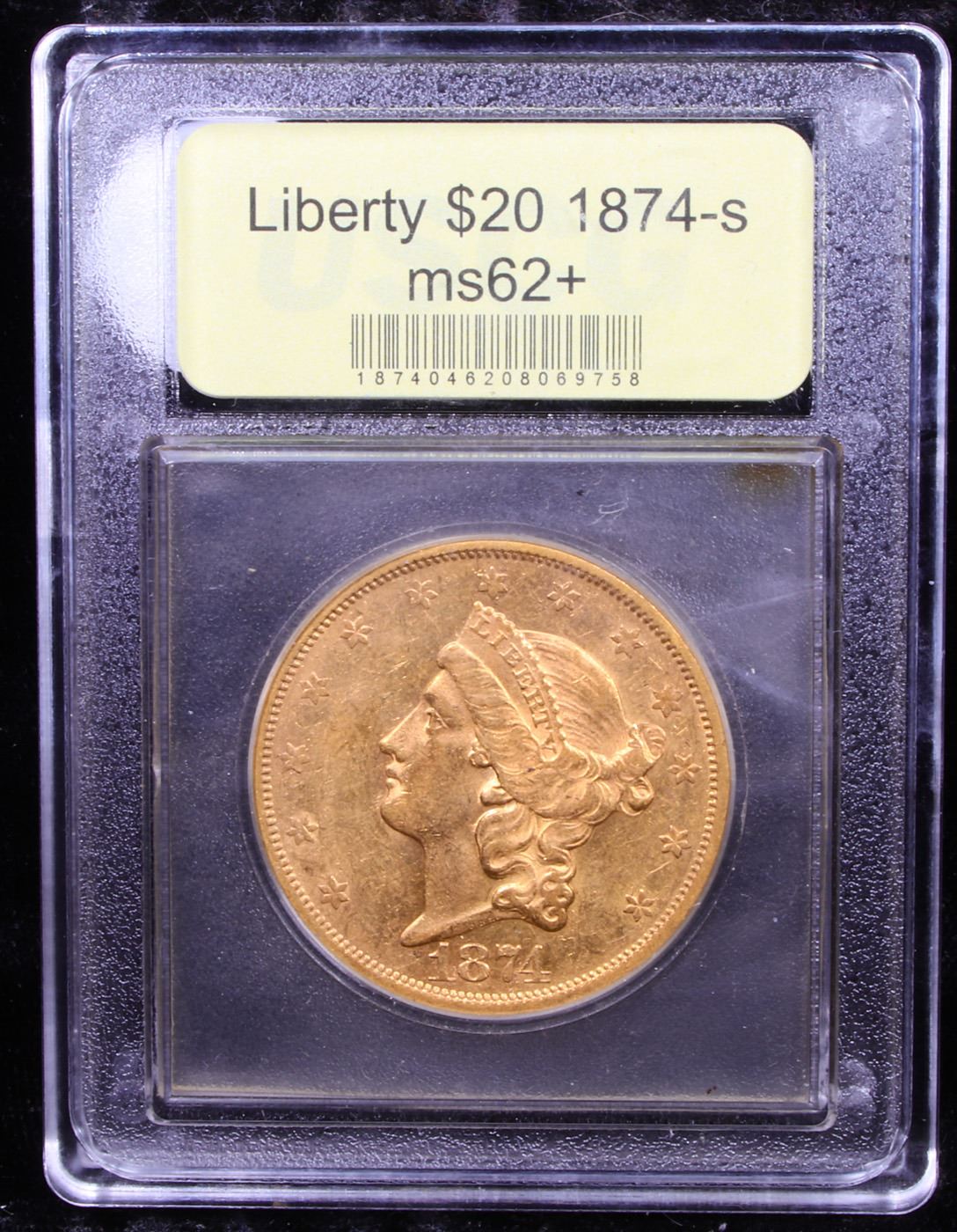 ***Auction Highlight*** 1874-s Gold Liberty Double Eagle $20 Graded Select Unc By USCG. Broad S Mintmark. The 1874-S Liberty double eagle features the popular Type Two design, with the motto IN GOD WE TRUST on the reverse. The 1874-S claims a large mintage of more than 1.2 million pieces, but the coins were released into circulation at the time of issue and few were saved for numismatic purposes. Unlike the earlier Type One issues, few Type Two double eagles have been recovered from recent shipwreck finds. As a result, most examples seen today are in circulated, or lower Mint State grades. The 1874-S is scarce in MS62 condition, and finer coins are condition rarities. This Plus-graded MS62 example combines attractive reddish-gold and lemon highlights over lightly marked, sun-gold surfaces. The design elements are sharply rendered, as expected for the issue. A Corey's Pick, Bid to Win, Don't let it get Away, you might not find its equal Coin. I give this coin my highest recommendation