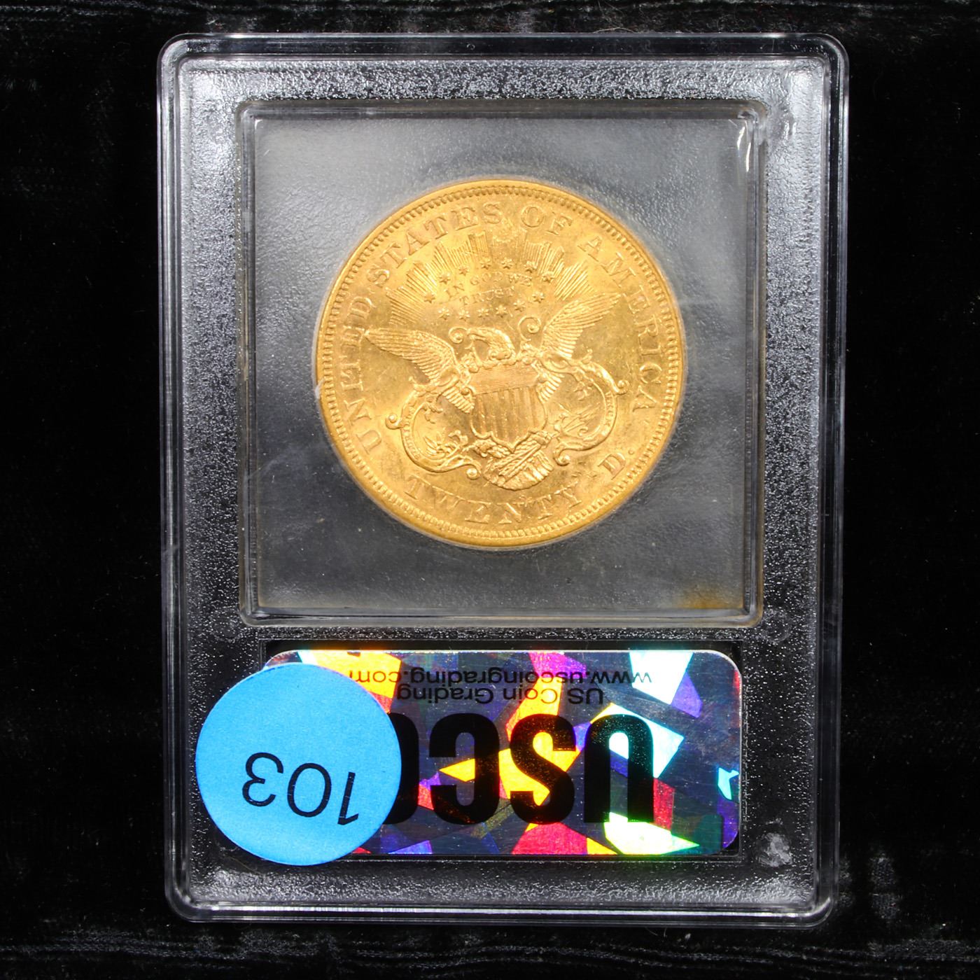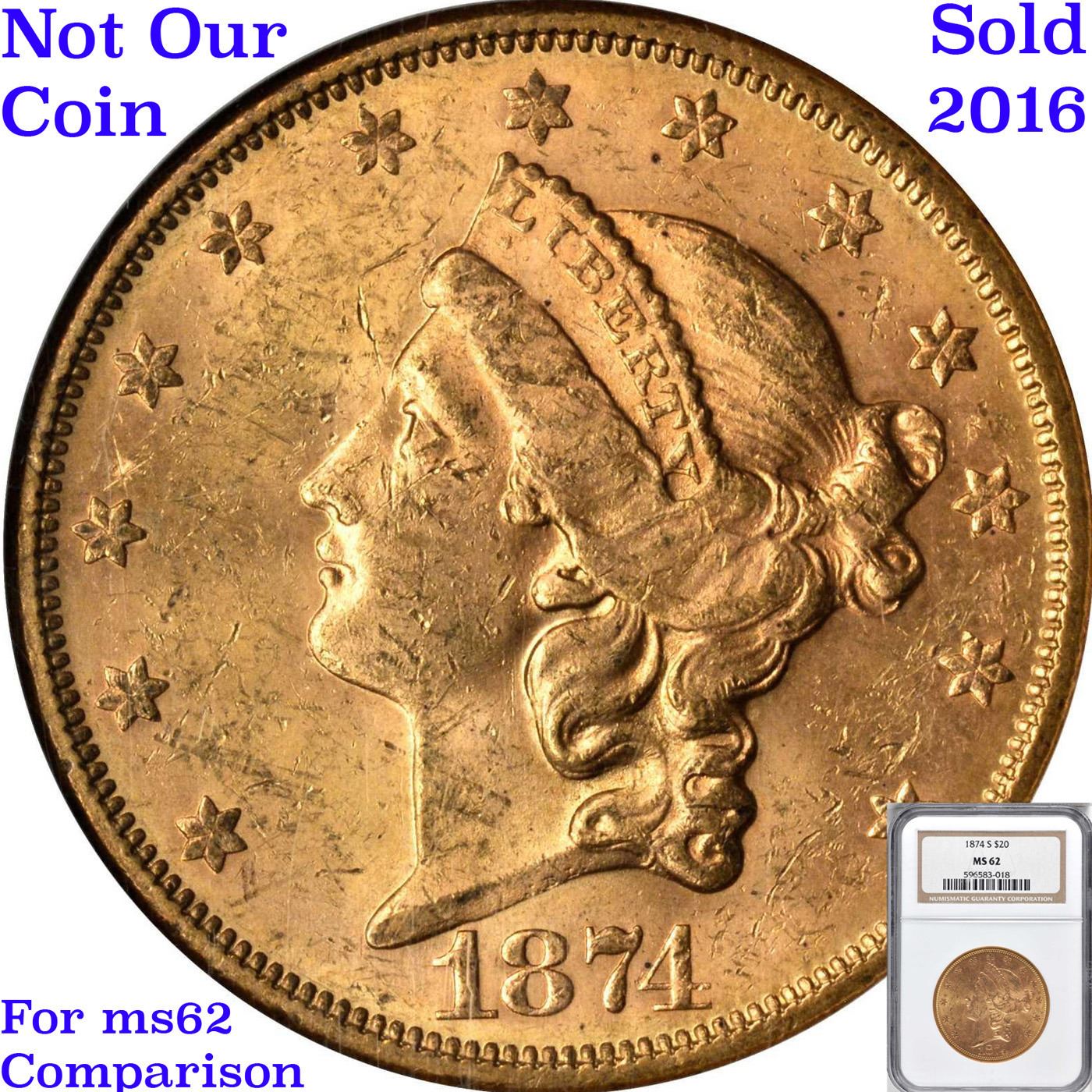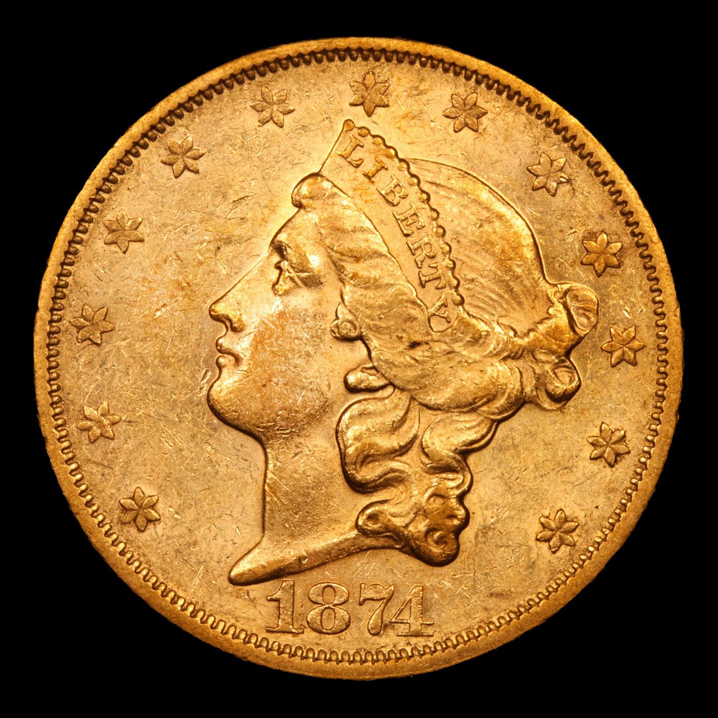 ***Auction Highlight*** 1874-s Gold Liberty Double Eagle $20 Graded Select Unc By USCG. Broad S Mintmark. The 1874-S Liberty double eagle features the popular Type Two design, with the motto IN GOD WE TRUST on the reverse. The 1874-S claims a large mintage of more than 1.2 million pieces, but the coins were released into circulation at the time of issue and few were saved for numismatic purposes. Unlike the earlier Type One issues, few Type Two double eagles have been recovered from recent shipwreck finds. As a result, most examples seen today are in circulated, or lower Mint State grades. The 1874-S is scarce in MS62 condition, and finer coins are condition rarities. This Plus-graded MS62 example combines attractive reddish-gold and lemon highlights over lightly marked, sun-gold surfaces. The design elements are sharply rendered, as expected for the issue. A Corey's Pick, Bid to Win, Don't let it get Away, you might not find its equal Coin. I give this coin my highest recommendation