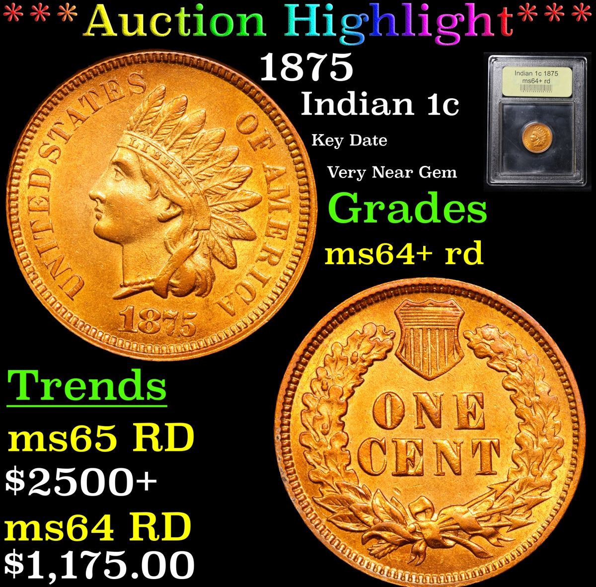 ***Auction Highlight*** 1875 Key Date Very Near Gem Indian Cent 1c Graded Choice+ Unc RD By USCG. According to Jaime Hernandez from PCGS, ÔThe 1875 Indian Cent is one of the scarcer issues in the series. This date gravitates more towards being one of the lower mintage issues in the series. Very scarce. With an original mintage of over 13.5 million; PCGS estimates that only 4000 survive in all grades. A Corey's Pick, Bid to Win, Don't let it get Away Coin
