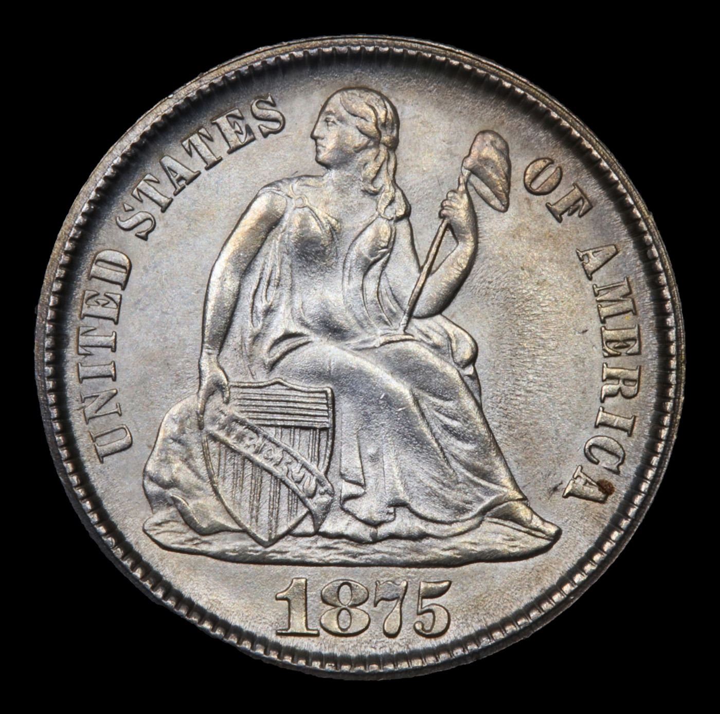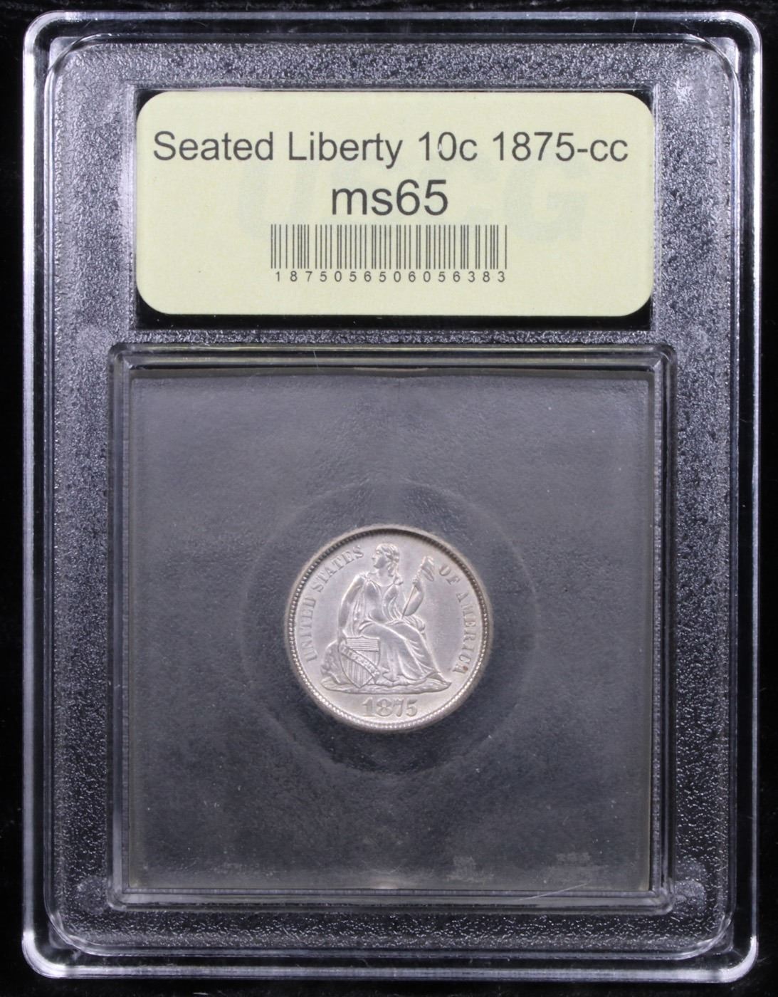***Auction Highlight*** 1875-cc Seated Liberty Dime 10c Graded GEM Unc By USCG. Attractive and smooth, this satiny Gem glitters with light golden iridescence and displays a bold strike overall. Desirable at the Gem grade level as this is one of the finer pieces known today and certainly stands tall for this particular issue. Furthermore, the Mintmark Below Bow style is much scarcer than the Mintmark Above Bow reverse style. For the date and mint collector or Carson City specialist, this is a coin that is sure to please for its eye appeal and quality. A Corey's Pick, Bid to Win, Don't let it get Away, you might not find its equal Coin