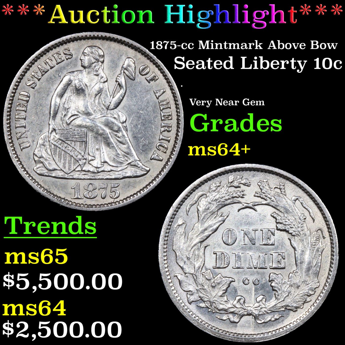 ***Auction Highlight*** 1875-cc Mintmark Below Bow Seated Liberty Dime 10c Graded ms64+ BY SEGS. A Corey's Pick, Bid to Win Coin