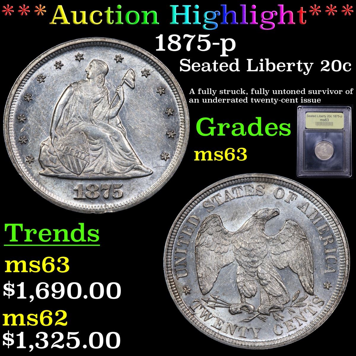 ***Auction Highlight*** 1875-p Twenty Cent Piece 20c Graded Select Unc By USCG. A fully struck, fully untoned survivor of an underrated twenty-cent issue. Satiny in texture and suitably vibrant for the assigned grade, there is not much separating this piece from an even higher Choice rating. The 1875 is the first of only two circulation strike twenty-cent pieces attributed to the Philadelphia Mint. With only 38,500 coins struck, it is far more elusive than the 1875-S in all grades. This enticing piece will appeal to series specialists as well as better-date type collectors A Corey's Pick, Bid to Win, Don't let it get Away Coin