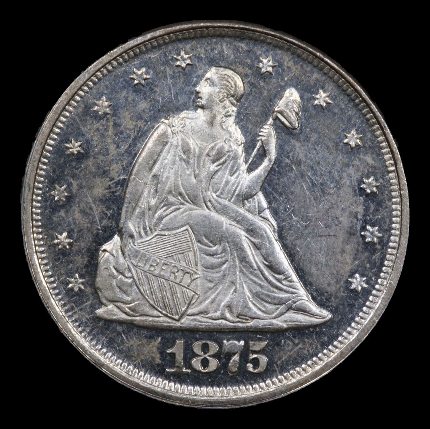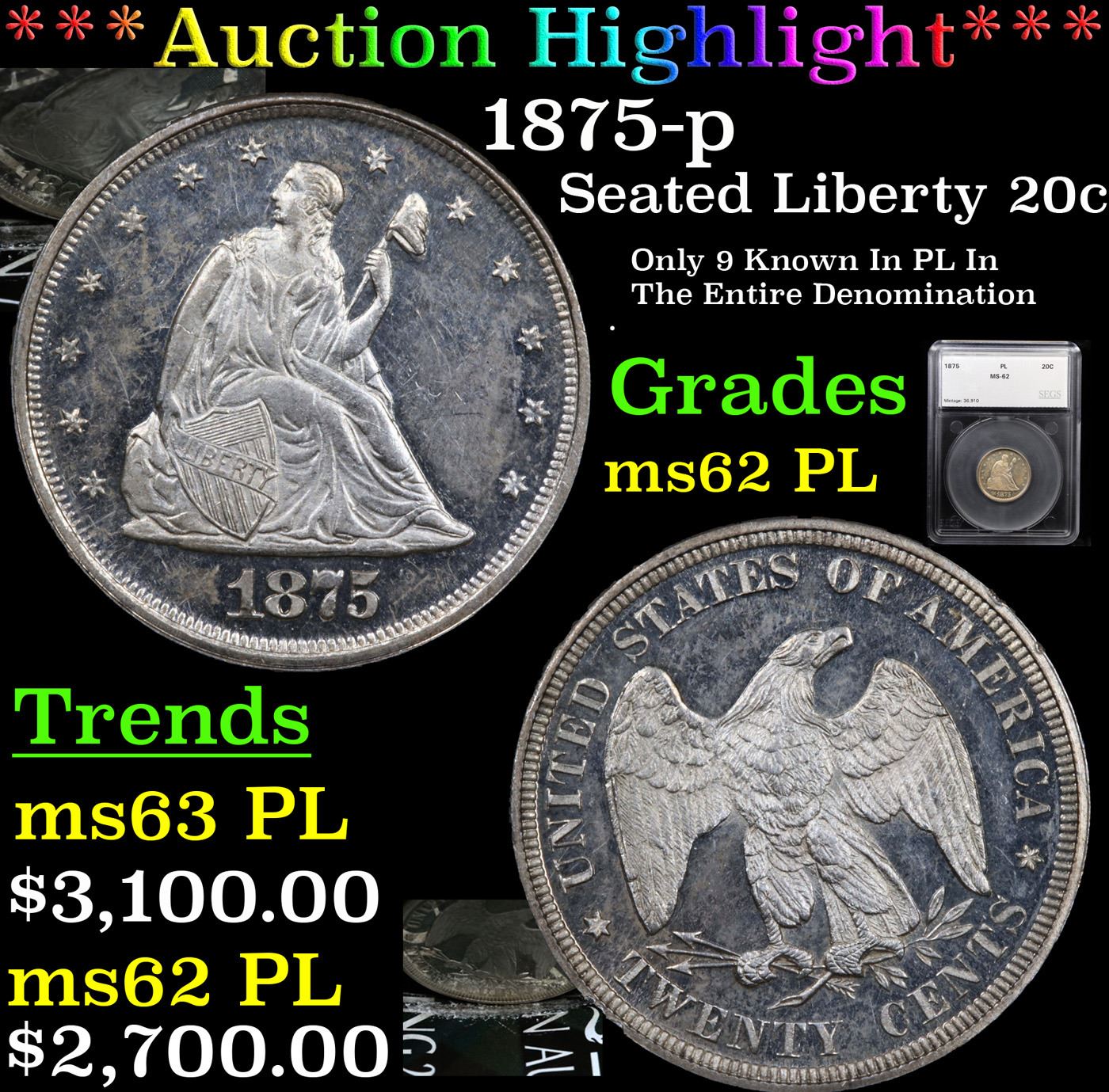***Auction Highlight*** 1875-p Twenty Cent Piece 20c Graded ms62 PL By SEGS. Up for Auction is an Incredibly Rare 1875-p Proof Like Twenty Cent Piece. To Date SEGS has only ever graded 1 20c Piece as PL, NGC Has certified 6 1875-p as PL, 2 in au58, 1 in each 61-63. PCGS to date has certified no 20c piece as PL except a single 1876-p as ms61 PL. None of these NINE PL example have EVER come to Auction...Until Today. We are proud to present the first Proof Like Example of the 20c Piece to be brought to public Auction. The example at hand has heavily frosted devices with mirror like fields. Fully Proof Like with Abrasions in the field customary with the grade. Nive cameo contrast. A Corey's Pick, Bid to Win, Don't let it get Away Coin