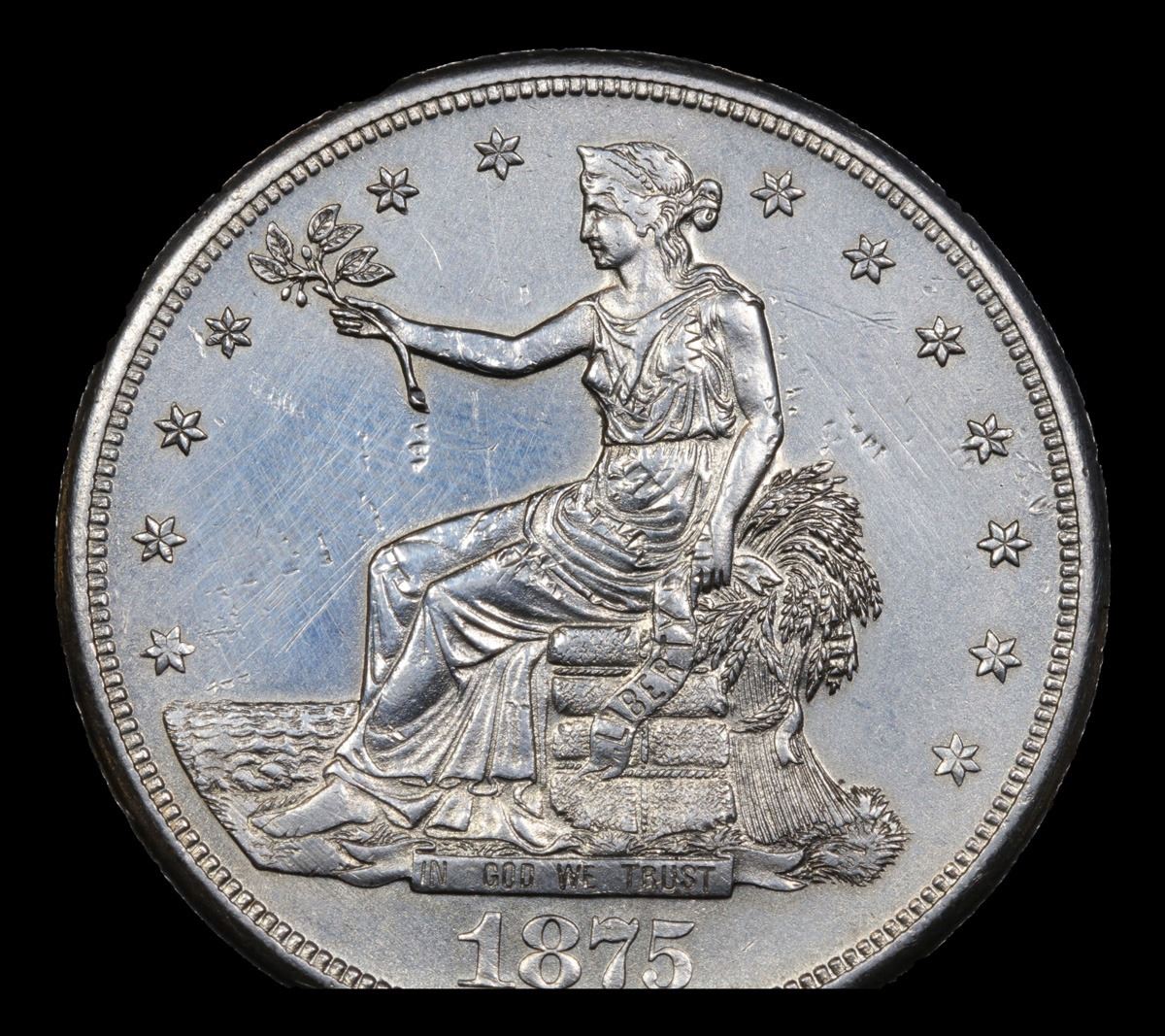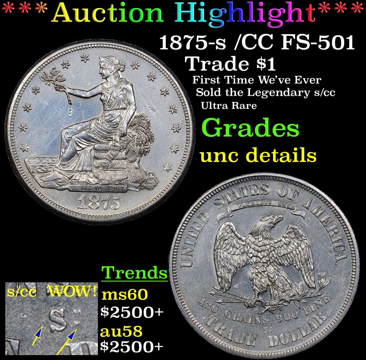 ***Auction Highlight*** 1875-s /CC FS-501 Trade Dollar $1 Grades Unc Details. Up for auction for the very first time by Sandi and me is the Legendary 1875-s s/cc Trade Dollar. Per Ron Guth at PCGS �The 1875-S over CC Trade Dollar is one of a group of interesting and unexpected varieties created when mint engravers used dies intended for one of the branch mints, then overpunched the mintmark with that from another. Thus, we see coins such as the 1875-S/CC Trade Dollar, the 1900-O/CC Morgan Dollar. and later issues such as the 1955-D/S Nickel, all of which are important coins to collectors. Currently, the 1875-S/CC is the only major Trade Dollar variety recognized by PCGS. As such, it is the rarest of all the Trade Dollars in Mint State, even edging out all of the celebrated CC issues. PCGS has only ever certified 79 coins as the s/cc. For some reason at least two Carson City reverse dies of the Type I style, with tall CC letters, had the CC mintmark partially effaced and overpunched with an S mintmark. This issue was generally unknown to numismatists until the early 1960s. One of the earliest market appearances of the variety was in New Netherlands Coin Company's sale of December 10-11, 1963; In his Encyclopedia, p. 468, Walter H. Breen credits the discovery to C.H. Farrar, who published the variety in the Numismatic Scrapbook. Today, it is considered to be scarce in lower grades and quite rare in Mint State. As it is the most significant die variety in the trade dollar series. In Mint State, the 1875-S/CC is considered to be slightly rarer than the famous 1878-CC.