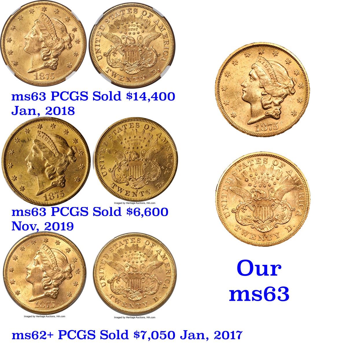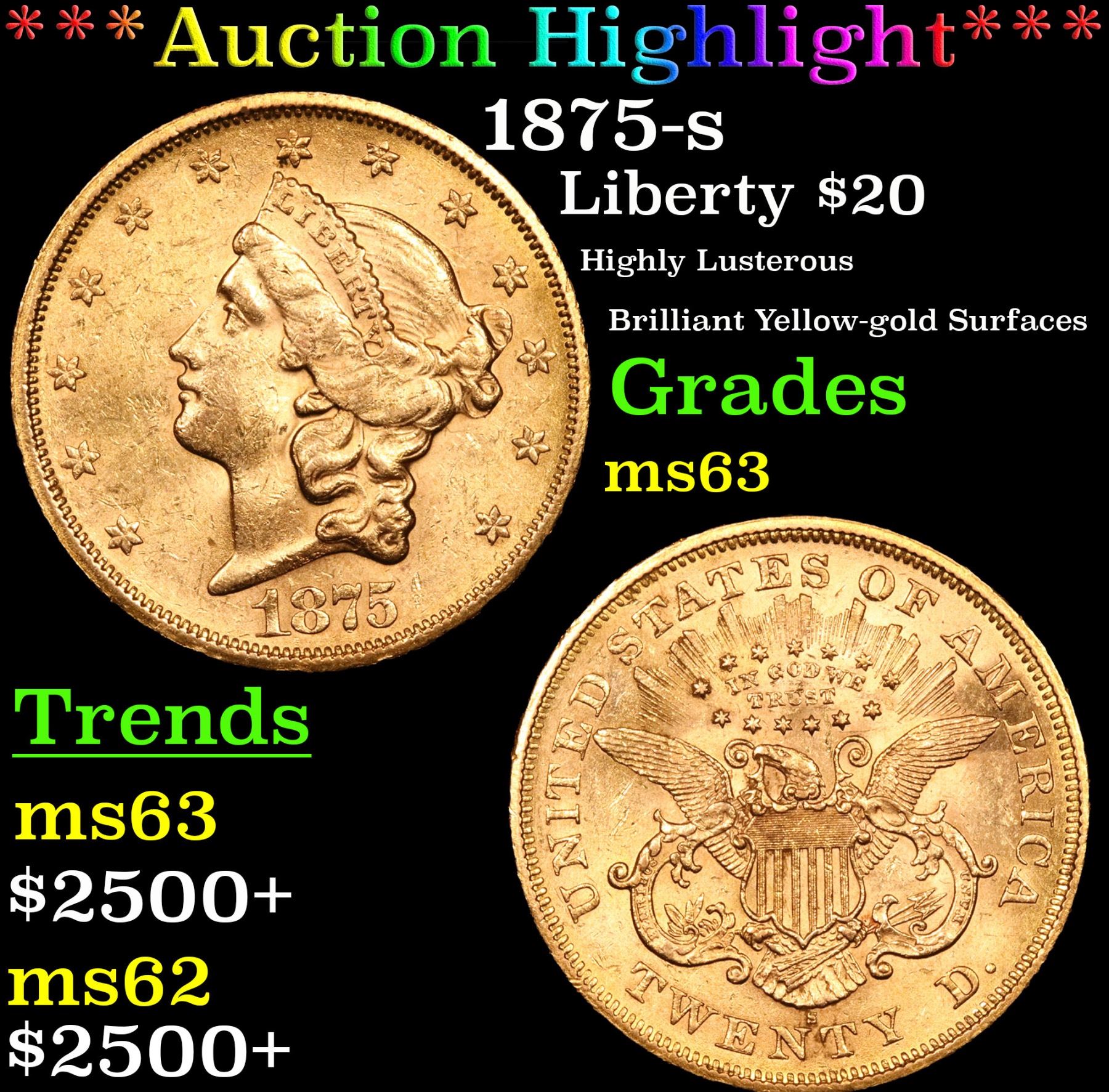 ***Auction Highlight*** 1875-s Gold Liberty Double Eagle $20 Graded Select Unc By USCG.        Up for auction is a Great 1875-S $20 Gold Double Eagle. This splendid Select Mint State San Francisco Mint double eagle is a lovely representative of the Type Two design that features the motto IN GOD WE TRUST inside the constellation of stars on the reverse with the denomination spelled TWENTY D. This piece is highly lustrous with brilliant yellow-gold surfaces that exhibit trivial, grade-consistent marks on each side. I have included 3 other examples graded by PCGS and NGC that sold at auction in the last 3 years for your comparison to condition.