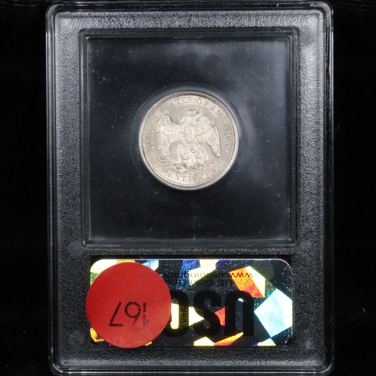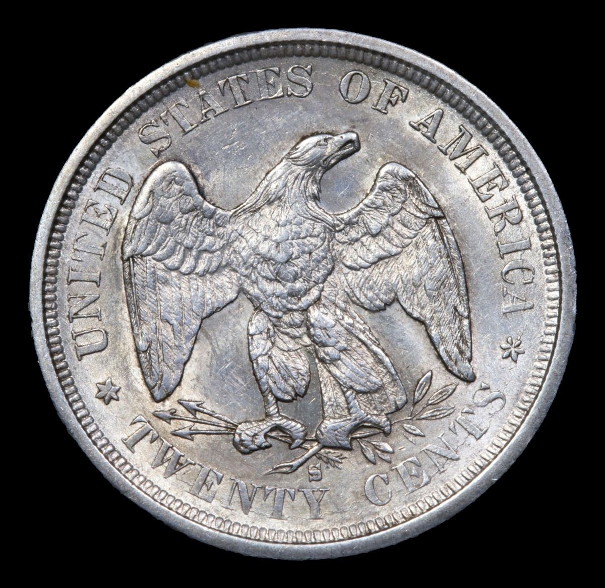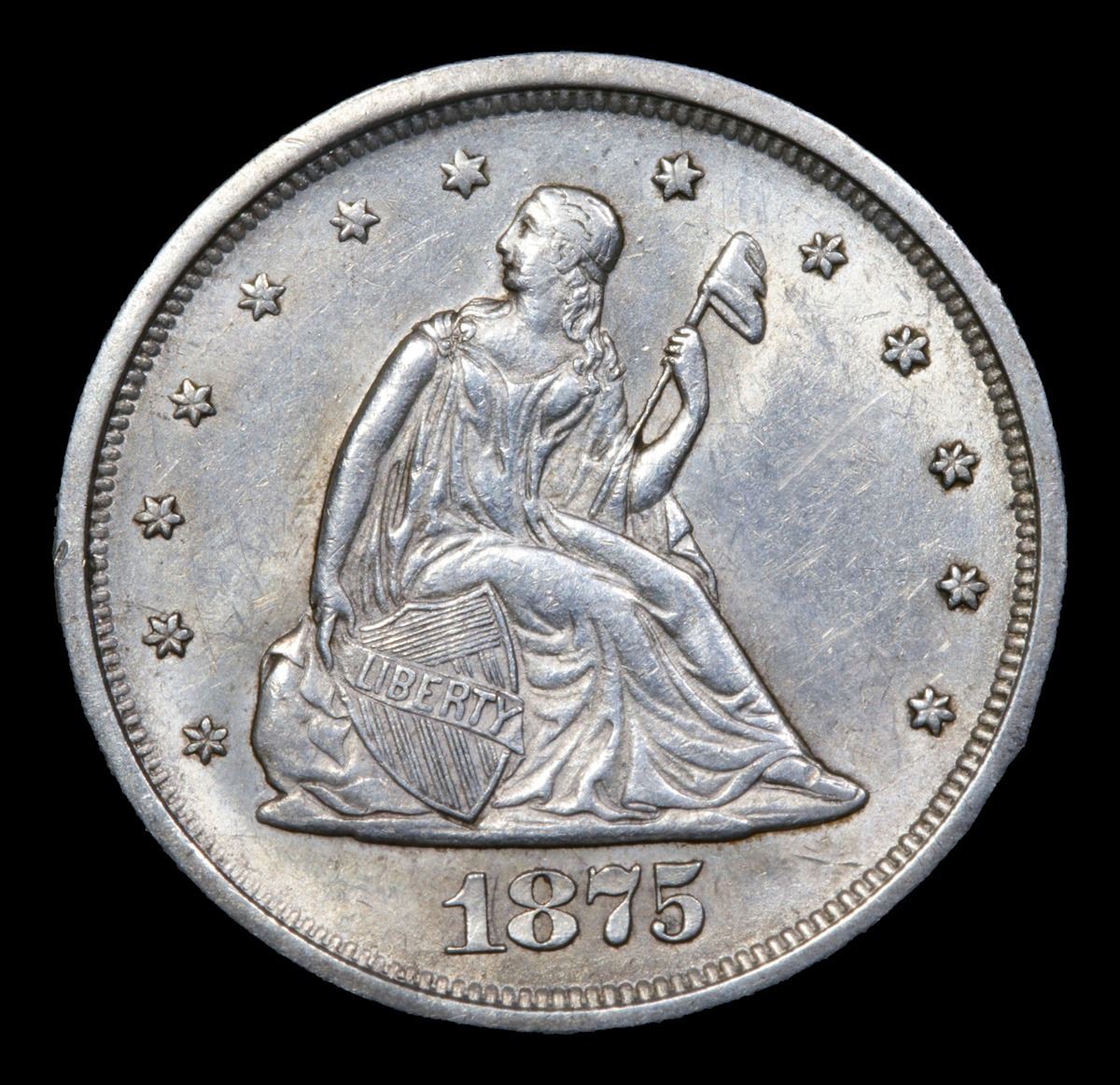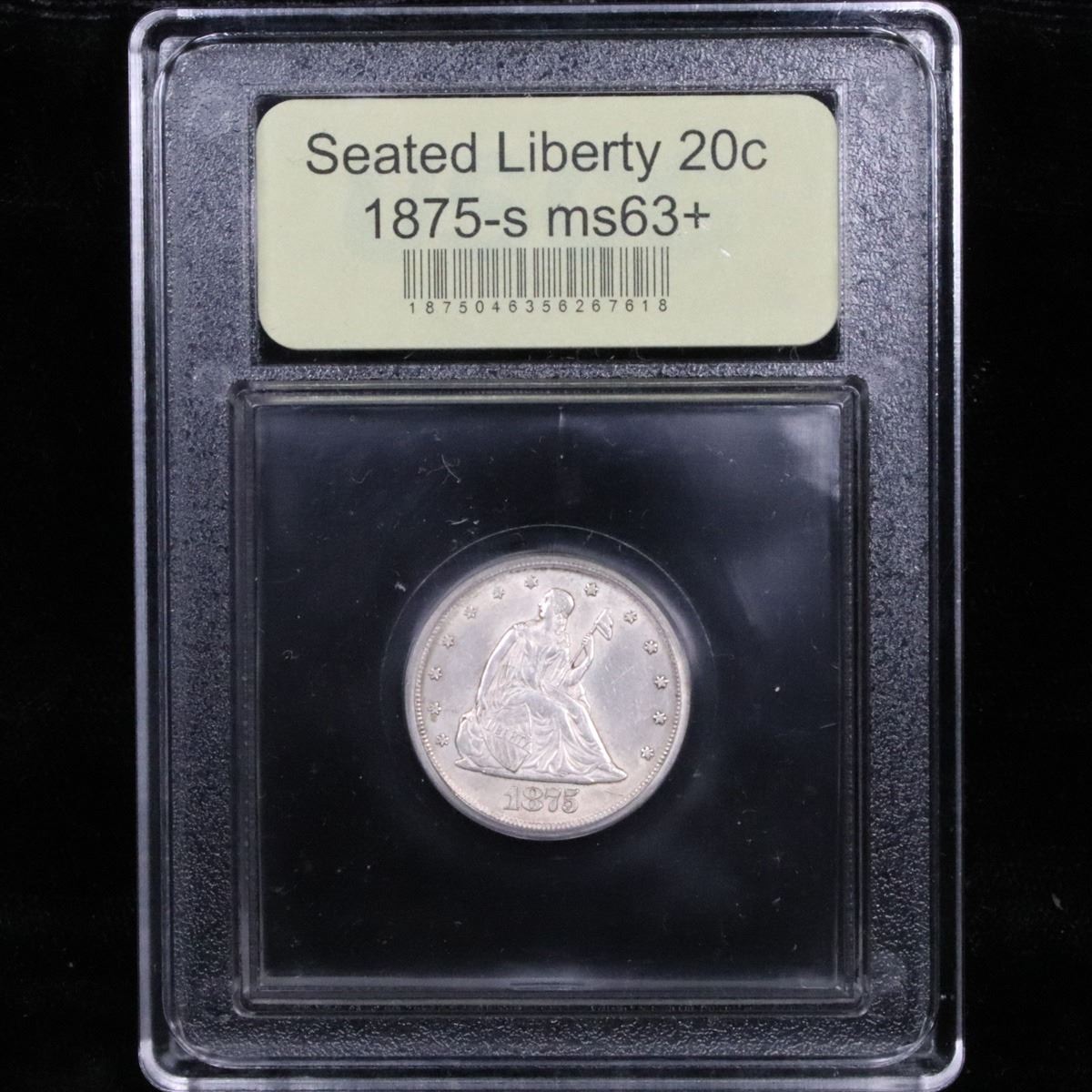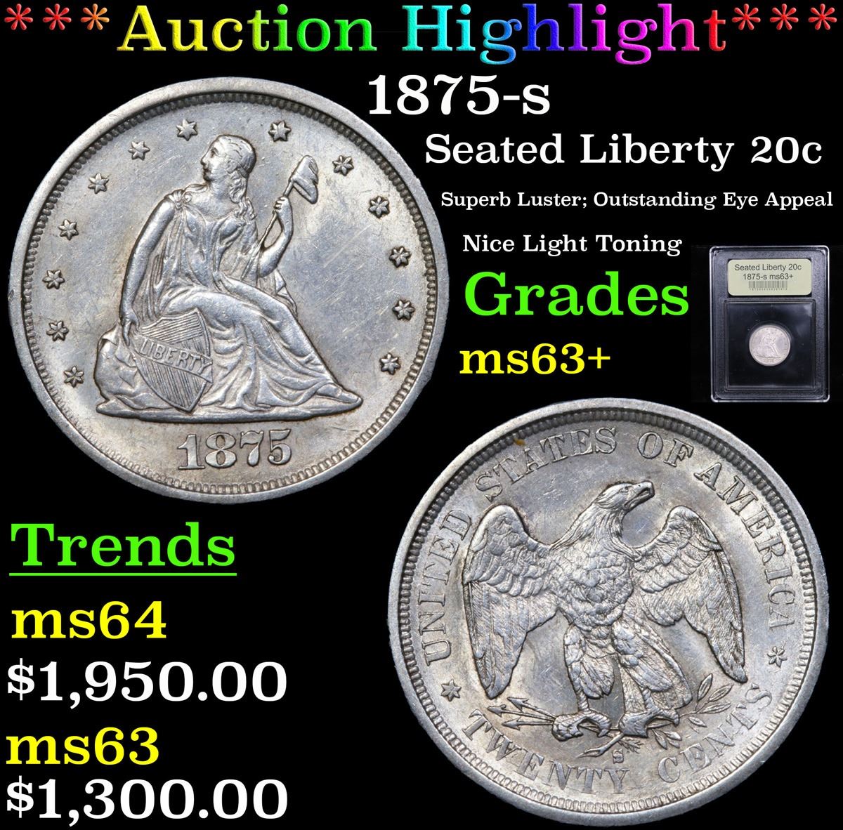 ***Auction Highlight*** 1875-s Superb Luster; Outstanding Eye Appeal Nice Light Toning Twenty Cent Piece 20c Graded Select+ Unc By USCG. Super Fully struck example. Most of the uncirculated examples of the 20c piece have little detail in the center of the eagles breast. This is a terrific fully struck exception. A great find. A Corey's Pick, Bid to Win, Don't let it get Away Coin