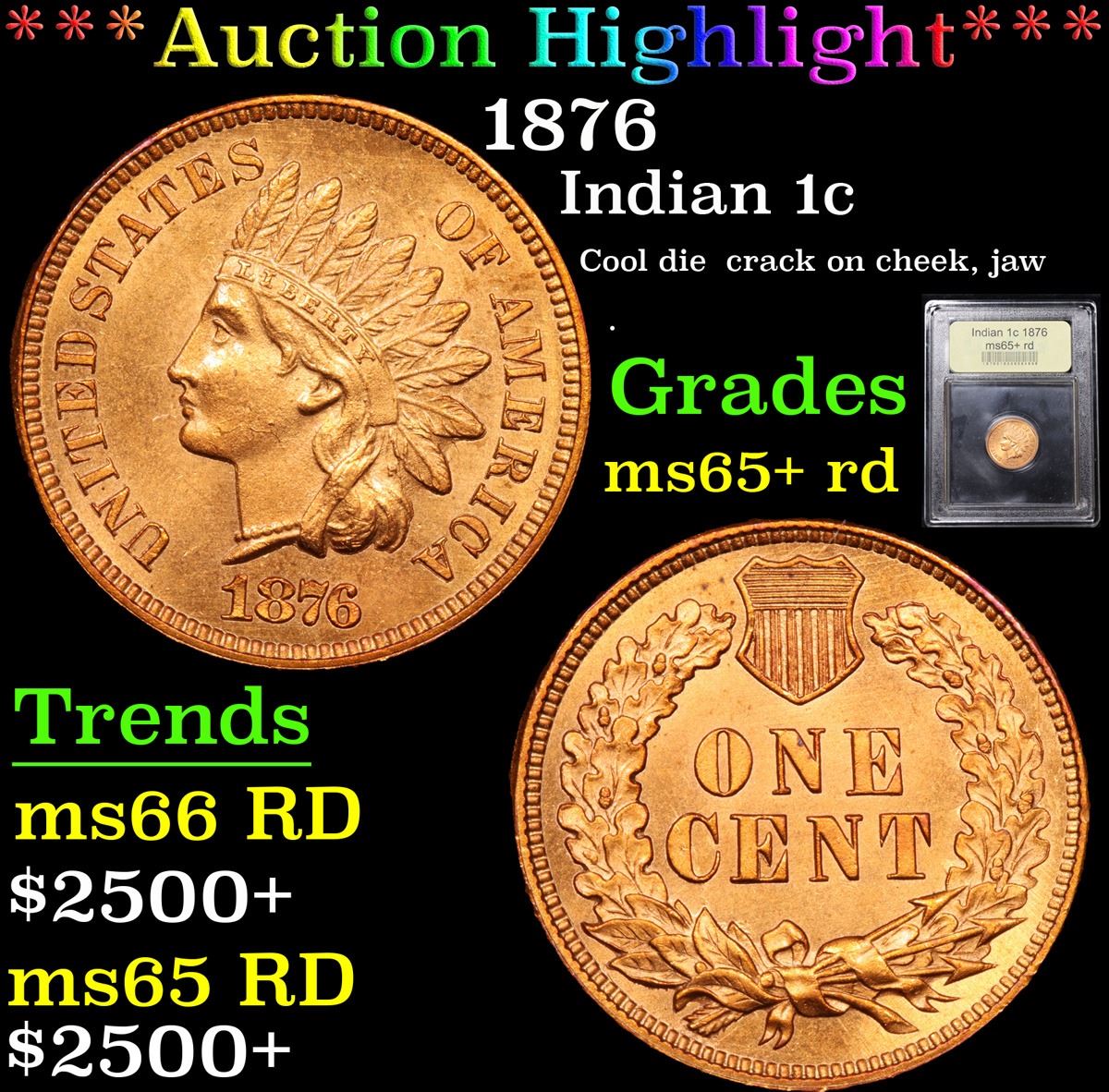 ***Auction Highlight*** 1876 Cool die crack on cheek, jaw . Indian Cent 1c Graded Gem+ Unc RD By USCG. very scarce date. PCGS estimates that only 5000 survive in all grades A Corey's Pick, Bid to Win, Don't let it get Away Coin