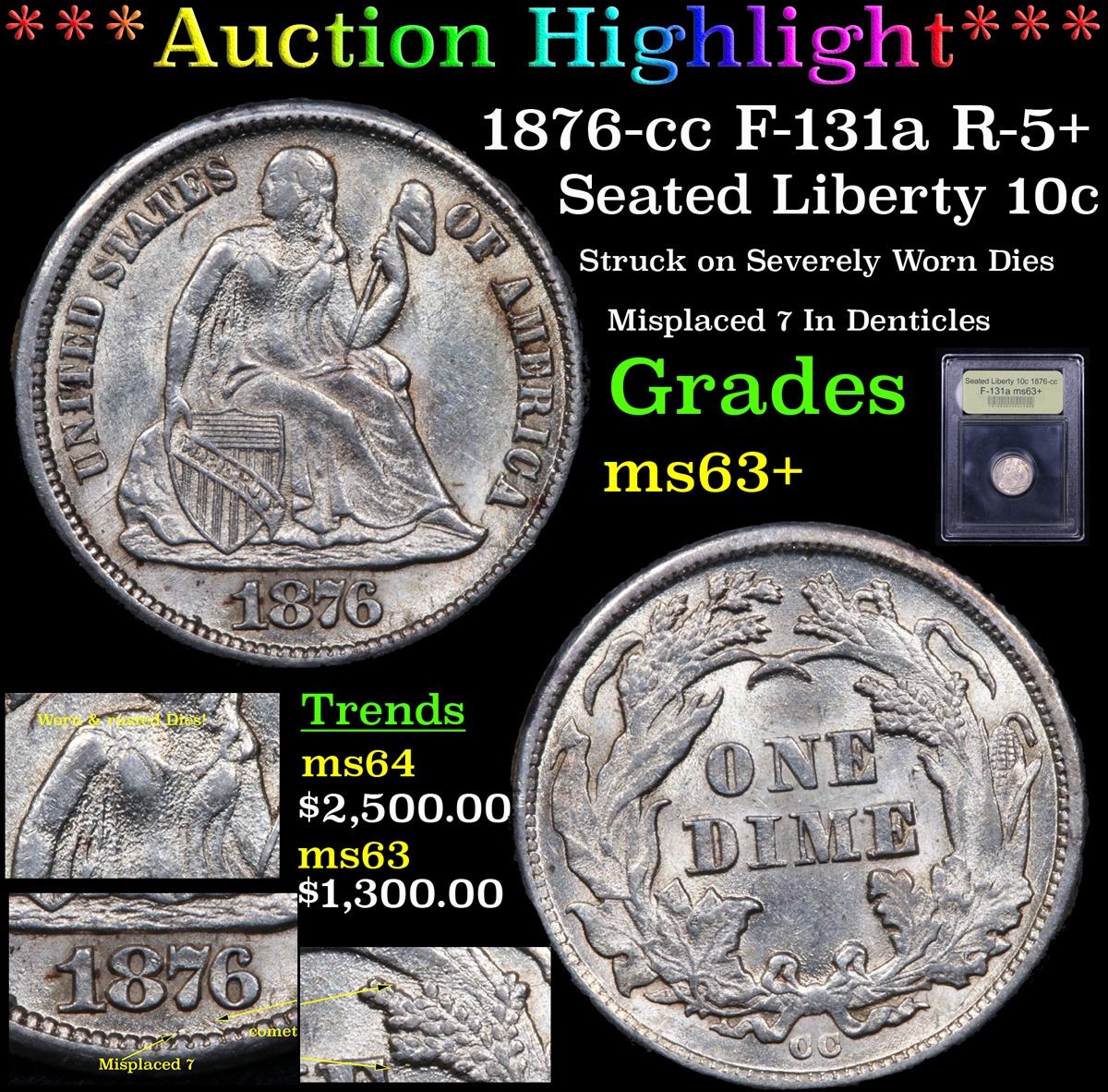 ***Auction Highlight*** 1876-cc F-131a R-5+ Seated Liberty Dime 10c Graded Select+ Unc By USCG. 0 Up for Auction is an exceptionally rare variety of the 1876-cc. It is the Fortin 131A R-5+ It was struck on severely worn and rusted dies. It has a misplaced 7 in the denticles, as well as comet die gouge under the date. Very cool and scarce coin.