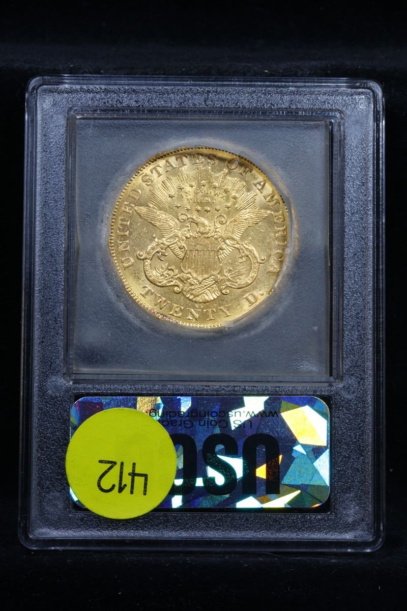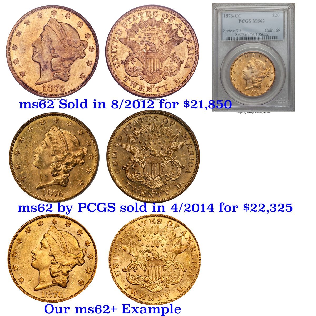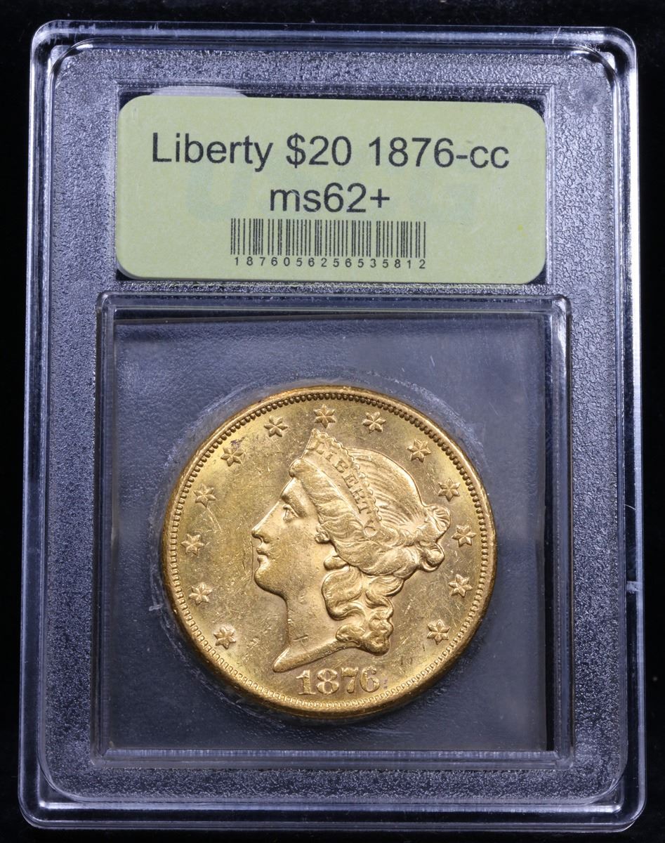 ***Auction Highlight*** 1876-cc Gold Liberty Double Eagle $20 Graded Select Unc By USCG. Up for Auction is the one of the Finest known 1876-cc Liberty $20 Gold Double Eagles. PCGS has never graded an 1876-cc any higher than ms62. NGC has graded 1 in ms64, 4 in ms63. Ours would therefore be the sole holder of the 6th finest known. The only known obverse die of the 1876-CC double eagle is characterized by a large date logotype with the digit 1 centered between the base of Liberty's portrait and the denticles. Conversely, there are two reverse dies known, that of the Winter 1-A marriage displaying a small, round, compact CC mintmark. The first C is centered over the left serif of the right upright of the letter N in TWENTY while the second C is over the extreme right edge of the same letter and extends nearly to the left edge of the adjacent letter T. A Bright orange-gold survivor, this impressive coin sports vibrant satin to semi-proof like luster. Modest, yet appreciable reflectivity seen in the fields on the obverse. Overall boldly defined, the minor lack of detail for which this issue is known is generally confined to the lowermost hair curls near the base of Liberty's portrait. There are few singularly conspicuous abrasions, and none are out of context with the assigned grade. The finest certified at PCGS, and a solid 5th finest at NGC. I am including a photo of 2 separate ms62 PCGS examples, one sold in 2012 for $21,850 and the other in 2014 for $22,325. Good Luck in obtaining this superb example.. A Corey's Pick, Bid to Win, Don't let it get Away Coin
