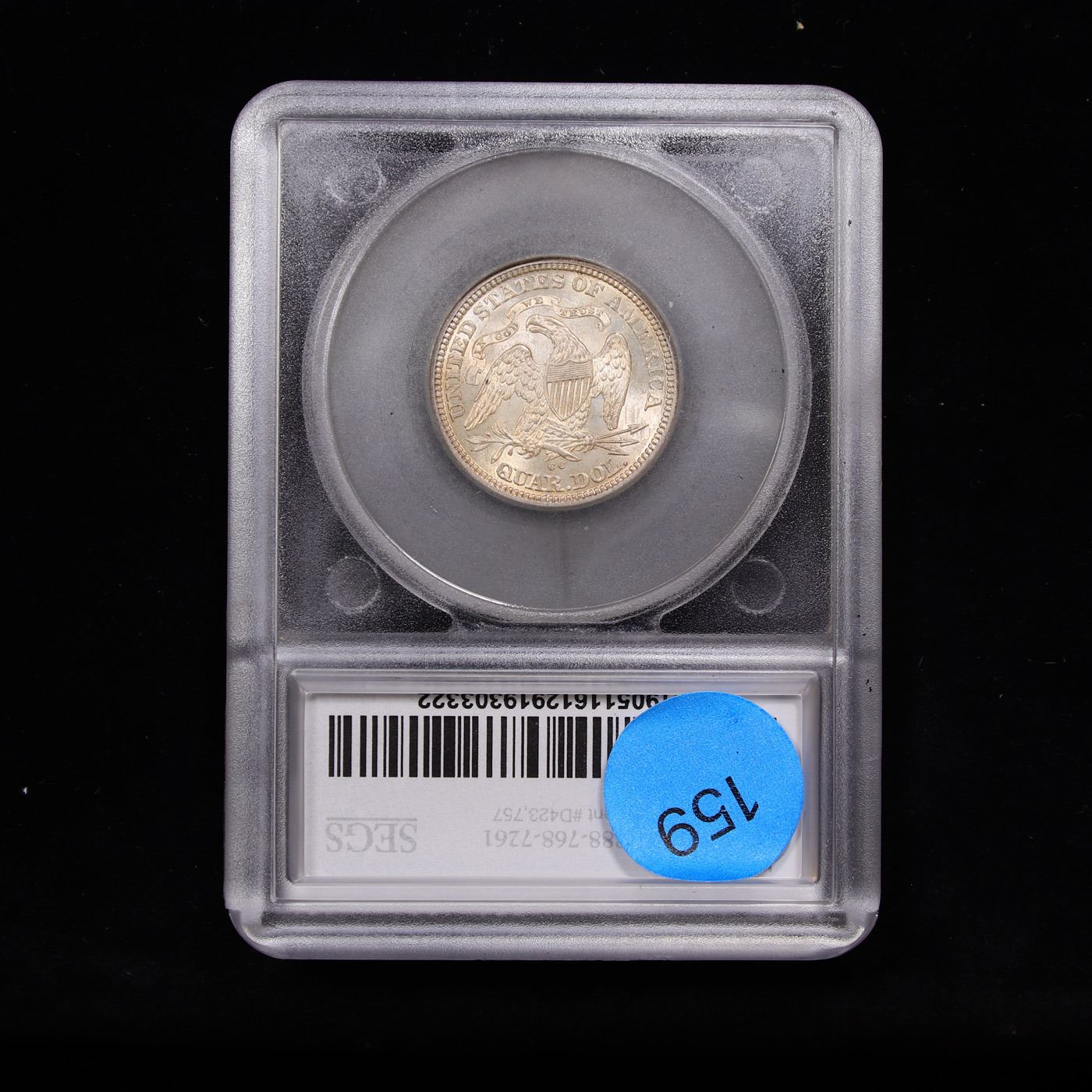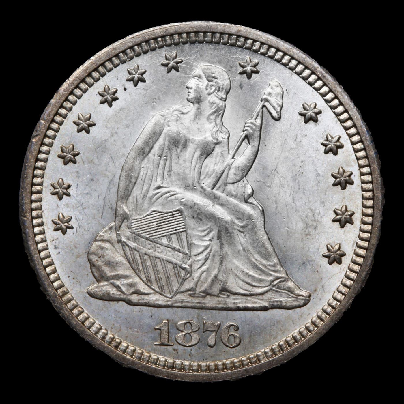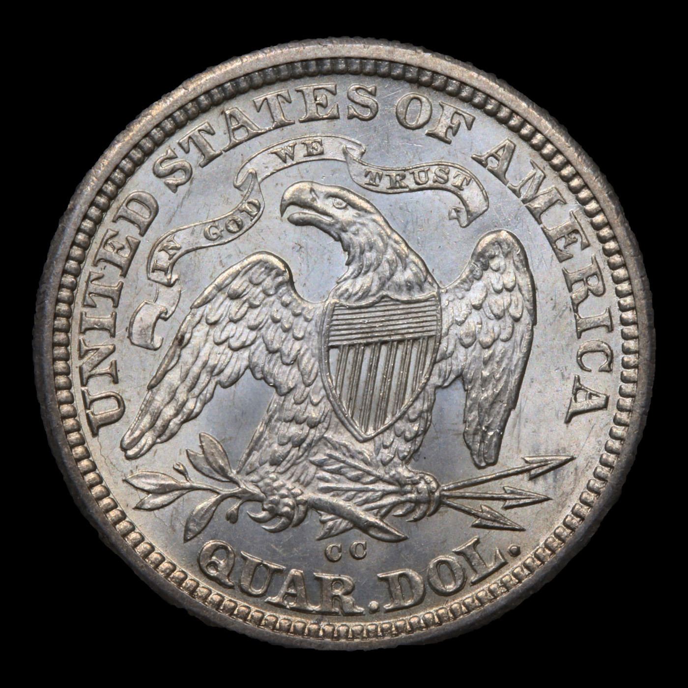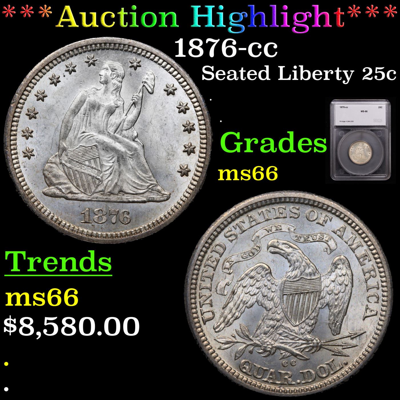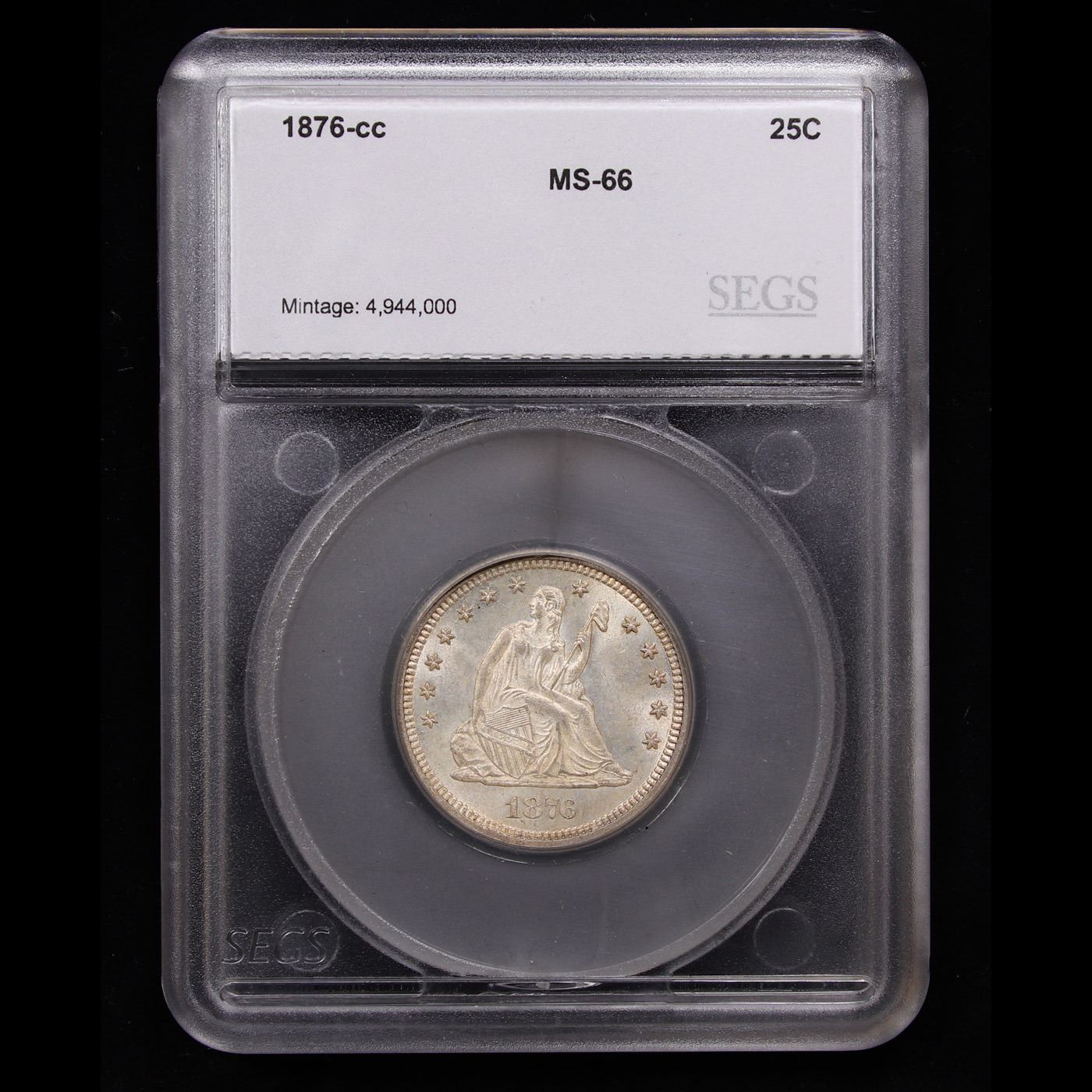 ***Auction Highlight*** 1876-cc Seated Liberty Quarter 25c Graded ms66 By SEGS. Small CC. After the limited Carson City quarter dollar mintages of the first few years, production spiked substantially upward, with numerous high-grade survivors. Beginning in 1875, most Carson City coins are much more plentiful than earlier-dated issues. This beautiful Premium Gem is fully lustrous with bold design details and satin surfaces, enhanced by near proof like relectivity in the fields.