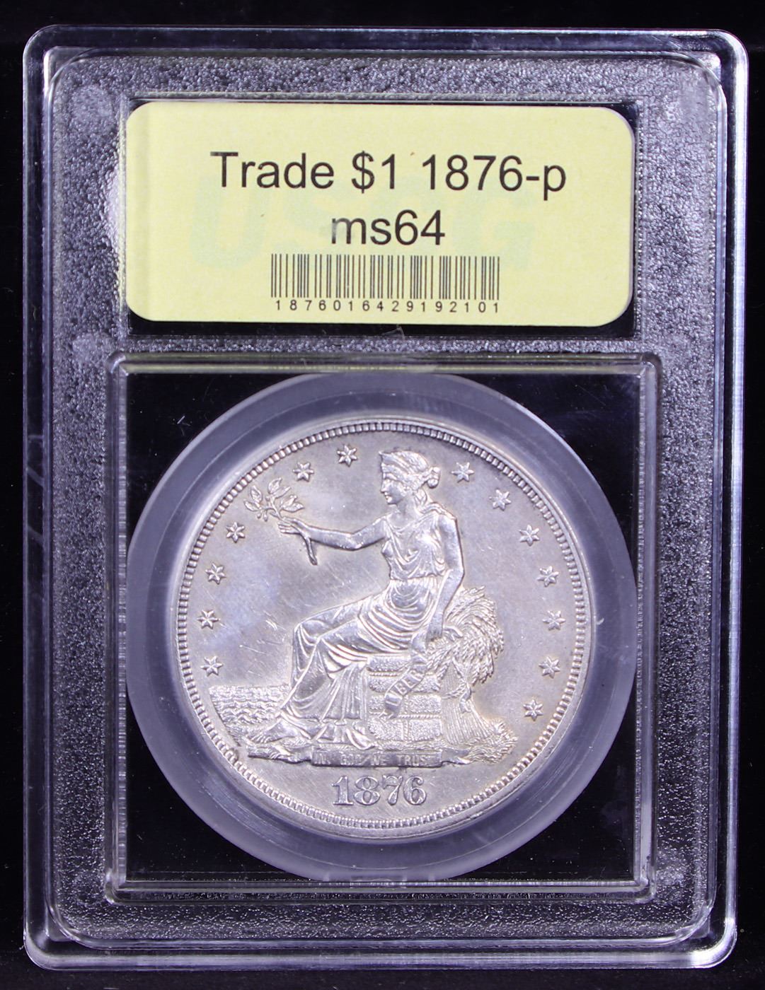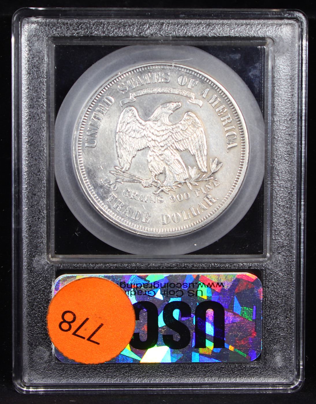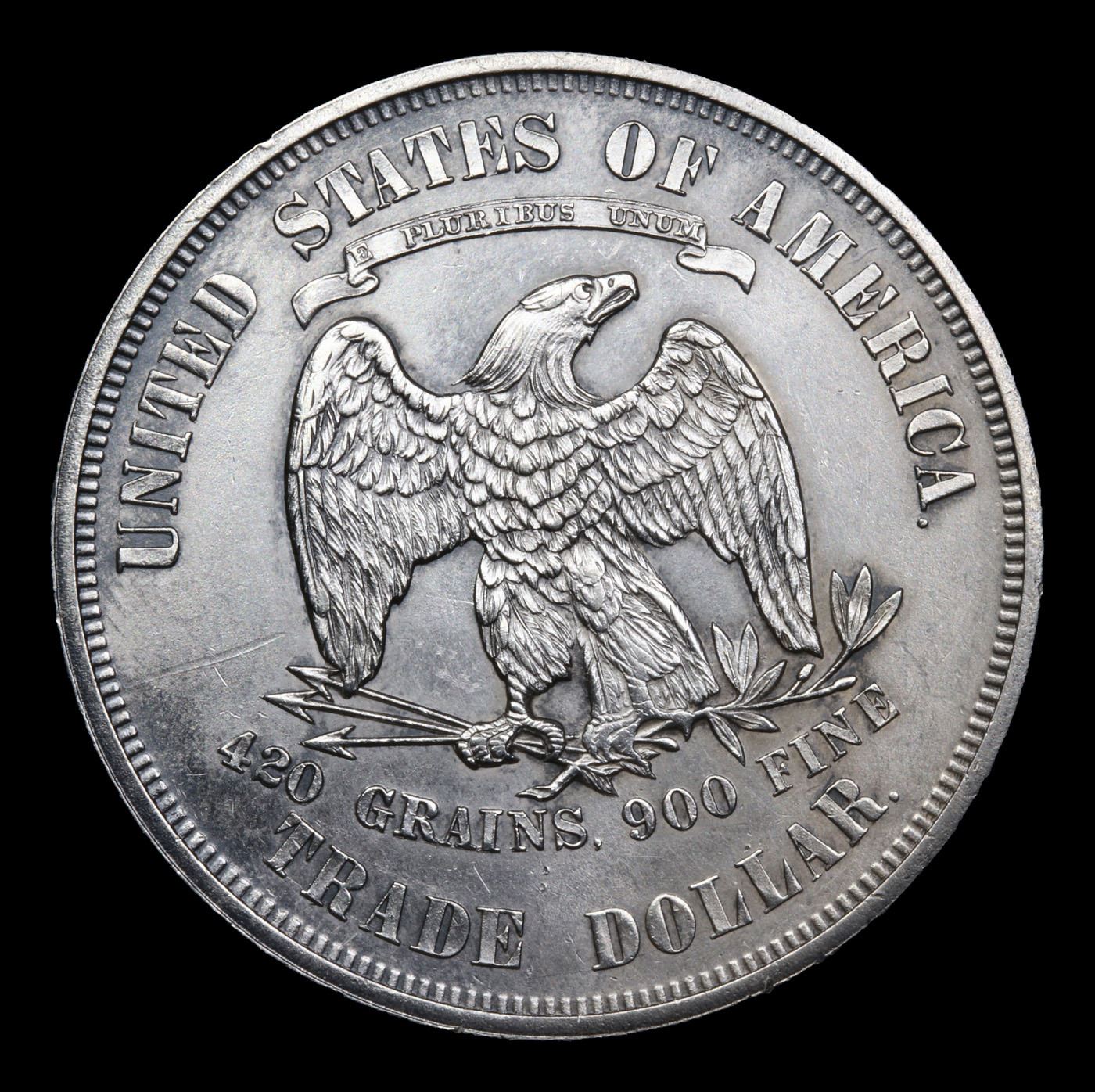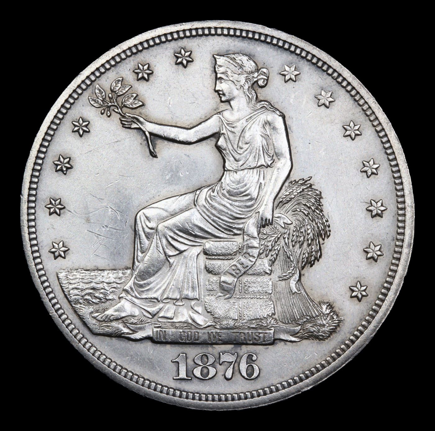 ***Auction Highlight*** 1876-p Trade Dollar $1 Graded Choice Unc By USCG. No period after FINE (scarce as such). The strike is sharp on both sides of this ms64 1876, one of 455,000 Trade dollars struck in the Centennial year. We note some light hairlines under magnification. The fields are fully frosted and lustrous with no obvious signs of transport to the Orient. Attractive untoned silver grey surfaces.