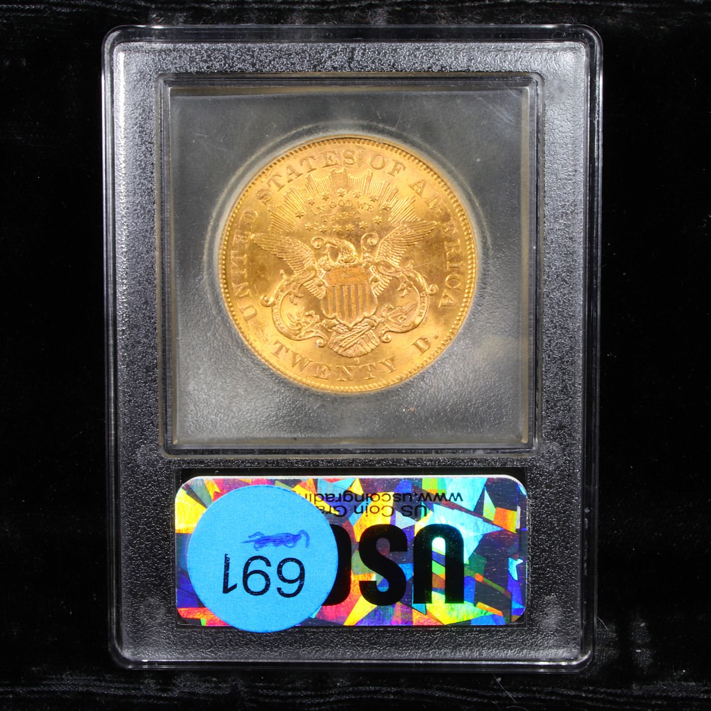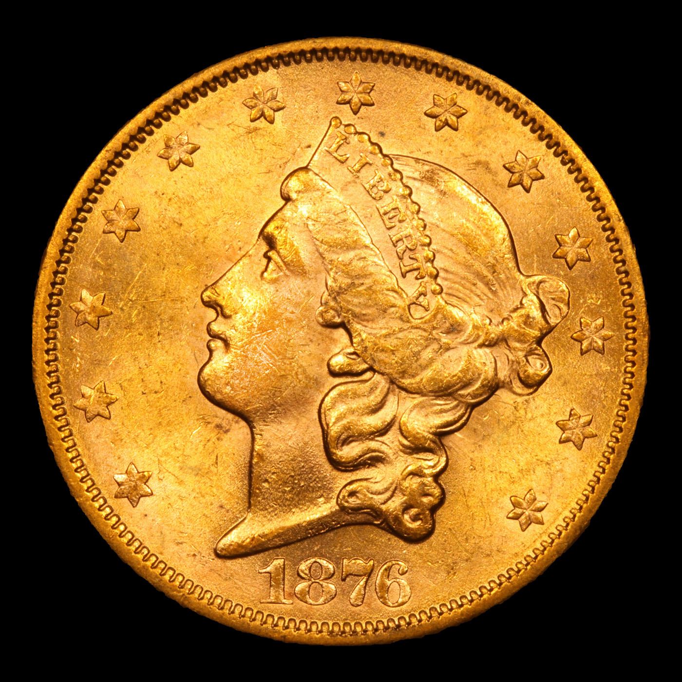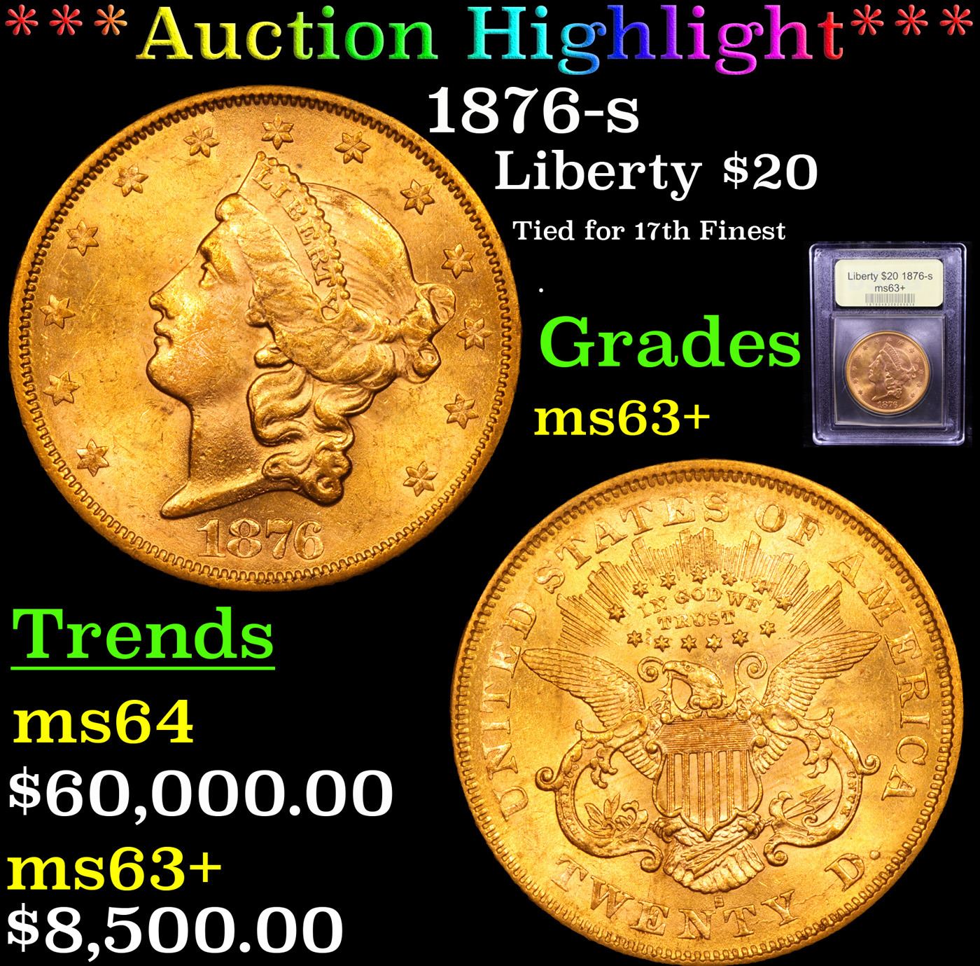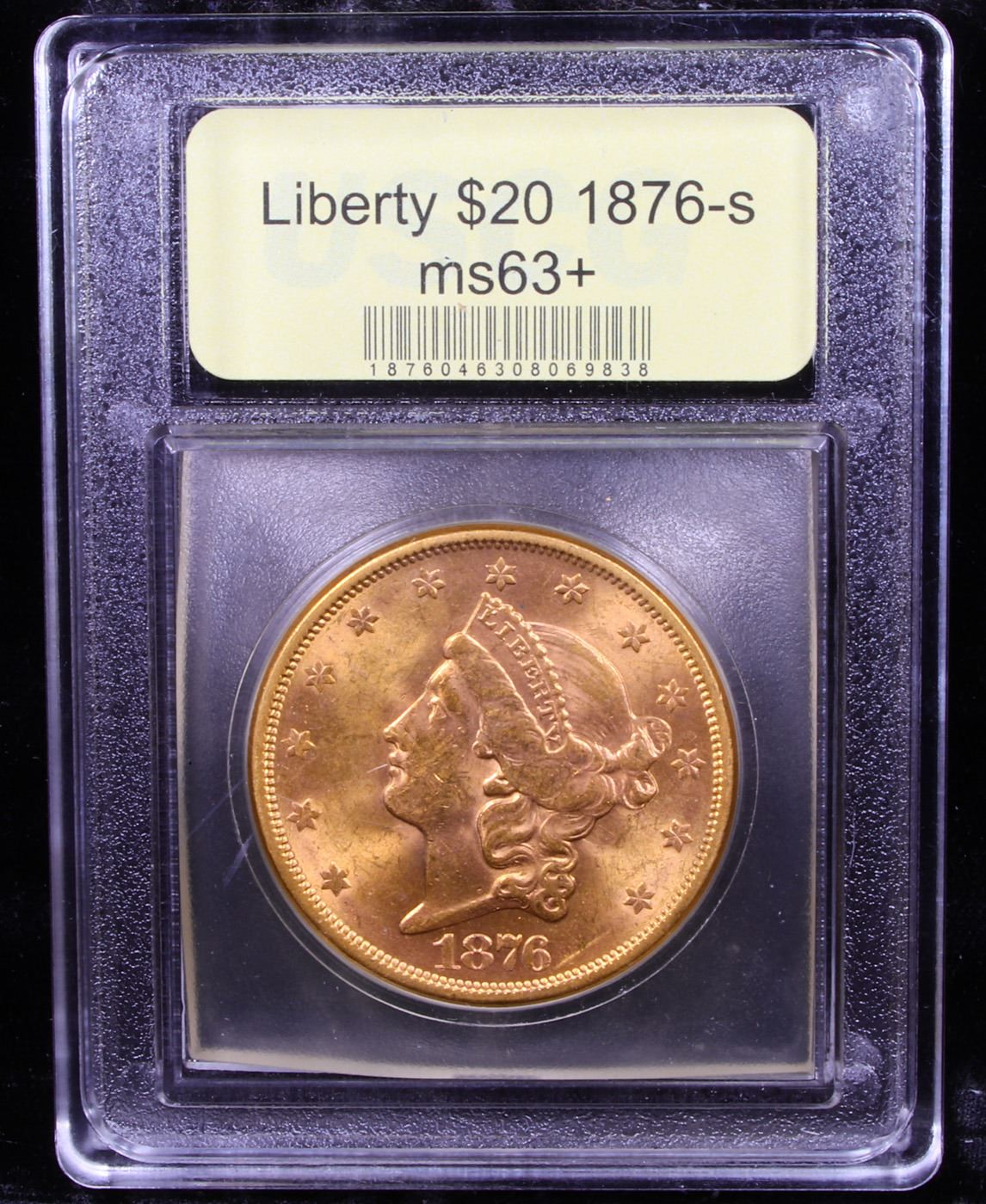 ***Auction Highlight*** 1876-s Gold Liberty Double Eagle $20 Graded Select+ Unc By USCG. The Centennial Exposition, a celebration of American independence observed in Philadelphia, was a nation away from the San Francisco Mint, but the Western facility nonetheless produced a huge number of 1876-S double eagles, nearly 1.6 million pieces. The large total was more likely due to the Comstock Lode in Nevada, which saw its peak production of gold and silver from 1876 through 1878. Besides the Centennial date, the 1876 issues are popular as the last of the Type Two issues, with TWENTY D. on the lower reverse. This MS63+ specimen displays thick frosted mint luster on each side amid orange-gold and interspersed pale lilac patina. The strike is sharp, and no obvious abrasions interrupt the high aesthetic appeal. I have included two examples both other ms63+, for your comparison. A Corey's Pick, Bid to Win, Don't let it get Away, you might not find its equal Coin. I give this coin my highest recommendation