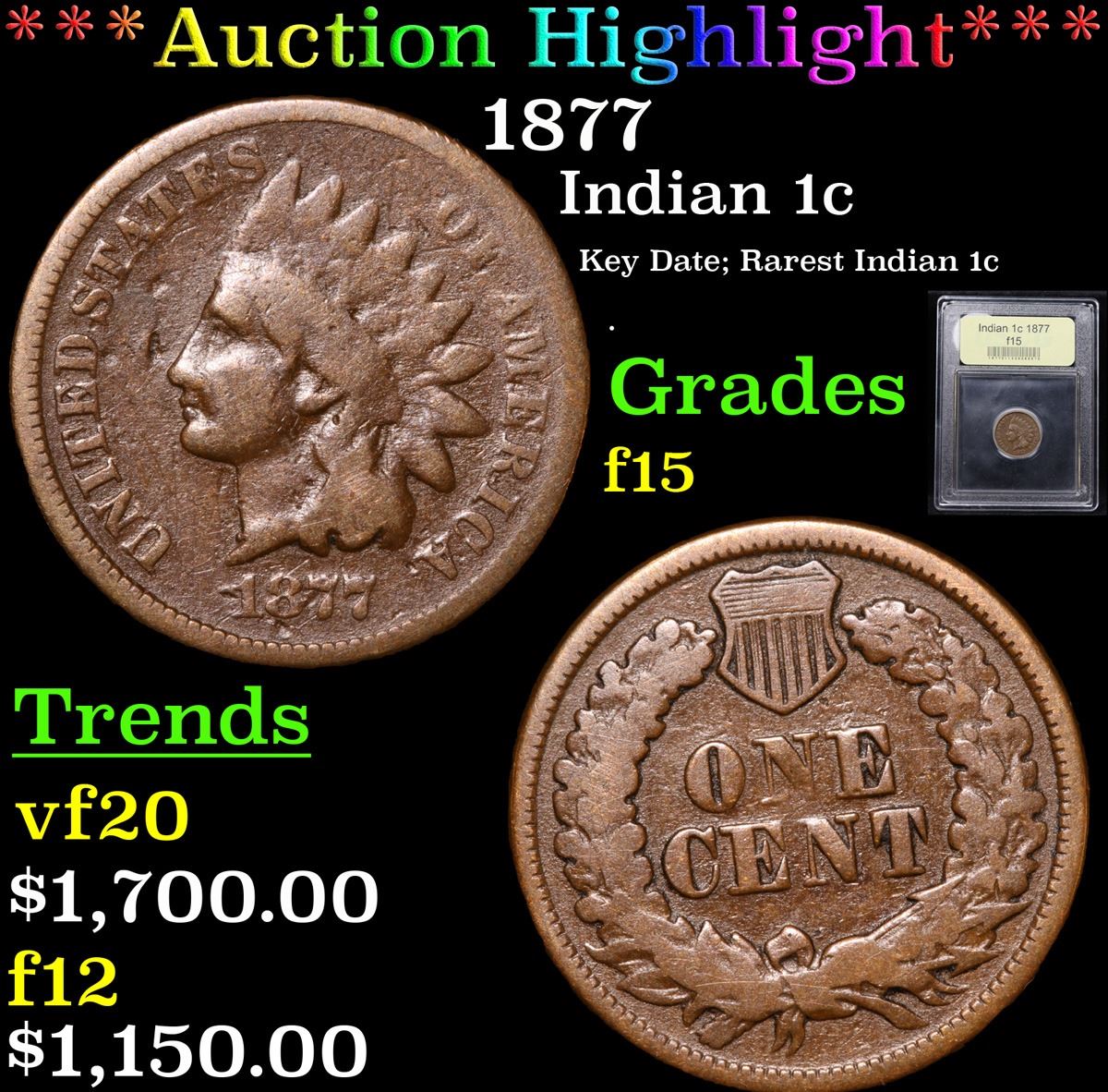 ***Auction Highlight*** 1877 Key Date; Rarest Indian 1c . Indian Cent 1c Graded f+ By USCG. The Key Date to the whole Indian Cent Series. According to Jaime Hernandez from PCGS, ‘The 1877 Indian Cent is unquestionably the most desirable coin in the entire circulation strike Indian Cent series. It is the second lowest mintage coin in the series, and only the 1909-S Indian cent has a lower mintage. Despite the 1877 Indian cent having the second lowest mintage in the series, it also survives in much smaller numbers than the 1909-S Indian cent. This is mainly due to the lack of coins being collected in 1877 compared to 1909. There is only one reverse die confirmed as striking all existing 1877 Indian cents. However, if there was only one reverse die employed to strike all (877,000)1877 Indian cents, then this lone die should have sustained major planchet flaws when striking such a large mintage. Surprisingly, this is not the case since 1877 cents show no traces of a damaged die. Therefore, it is strongly believed that the mintage of 877,000 coins struck, is actually a highly inflated figure. A Corey's Pick, Bid to Win Coin