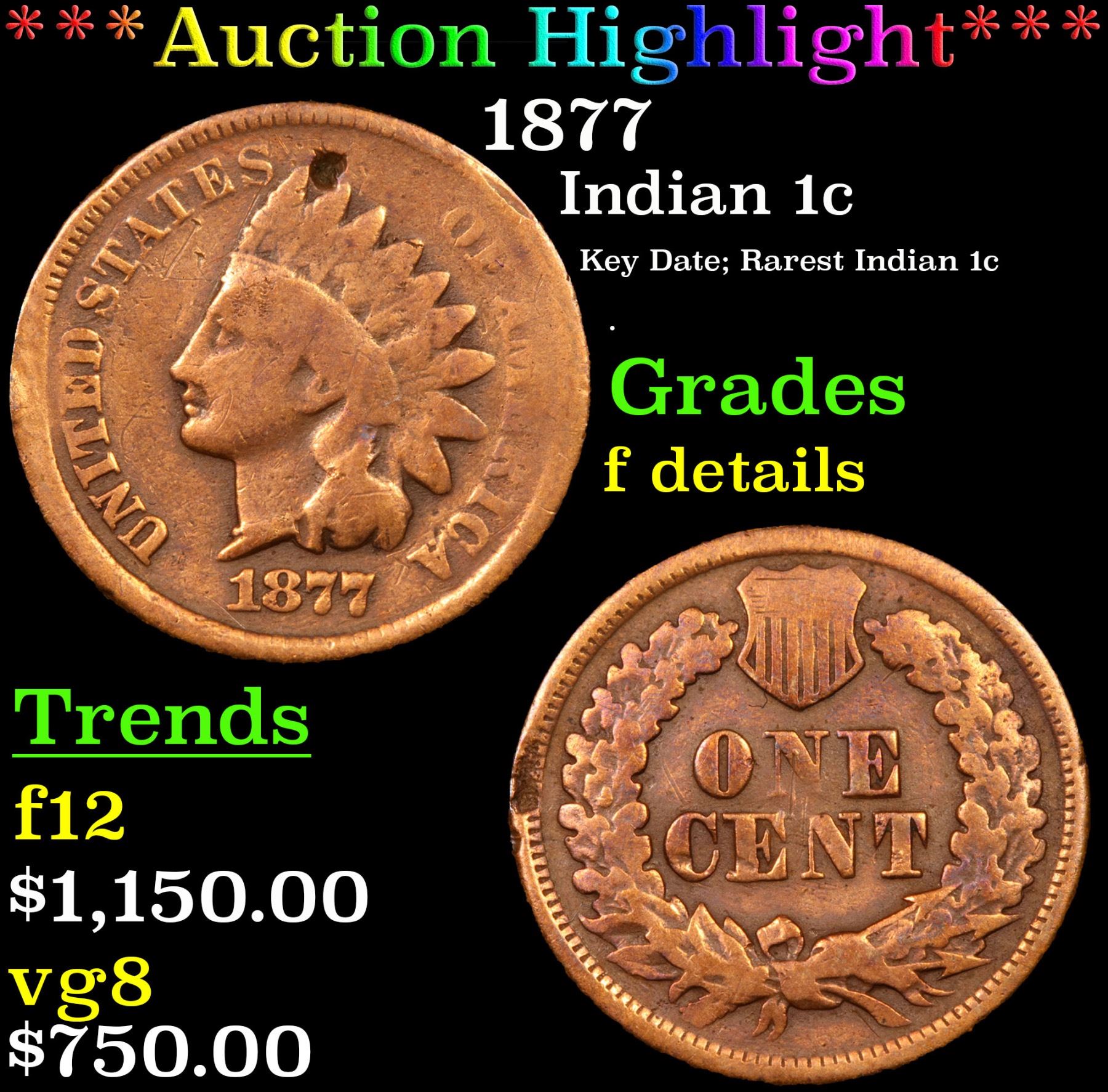 ***Auction Highlight*** 1877 Indian Cent 1c Graded f details By USCG. The Key Date to the whole Indian Cent Series. According to Jaime Hernandez from PCGS, �The 1877 Indian Cent is unquestionably the most desirable coin in the entire circulation strike Indian Cent series. It is the second lowest mintage coin in the series, and only the 1909-S Indian cent has a lower mintage. Despite the 1877 Indian cent having the second lowest mintage in the series, it also survives in much smaller numbers than the 1909-S Indian cent. This is mainly due to the lack of coins being collected in 1877 compared to 1909. There is only one reverse die confirmed as striking all existing 1877 Indian cents. However, if there was only one reverse die employed to strike all (877,000)1877 Indian cents, then this lone die should have sustained major planchet flaws when striking such a large mintage. Surprisingly, this is not the case since 1877 cents show no traces of a damaged die. Therefore, it is strongly believed that the mintage of 877,000 coins struck, is actually a highly inflated figure.