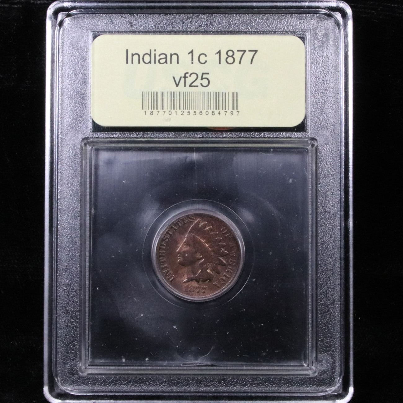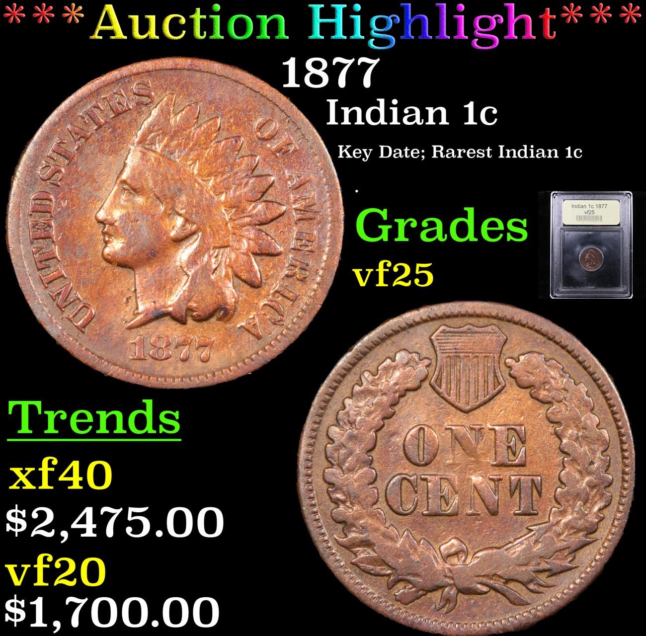 ***Auction Highlight*** 1877 Key Date; Rarest Indian 1c . Indian Cent 1c Graded vf+ By USCG. The Key Date to the whole Indian Cent Series. According to Jaime Hernandez from PCGS, ‘The 1877 Indian Cent is unquestionably the most desirable coin in the entire circulation strike Indian Cent series. It is the second lowest mintage coin in the series, and only the 1909-S Indian cent has a lower mintage. Despite the 1877 Indian cent having the second lowest mintage in the series, it also survives in much smaller numbers than the 1909-S Indian cent. This is mainly due to the lack of coins being collected in 1877 compared to 1909. There is only one reverse die confirmed as striking all existing 1877 Indian cents. However, if there was only one reverse die employed to strike all (877,000)1877 Indian cents, then this lone die should have sustained major planchet flaws when striking such a large mintage. Surprisingly, this is not the case since 1877 cents show no traces of a damaged die. Therefore, it is strongly believed that the mintage of 877,000 coins struck, is actually a highly inflated figure. A Corey's Pick, Bid to Win, Don't let it get Away Coin