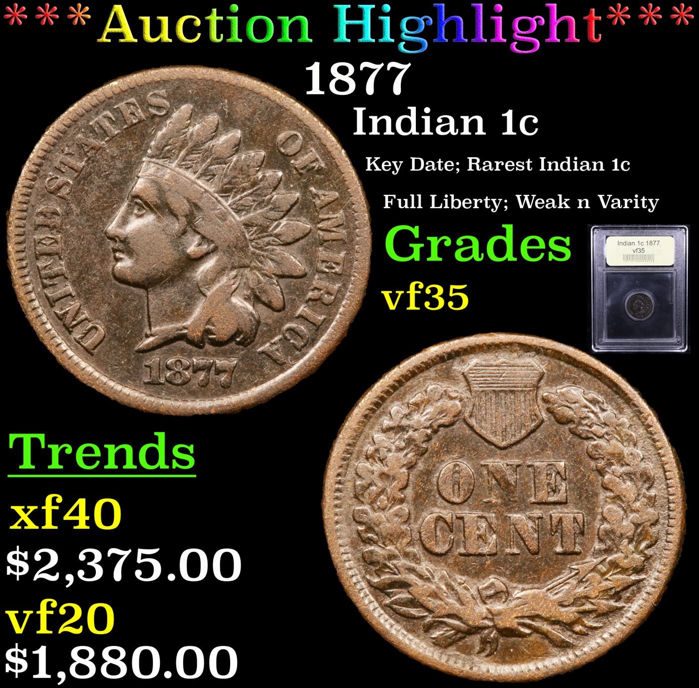 ***Auction Highlight*** 1877 Indian Cent 1c Graded vf++ By USCG. The Key Date to the whole Indian Cent Series. According to Jaime Hernandez from PCGS, ‘The 1877 Indian Cent is unquestionably the most desirable coin in the entire circulation strike Indian Cent series. It is the second lowest mintage coin in the series, and only the 1909-S Indian cent has a lower mintage. Despite the 1877 Indian cent having the second lowest mintage in the series, it also survives in much smaller numbers than the 1909-S Indian cent. This is mainly due to the lack of coins being collected in 1877 compared to 1909. There is only one reverse die confirmed as striking all existing 1877 Indian cents. However, if there was only one reverse die employed to strike all (877,000)1877 Indian cents, then this lone die should have sustained major planchet flaws when striking such a large mintage. Surprisingly, this is not the case since 1877 cents show no traces of a damaged die. Therefore, it is strongly believed that the mintage of 877,000 coins struck, is actually a highly inflated figure. A Corey's Pick, Bid to Win, Don't let it get Away Coin