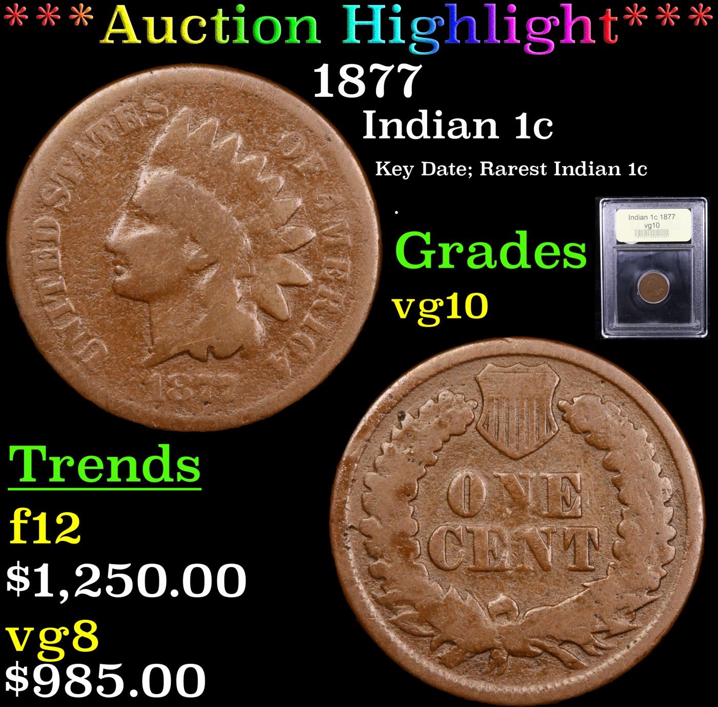 ***Auction Highlight*** 1877 Indian Cent 1c Graded vg+ By USCG. The Key Date to the whole Indian Cent Series. According to Jaime Hernandez from PCGS, ‘The 1877 Indian Cent is unquestionably the most desirable coin in the entire circulation strike Indian Cent series. It is the second lowest mintage coin in the series, and only the 1909-S Indian cent has a lower mintage. Despite the 1877 Indian cent having the second lowest mintage in the series, it also survives in much smaller numbers than the 1909-S Indian cent. This is mainly due to the lack of coins being collected in 1877 compared to 1909. There is only one reverse die confirmed as striking all existing 1877 Indian cents. However, if there was only one reverse die employed to strike all (877,000)1877 Indian cents, then this lone die should have sustained major planchet flaws when striking such a large mintage. Surprisingly, this is not the case since 1877 cents show no traces of a damaged die. Therefore, it is strongly believed that the mintage of 877,000 coins struck, is actually a highly inflated figure. A Corey's Pick, Bid to Win Coin